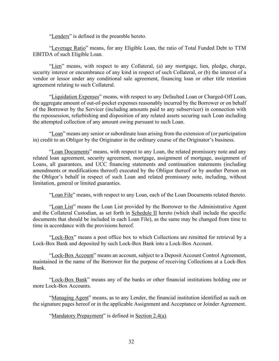 32 “Lenders” is defined in the preamble hereto. “Leverage Ratio” means, for any Eligible Loan, the ratio of Total Funded Debt to TTM EBITDA of such Eligible Loan. “Lien” means, with respect to any Collateral, (a) any mortgage, lien, pledge, charge, security interest or encumbrance of any kind in respect of such Collateral, or (b) the interest of a vendor or lessor under any conditional sale agreement, financing loan or other title retention agreement relating to such Collateral. “Liquidation Expenses” means, with respect to any Defaulted Loan or Charged-Off Loan, the aggregate amount of out-of-pocket expenses reasonably incurred by the Borrower or on behalf of the Borrower by the Servicer (including amounts paid to any subservicer) in connection with the repossession, refurbishing and disposition of any related assets securing such Loan including the attempted collection of any amount owing pursuant to such Loan. “Loan” means any senior or subordinate loan arising from the extension of (or participation in) credit to an Obligor by the Originator in the ordinary course of the Originator’s business. “Loan Documents” means, with respect to any Loan, the related promissory note and any related loan agreement, security agreement, mortgage, assignment of mortgage, assignment of Loans, all guarantees, and UCC financing statements and continuation statements (including amendments or modifications thereof) executed by the Obligor thereof or by another Person on the Obligor’s behalf in respect of such Loan and related promissory note, including, without limitation, general or limited guaranties. “Loan File” means, with respect to any Loan, each of the Loan Documents related thereto. “Loan List” means the Loan List provided by the Borrower to the Administrative Agent and the Collateral Custodian, as set forth in Schedule II hereto (which shall include the specific documents that should be included in each Loan File), as the same may be changed from time to time in accordance with the provisions hereof. “Lock-Box” means a post office box to which Collections are remitted for retrieval by a Lock-Box Bank and deposited by such Lock-Box Bank into a Lock-Box Account. “Lock-Box Account” means an account, subject to a Deposit Account Control Agreement, maintained in the name of the Borrower for the purpose of receiving Collections at a Lock-Box Bank. “Lock-Box Bank” means any of the banks or other financial institutions holding one or more Lock-Box Accounts. “Managing Agent” means, as to any Lender, the financial institution identified as such on the signature pages hereof or in the applicable Assignment and Acceptance or Joinder Agreement. “Mandatory Prepayment” is defined in Section 2.4(a).