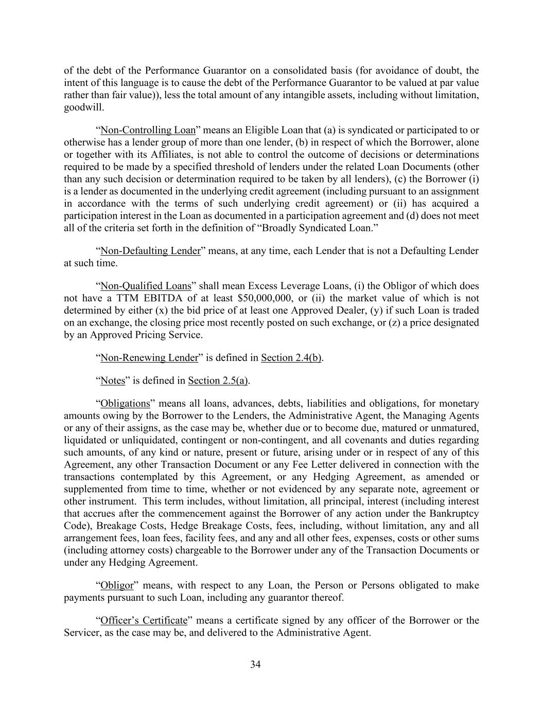 34 of the debt of the Performance Guarantor on a consolidated basis (for avoidance of doubt, the intent of this language is to cause the debt of the Performance Guarantor to be valued at par value rather than fair value)), less the total amount of any intangible assets, including without limitation, goodwill. “Non-Controlling Loan” means an Eligible Loan that (a) is syndicated or participated to or otherwise has a lender group of more than one lender, (b) in respect of which the Borrower, alone or together with its Affiliates, is not able to control the outcome of decisions or determinations required to be made by a specified threshold of lenders under the related Loan Documents (other than any such decision or determination required to be taken by all lenders), (c) the Borrower (i) is a lender as documented in the underlying credit agreement (including pursuant to an assignment in accordance with the terms of such underlying credit agreement) or (ii) has acquired a participation interest in the Loan as documented in a participation agreement and (d) does not meet all of the criteria set forth in the definition of “Broadly Syndicated Loan.” “Non-Defaulting Lender” means, at any time, each Lender that is not a Defaulting Lender at such time. “Non-Qualified Loans” shall mean Excess Leverage Loans, (i) the Obligor of which does not have a TTM EBITDA of at least $50,000,000, or (ii) the market value of which is not determined by either (x) the bid price of at least one Approved Dealer, (y) if such Loan is traded on an exchange, the closing price most recently posted on such exchange, or (z) a price designated by an Approved Pricing Service. “Non-Renewing Lender” is defined in Section 2.4(b). “Notes” is defined in Section 2.5(a). “Obligations” means all loans, advances, debts, liabilities and obligations, for monetary amounts owing by the Borrower to the Lenders, the Administrative Agent, the Managing Agents or any of their assigns, as the case may be, whether due or to become due, matured or unmatured, liquidated or unliquidated, contingent or non-contingent, and all covenants and duties regarding such amounts, of any kind or nature, present or future, arising under or in respect of any of this Agreement, any other Transaction Document or any Fee Letter delivered in connection with the transactions contemplated by this Agreement, or any Hedging Agreement, as amended or supplemented from time to time, whether or not evidenced by any separate note, agreement or other instrument. This term includes, without limitation, all principal, interest (including interest that accrues after the commencement against the Borrower of any action under the Bankruptcy Code), Breakage Costs, Hedge Breakage Costs, fees, including, without limitation, any and all arrangement fees, loan fees, facility fees, and any and all other fees, expenses, costs or other sums (including attorney costs) chargeable to the Borrower under any of the Transaction Documents or under any Hedging Agreement. “Obligor” means, with respect to any Loan, the Person or Persons obligated to make payments pursuant to such Loan, including any guarantor thereof. “Officer’s Certificate” means a certificate signed by any officer of the Borrower or the Servicer, as the case may be, and delivered to the Administrative Agent.