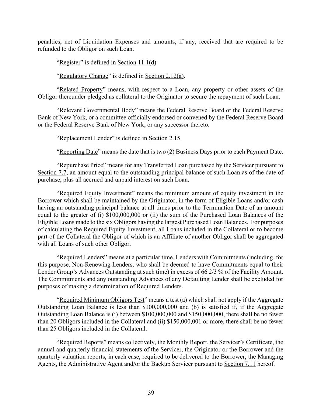 39 penalties, net of Liquidation Expenses and amounts, if any, received that are required to be refunded to the Obligor on such Loan. “Register” is defined in Section 11.1(d). “Regulatory Change” is defined in Section 2.12(a). “Related Property” means, with respect to a Loan, any property or other assets of the Obligor thereunder pledged as collateral to the Originator to secure the repayment of such Loan. “Relevant Governmental Body” means the Federal Reserve Board or the Federal Reserve Bank of New York, or a committee officially endorsed or convened by the Federal Reserve Board or the Federal Reserve Bank of New York, or any successor thereto. “Replacement Lender” is defined in Section 2.15. “Reporting Date” means the date that is two (2) Business Days prior to each Payment Date. “Repurchase Price” means for any Transferred Loan purchased by the Servicer pursuant to Section 7.7, an amount equal to the outstanding principal balance of such Loan as of the date of purchase, plus all accrued and unpaid interest on such Loan. “Required Equity Investment” means the minimum amount of equity investment in the Borrower which shall be maintained by the Originator, in the form of Eligible Loans and/or cash having an outstanding principal balance at all times prior to the Termination Date of an amount equal to the greater of (i) $100,000,000 or (ii) the sum of the Purchased Loan Balances of the Eligible Loans made to the six Obligors having the largest Purchased Loan Balances. For purposes of calculating the Required Equity Investment, all Loans included in the Collateral or to become part of the Collateral the Obligor of which is an Affiliate of another Obligor shall be aggregated with all Loans of such other Obligor. “Required Lenders” means at a particular time, Lenders with Commitments (including, for this purpose, Non-Renewing Lenders, who shall be deemed to have Commitments equal to their Lender Group’s Advances Outstanding at such time) in excess of 66 2/3 % of the Facility Amount. The Commitments and any outstanding Advances of any Defaulting Lender shall be excluded for purposes of making a determination of Required Lenders. “Required Minimum Obligors Test” means a test (a) which shall not apply if the Aggregate Outstanding Loan Balance is less than $100,000,000 and (b) is satisfied if, if the Aggregate Outstanding Loan Balance is (i) between $100,000,000 and $150,000,000, there shall be no fewer than 20 Obligors included in the Collateral and (ii) $150,000,001 or more, there shall be no fewer than 25 Obligors included in the Collateral. “Required Reports” means collectively, the Monthly Report, the Servicer’s Certificate, the annual and quarterly financial statements of the Servicer, the Originator or the Borrower and the quarterly valuation reports, in each case, required to be delivered to the Borrower, the Managing Agents, the Administrative Agent and/or the Backup Servicer pursuant to Section 7.11 hereof.