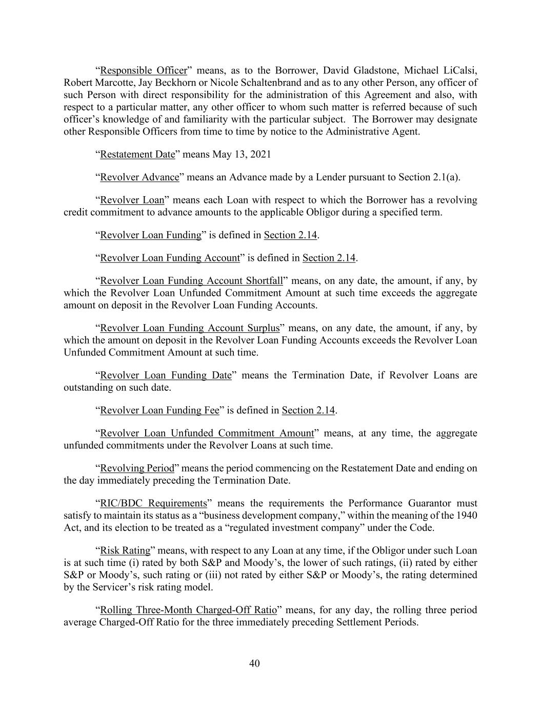 40 “Responsible Officer” means, as to the Borrower, David Gladstone, Michael LiCalsi, Robert Marcotte, Jay Beckhorn or Nicole Schaltenbrand and as to any other Person, any officer of such Person with direct responsibility for the administration of this Agreement and also, with respect to a particular matter, any other officer to whom such matter is referred because of such officer’s knowledge of and familiarity with the particular subject. The Borrower may designate other Responsible Officers from time to time by notice to the Administrative Agent. “Restatement Date” means May 13, 2021 “Revolver Advance” means an Advance made by a Lender pursuant to Section 2.1(a). “Revolver Loan” means each Loan with respect to which the Borrower has a revolving credit commitment to advance amounts to the applicable Obligor during a specified term. “Revolver Loan Funding” is defined in Section 2.14. “Revolver Loan Funding Account” is defined in Section 2.14. “Revolver Loan Funding Account Shortfall” means, on any date, the amount, if any, by which the Revolver Loan Unfunded Commitment Amount at such time exceeds the aggregate amount on deposit in the Revolver Loan Funding Accounts. “Revolver Loan Funding Account Surplus” means, on any date, the amount, if any, by which the amount on deposit in the Revolver Loan Funding Accounts exceeds the Revolver Loan Unfunded Commitment Amount at such time. “Revolver Loan Funding Date” means the Termination Date, if Revolver Loans are outstanding on such date. “Revolver Loan Funding Fee” is defined in Section 2.14. “Revolver Loan Unfunded Commitment Amount” means, at any time, the aggregate unfunded commitments under the Revolver Loans at such time. “Revolving Period” means the period commencing on the Restatement Date and ending on the day immediately preceding the Termination Date. “RIC/BDC Requirements” means the requirements the Performance Guarantor must satisfy to maintain its status as a “business development company,” within the meaning of the 1940 Act, and its election to be treated as a “regulated investment company” under the Code. “Risk Rating” means, with respect to any Loan at any time, if the Obligor under such Loan is at such time (i) rated by both S&P and Moody’s, the lower of such ratings, (ii) rated by either S&P or Moody’s, such rating or (iii) not rated by either S&P or Moody’s, the rating determined by the Servicer’s risk rating model. “Rolling Three-Month Charged-Off Ratio” means, for any day, the rolling three period average Charged-Off Ratio for the three immediately preceding Settlement Periods.