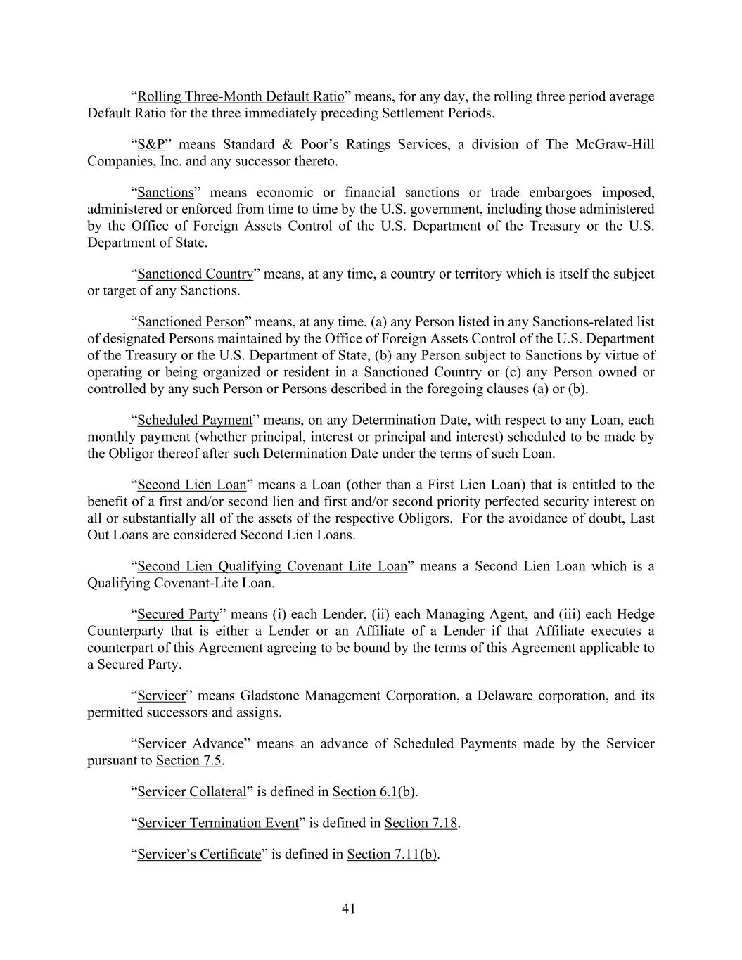 41 “Rolling Three-Month Default Ratio” means, for any day, the rolling three period average Default Ratio for the three immediately preceding Settlement Periods. “S&P” means Standard & Poor’s Ratings Services, a division of The McGraw-Hill Companies, Inc. and any successor thereto. “Sanctions” means economic or financial sanctions or trade embargoes imposed, administered or enforced from time to time by the U.S. government, including those administered by the Office of Foreign Assets Control of the U.S. Department of the Treasury or the U.S. Department of State. “Sanctioned Country” means, at any time, a country or territory which is itself the subject or target of any Sanctions. “Sanctioned Person” means, at any time, (a) any Person listed in any Sanctions-related list of designated Persons maintained by the Office of Foreign Assets Control of the U.S. Department of the Treasury or the U.S. Department of State, (b) any Person subject to Sanctions by virtue of operating or being organized or resident in a Sanctioned Country or (c) any Person owned or controlled by any such Person or Persons described in the foregoing clauses (a) or (b). “Scheduled Payment” means, on any Determination Date, with respect to any Loan, each monthly payment (whether principal, interest or principal and interest) scheduled to be made by the Obligor thereof after such Determination Date under the terms of such Loan. “Second Lien Loan” means a Loan (other than a First Lien Loan) that is entitled to the benefit of a first and/or second lien and first and/or second priority perfected security interest on all or substantially all of the assets of the respective Obligors. For the avoidance of doubt, Last Out Loans are considered Second Lien Loans. “Second Lien Qualifying Covenant Lite Loan” means a Second Lien Loan which is a Qualifying Covenant-Lite Loan. “Secured Party” means (i) each Lender, (ii) each Managing Agent, and (iii) each Hedge Counterparty that is either a Lender or an Affiliate of a Lender if that Affiliate executes a counterpart of this Agreement agreeing to be bound by the terms of this Agreement applicable to a Secured Party. “Servicer” means Gladstone Management Corporation, a Delaware corporation, and its permitted successors and assigns. “Servicer Advance” means an advance of Scheduled Payments made by the Servicer pursuant to Section 7.5. “Servicer Collateral” is defined in Section 6.1(b). “Servicer Termination Event” is defined in Section 7.18. “Servicer’s Certificate” is defined in Section 7.11(b).