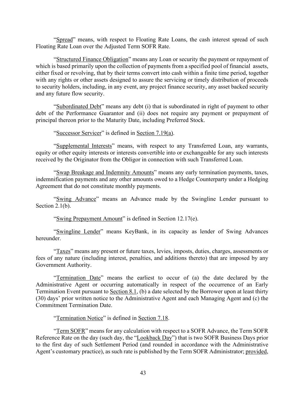 43 “Spread” means, with respect to Floating Rate Loans, the cash interest spread of such Floating Rate Loan over the Adjusted Term SOFR Rate. “Structured Finance Obligation” means any Loan or security the payment or repayment of which is based primarily upon the collection of payments from a specified pool of financial assets, either fixed or revolving, that by their terms convert into cash within a finite time period, together with any rights or other assets designed to assure the servicing or timely distribution of proceeds to security holders, including, in any event, any project finance security, any asset backed security and any future flow security. “Subordinated Debt” means any debt (i) that is subordinated in right of payment to other debt of the Performance Guarantor and (ii) does not require any payment or prepayment of principal thereon prior to the Maturity Date, including Preferred Stock. “Successor Servicer” is defined in Section 7.19(a). “Supplemental Interests” means, with respect to any Transferred Loan, any warrants, equity or other equity interests or interests convertible into or exchangeable for any such interests received by the Originator from the Obligor in connection with such Transferred Loan. “Swap Breakage and Indemnity Amounts” means any early termination payments, taxes, indemnification payments and any other amounts owed to a Hedge Counterparty under a Hedging Agreement that do not constitute monthly payments. “Swing Advance” means an Advance made by the Swingline Lender pursuant to Section 2.1(b). “Swing Prepayment Amount” is defined in Section 12.17(e). “Swingline Lender” means KeyBank, in its capacity as lender of Swing Advances hereunder. “Taxes” means any present or future taxes, levies, imposts, duties, charges, assessments or fees of any nature (including interest, penalties, and additions thereto) that are imposed by any Government Authority. “Termination Date” means the earliest to occur of (a) the date declared by the Administrative Agent or occurring automatically in respect of the occurrence of an Early Termination Event pursuant to Section 8.1, (b) a date selected by the Borrower upon at least thirty (30) days’ prior written notice to the Administrative Agent and each Managing Agent and (c) the Commitment Termination Date. “Termination Notice” is defined in Section 7.18. “Term SOFR” means for any calculation with respect to a SOFR Advance, the Term SOFR Reference Rate on the day (such day, the “Lookback Day”) that is two SOFR Business Days prior to the first day of such Settlement Period (and rounded in accordance with the Administrative Agent’s customary practice), as such rate is published by the Term SOFR Administrator; provided,