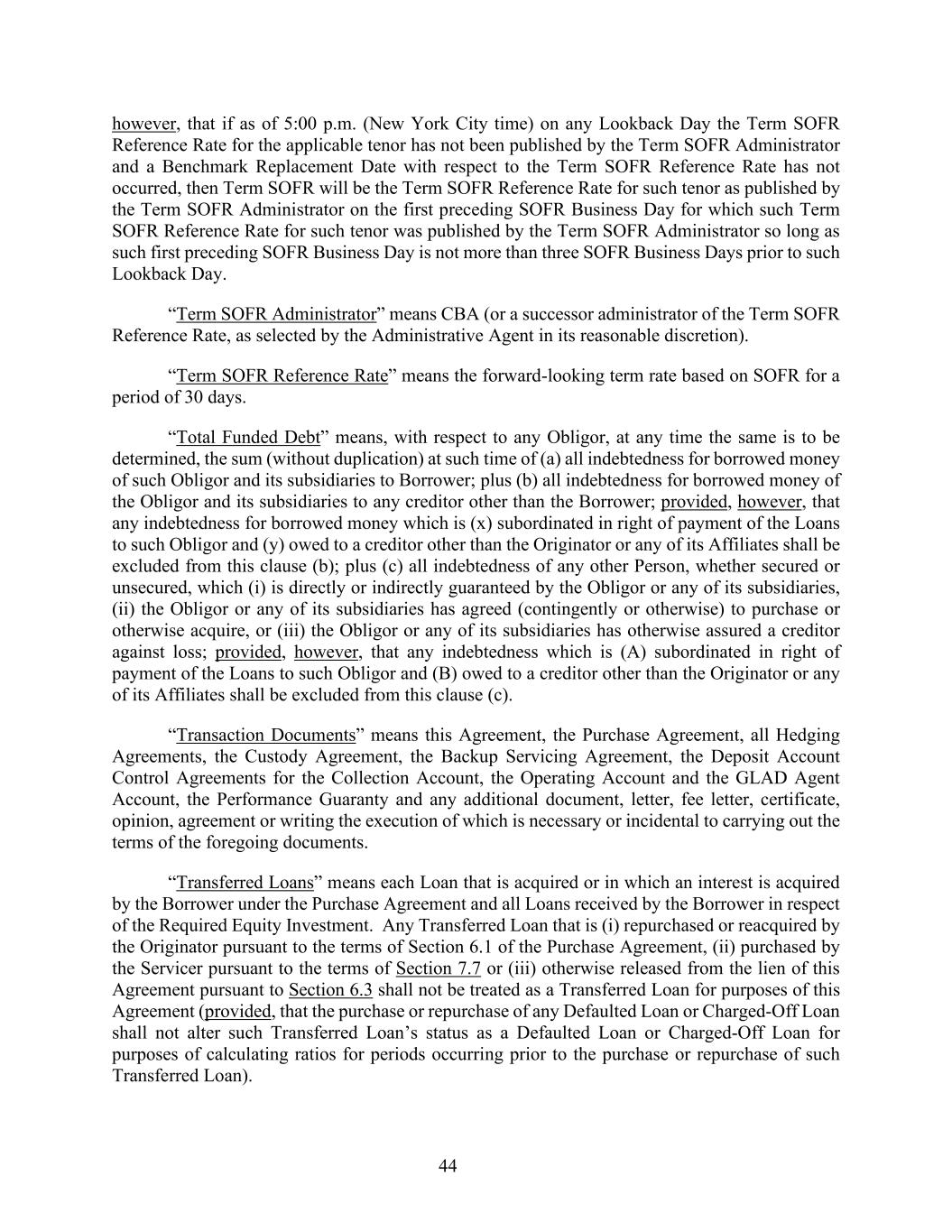 44 however, that if as of 5:00 p.m. (New York City time) on any Lookback Day the Term SOFR Reference Rate for the applicable tenor has not been published by the Term SOFR Administrator and a Benchmark Replacement Date with respect to the Term SOFR Reference Rate has not occurred, then Term SOFR will be the Term SOFR Reference Rate for such tenor as published by the Term SOFR Administrator on the first preceding SOFR Business Day for which such Term SOFR Reference Rate for such tenor was published by the Term SOFR Administrator so long as such first preceding SOFR Business Day is not more than three SOFR Business Days prior to such Lookback Day. “Term SOFR Administrator” means CBA (or a successor administrator of the Term SOFR Reference Rate, as selected by the Administrative Agent in its reasonable discretion). “Term SOFR Reference Rate” means the forward-looking term rate based on SOFR for a period of 30 days. “Total Funded Debt” means, with respect to any Obligor, at any time the same is to be determined, the sum (without duplication) at such time of (a) all indebtedness for borrowed money of such Obligor and its subsidiaries to Borrower; plus (b) all indebtedness for borrowed money of the Obligor and its subsidiaries to any creditor other than the Borrower; provided, however, that any indebtedness for borrowed money which is (x) subordinated in right of payment of the Loans to such Obligor and (y) owed to a creditor other than the Originator or any of its Affiliates shall be excluded from this clause (b); plus (c) all indebtedness of any other Person, whether secured or unsecured, which (i) is directly or indirectly guaranteed by the Obligor or any of its subsidiaries, (ii) the Obligor or any of its subsidiaries has agreed (contingently or otherwise) to purchase or otherwise acquire, or (iii) the Obligor or any of its subsidiaries has otherwise assured a creditor against loss; provided, however, that any indebtedness which is (A) subordinated in right of payment of the Loans to such Obligor and (B) owed to a creditor other than the Originator or any of its Affiliates shall be excluded from this clause (c). “Transaction Documents” means this Agreement, the Purchase Agreement, all Hedging Agreements, the Custody Agreement, the Backup Servicing Agreement, the Deposit Account Control Agreements for the Collection Account, the Operating Account and the GLAD Agent Account, the Performance Guaranty and any additional document, letter, fee letter, certificate, opinion, agreement or writing the execution of which is necessary or incidental to carrying out the terms of the foregoing documents. “Transferred Loans” means each Loan that is acquired or in which an interest is acquired by the Borrower under the Purchase Agreement and all Loans received by the Borrower in respect of the Required Equity Investment. Any Transferred Loan that is (i) repurchased or reacquired by the Originator pursuant to the terms of Section 6.1 of the Purchase Agreement, (ii) purchased by the Servicer pursuant to the terms of Section 7.7 or (iii) otherwise released from the lien of this Agreement pursuant to Section 6.3 shall not be treated as a Transferred Loan for purposes of this Agreement (provided, that the purchase or repurchase of any Defaulted Loan or Charged-Off Loan shall not alter such Transferred Loan’s status as a Defaulted Loan or Charged-Off Loan for purposes of calculating ratios for periods occurring prior to the purchase or repurchase of such Transferred Loan).