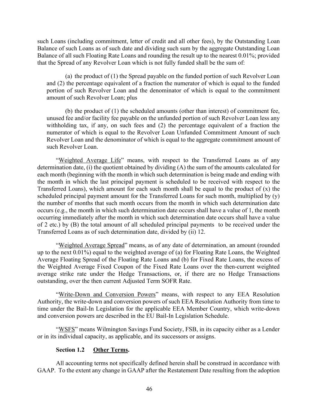 46 such Loans (including commitment, letter of credit and all other fees), by the Outstanding Loan Balance of such Loans as of such date and dividing such sum by the aggregate Outstanding Loan Balance of all such Floating Rate Loans and rounding the result up to the nearest 0.01%; provided that the Spread of any Revolver Loan which is not fully funded shall be the sum of: (a) the product of (1) the Spread payable on the funded portion of such Revolver Loan and (2) the percentage equivalent of a fraction the numerator of which is equal to the funded portion of such Revolver Loan and the denominator of which is equal to the commitment amount of such Revolver Loan; plus (b) the product of (1) the scheduled amounts (other than interest) of commitment fee, unused fee and/or facility fee payable on the unfunded portion of such Revolver Loan less any withholding tax, if any, on such fees and (2) the percentage equivalent of a fraction the numerator of which is equal to the Revolver Loan Unfunded Commitment Amount of such Revolver Loan and the denominator of which is equal to the aggregate commitment amount of such Revolver Loan. “Weighted Average Life” means, with respect to the Transferred Loans as of any determination date, (i) the quotient obtained by dividing (A) the sum of the amounts calculated for each month (beginning with the month in which such determination is being made and ending with the month in which the last principal payment is scheduled to be received with respect to the Transferred Loans), which amount for each such month shall be equal to the product of (x) the scheduled principal payment amount for the Transferred Loans for such month, multiplied by (y) the number of months that such month occurs from the month in which such determination date occurs (e.g., the month in which such determination date occurs shall have a value of 1, the month occurring immediately after the month in which such determination date occurs shall have a value of 2 etc.) by (B) the total amount of all scheduled principal payments to be received under the Transferred Loans as of such determination date, divided by (ii) 12. “Weighted Average Spread” means, as of any date of determination, an amount (rounded up to the next 0.01%) equal to the weighted average of (a) for Floating Rate Loans, the Weighted Average Floating Spread of the Floating Rate Loans and (b) for Fixed Rate Loans, the excess of the Weighted Average Fixed Coupon of the Fixed Rate Loans over the then-current weighted average strike rate under the Hedge Transactions, or, if there are no Hedge Transactions outstanding, over the then current Adjusted Term SOFR Rate. “Write-Down and Conversion Powers” means, with respect to any EEA Resolution Authority, the write-down and conversion powers of such EEA Resolution Authority from time to time under the Bail-In Legislation for the applicable EEA Member Country, which write-down and conversion powers are described in the EU Bail-In Legislation Schedule. “WSFS” means Wilmington Savings Fund Society, FSB, in its capacity either as a Lender or in its individual capacity, as applicable, and its successors or assigns. Section 1.2 Other Terms. All accounting terms not specifically defined herein shall be construed in accordance with GAAP. To the extent any change in GAAP after the Restatement Date resulting from the adoption