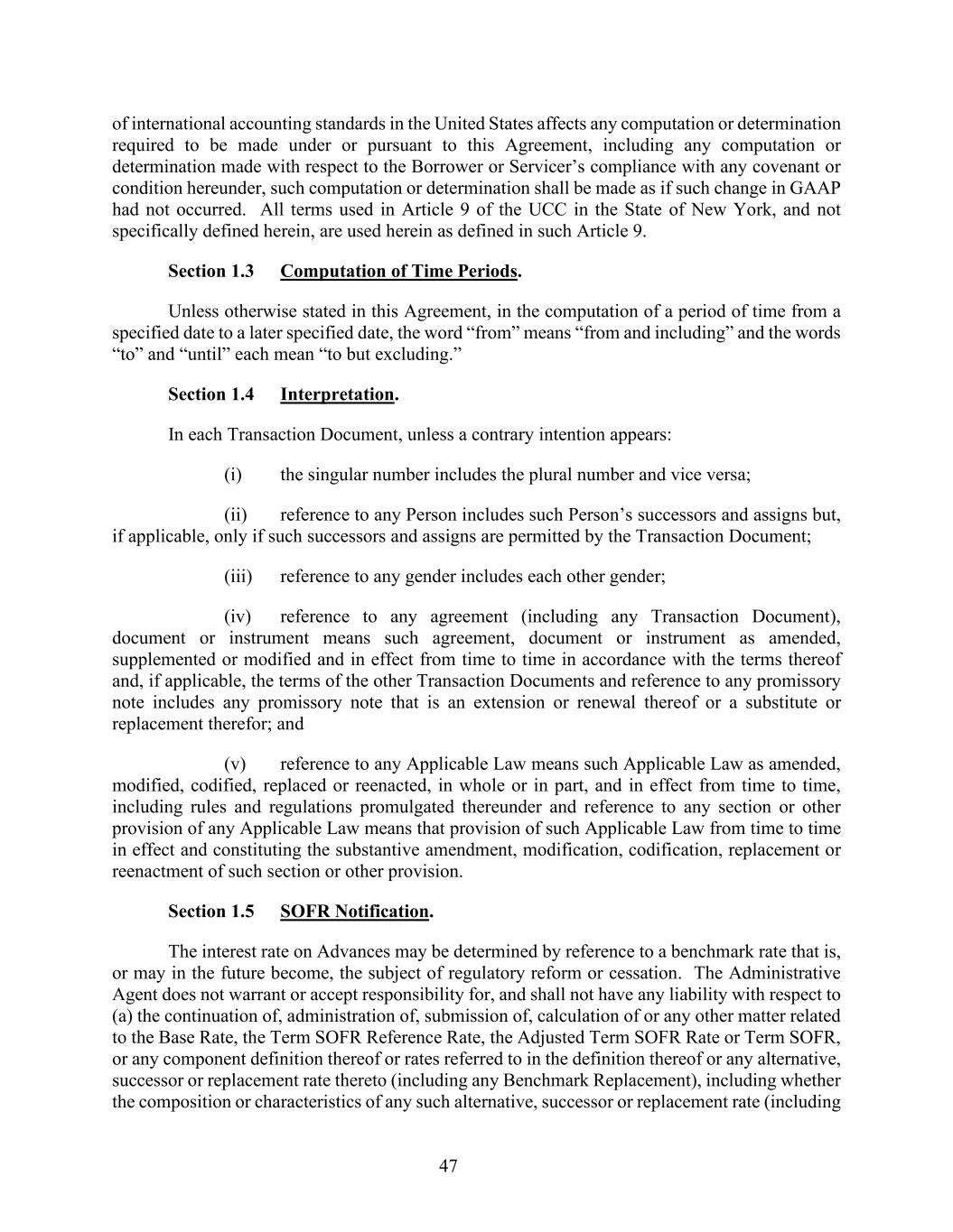 47 of international accounting standards in the United States affects any computation or determination required to be made under or pursuant to this Agreement, including any computation or determination made with respect to the Borrower or Servicer’s compliance with any covenant or condition hereunder, such computation or determination shall be made as if such change in GAAP had not occurred. All terms used in Article 9 of the UCC in the State of New York, and not specifically defined herein, are used herein as defined in such Article 9. Section 1.3 Computation of Time Periods. Unless otherwise stated in this Agreement, in the computation of a period of time from a specified date to a later specified date, the word “from” means “from and including” and the words “to” and “until” each mean “to but excluding.” Section 1.4 Interpretation. In each Transaction Document, unless a contrary intention appears: (i) the singular number includes the plural number and vice versa; (ii) reference to any Person includes such Person’s successors and assigns but, if applicable, only if such successors and assigns are permitted by the Transaction Document; (iii) reference to any gender includes each other gender; (iv) reference to any agreement (including any Transaction Document), document or instrument means such agreement, document or instrument as amended, supplemented or modified and in effect from time to time in accordance with the terms thereof and, if applicable, the terms of the other Transaction Documents and reference to any promissory note includes any promissory note that is an extension or renewal thereof or a substitute or replacement therefor; and (v) reference to any Applicable Law means such Applicable Law as amended, modified, codified, replaced or reenacted, in whole or in part, and in effect from time to time, including rules and regulations promulgated thereunder and reference to any section or other provision of any Applicable Law means that provision of such Applicable Law from time to time in effect and constituting the substantive amendment, modification, codification, replacement or reenactment of such section or other provision. Section 1.5 SOFR Notification. The interest rate on Advances may be determined by reference to a benchmark rate that is, or may in the future become, the subject of regulatory reform or cessation. The Administrative Agent does not warrant or accept responsibility for, and shall not have any liability with respect to (a) the continuation of, administration of, submission of, calculation of or any other matter related to the Base Rate, the Term SOFR Reference Rate, the Adjusted Term SOFR Rate or Term SOFR, or any component definition thereof or rates referred to in the definition thereof or any alternative, successor or replacement rate thereto (including any Benchmark Replacement), including whether the composition or characteristics of any such alternative, successor or replacement rate (including