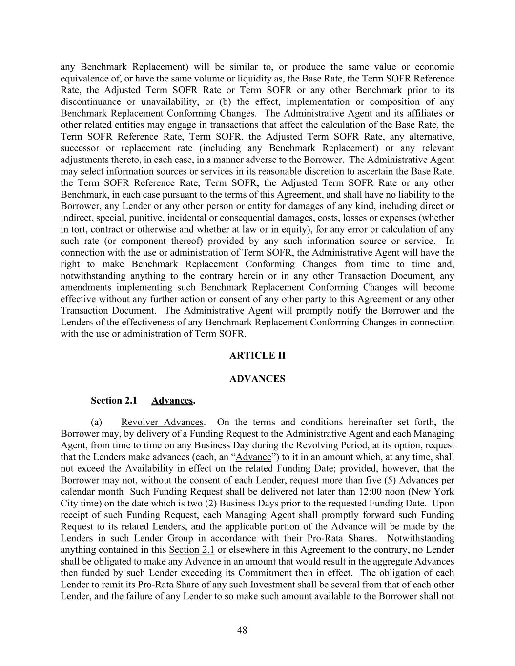 48 any Benchmark Replacement) will be similar to, or produce the same value or economic equivalence of, or have the same volume or liquidity as, the Base Rate, the Term SOFR Reference Rate, the Adjusted Term SOFR Rate or Term SOFR or any other Benchmark prior to its discontinuance or unavailability, or (b) the effect, implementation or composition of any Benchmark Replacement Conforming Changes. The Administrative Agent and its affiliates or other related entities may engage in transactions that affect the calculation of the Base Rate, the Term SOFR Reference Rate, Term SOFR, the Adjusted Term SOFR Rate, any alternative, successor or replacement rate (including any Benchmark Replacement) or any relevant adjustments thereto, in each case, in a manner adverse to the Borrower. The Administrative Agent may select information sources or services in its reasonable discretion to ascertain the Base Rate, the Term SOFR Reference Rate, Term SOFR, the Adjusted Term SOFR Rate or any other Benchmark, in each case pursuant to the terms of this Agreement, and shall have no liability to the Borrower, any Lender or any other person or entity for damages of any kind, including direct or indirect, special, punitive, incidental or consequential damages, costs, losses or expenses (whether in tort, contract or otherwise and whether at law or in equity), for any error or calculation of any such rate (or component thereof) provided by any such information source or service. In connection with the use or administration of Term SOFR, the Administrative Agent will have the right to make Benchmark Replacement Conforming Changes from time to time and, notwithstanding anything to the contrary herein or in any other Transaction Document, any amendments implementing such Benchmark Replacement Conforming Changes will become effective without any further action or consent of any other party to this Agreement or any other Transaction Document. The Administrative Agent will promptly notify the Borrower and the Lenders of the effectiveness of any Benchmark Replacement Conforming Changes in connection with the use or administration of Term SOFR. ARTICLE II ADVANCES Section 2.1 Advances. (a) Revolver Advances. On the terms and conditions hereinafter set forth, the Borrower may, by delivery of a Funding Request to the Administrative Agent and each Managing Agent, from time to time on any Business Day during the Revolving Period, at its option, request that the Lenders make advances (each, an “Advance”) to it in an amount which, at any time, shall not exceed the Availability in effect on the related Funding Date; provided, however, that the Borrower may not, without the consent of each Lender, request more than five (5) Advances per calendar month Such Funding Request shall be delivered not later than 12:00 noon (New York City time) on the date which is two (2) Business Days prior to the requested Funding Date. Upon receipt of such Funding Request, each Managing Agent shall promptly forward such Funding Request to its related Lenders, and the applicable portion of the Advance will be made by the Lenders in such Lender Group in accordance with their Pro-Rata Shares. Notwithstanding anything contained in this Section 2.1 or elsewhere in this Agreement to the contrary, no Lender shall be obligated to make any Advance in an amount that would result in the aggregate Advances then funded by such Lender exceeding its Commitment then in effect. The obligation of each Lender to remit its Pro-Rata Share of any such Investment shall be several from that of each other Lender, and the failure of any Lender to so make such amount available to the Borrower shall not