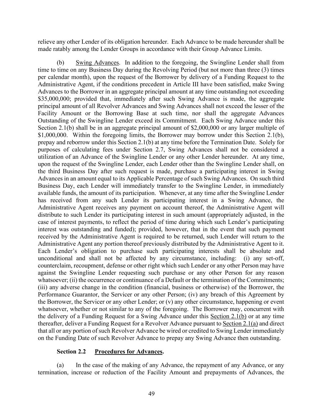 49 relieve any other Lender of its obligation hereunder. Each Advance to be made hereunder shall be made ratably among the Lender Groups in accordance with their Group Advance Limits. (b) Swing Advances. In addition to the foregoing, the Swingline Lender shall from time to time on any Business Day during the Revolving Period (but not more than three (3) times per calendar month), upon the request of the Borrower by delivery of a Funding Request to the Administrative Agent, if the conditions precedent in Article III have been satisfied, make Swing Advances to the Borrower in an aggregate principal amount at any time outstanding not exceeding $35,000,000; provided that, immediately after such Swing Advance is made, the aggregate principal amount of all Revolver Advances and Swing Advances shall not exceed the lesser of the Facility Amount or the Borrowing Base at such time, nor shall the aggregate Advances Outstanding of the Swingline Lender exceed its Commitment. Each Swing Advance under this Section 2.1(b) shall be in an aggregate principal amount of $2,000,000 or any larger multiple of $1,000,000. Within the foregoing limits, the Borrower may borrow under this Section 2.1(b), prepay and reborrow under this Section 2.1(b) at any time before the Termination Date. Solely for purposes of calculating fees under Section 2.7, Swing Advances shall not be considered a utilization of an Advance of the Swingline Lender or any other Lender hereunder. At any time, upon the request of the Swingline Lender, each Lender other than the Swingline Lender shall, on the third Business Day after such request is made, purchase a participating interest in Swing Advances in an amount equal to its Applicable Percentage of such Swing Advances. On such third Business Day, each Lender will immediately transfer to the Swingline Lender, in immediately available funds, the amount of its participation. Whenever, at any time after the Swingline Lender has received from any such Lender its participating interest in a Swing Advance, the Administrative Agent receives any payment on account thereof, the Administrative Agent will distribute to such Lender its participating interest in such amount (appropriately adjusted, in the case of interest payments, to reflect the period of time during which such Lender’s participating interest was outstanding and funded); provided, however, that in the event that such payment received by the Administrative Agent is required to be returned, such Lender will return to the Administrative Agent any portion thereof previously distributed by the Administrative Agent to it. Each Lender’s obligation to purchase such participating interests shall be absolute and unconditional and shall not be affected by any circumstance, including: (i) any set-off, counterclaim, recoupment, defense or other right which such Lender or any other Person may have against the Swingline Lender requesting such purchase or any other Person for any reason whatsoever; (ii) the occurrence or continuance of a Default or the termination of the Commitments; (iii) any adverse change in the condition (financial, business or otherwise) of the Borrower, the Performance Guarantor, the Servicer or any other Person; (iv) any breach of this Agreement by the Borrower, the Servicer or any other Lender; or (v) any other circumstance, happening or event whatsoever, whether or not similar to any of the foregoing. The Borrower may, concurrent with the delivery of a Funding Request for a Swing Advance under this Section 2.1(b) or at any time thereafter, deliver a Funding Request for a Revolver Advance pursuant to Section 2.1(a) and direct that all or any portion of such Revolver Advance be wired or credited to Swing Lender immediately on the Funding Date of such Revolver Advance to prepay any Swing Advance then outstanding. Section 2.2 Procedures for Advances. (a) In the case of the making of any Advance, the repayment of any Advance, or any termination, increase or reduction of the Facility Amount and prepayments of Advances, the