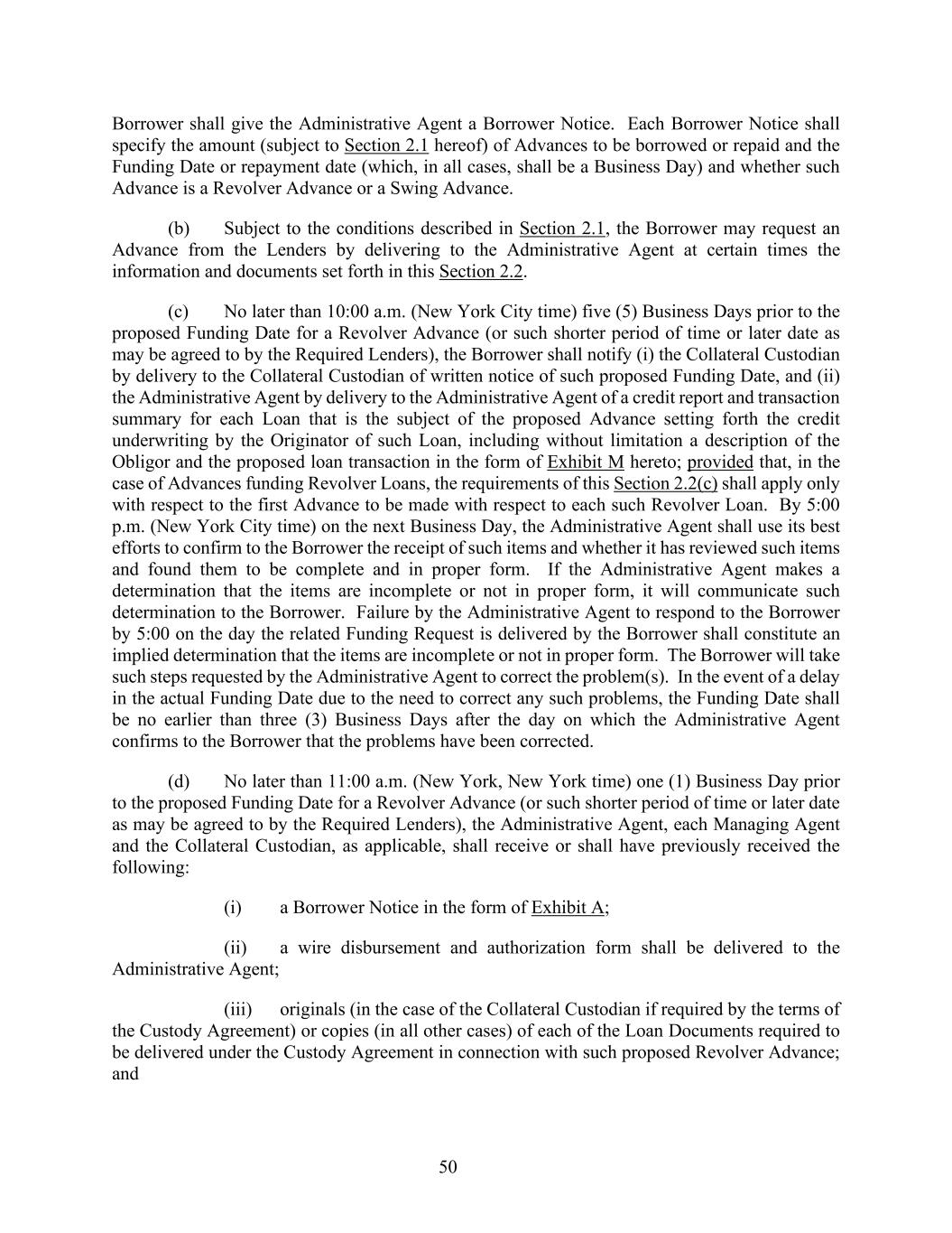 50 Borrower shall give the Administrative Agent a Borrower Notice. Each Borrower Notice shall specify the amount (subject to Section 2.1 hereof) of Advances to be borrowed or repaid and the Funding Date or repayment date (which, in all cases, shall be a Business Day) and whether such Advance is a Revolver Advance or a Swing Advance. (b) Subject to the conditions described in Section 2.1, the Borrower may request an Advance from the Lenders by delivering to the Administrative Agent at certain times the information and documents set forth in this Section 2.2. (c) No later than 10:00 a.m. (New York City time) five (5) Business Days prior to the proposed Funding Date for a Revolver Advance (or such shorter period of time or later date as may be agreed to by the Required Lenders), the Borrower shall notify (i) the Collateral Custodian by delivery to the Collateral Custodian of written notice of such proposed Funding Date, and (ii) the Administrative Agent by delivery to the Administrative Agent of a credit report and transaction summary for each Loan that is the subject of the proposed Advance setting forth the credit underwriting by the Originator of such Loan, including without limitation a description of the Obligor and the proposed loan transaction in the form of Exhibit M hereto; provided that, in the case of Advances funding Revolver Loans, the requirements of this Section 2.2(c) shall apply only with respect to the first Advance to be made with respect to each such Revolver Loan. By 5:00 p.m. (New York City time) on the next Business Day, the Administrative Agent shall use its best efforts to confirm to the Borrower the receipt of such items and whether it has reviewed such items and found them to be complete and in proper form. If the Administrative Agent makes a determination that the items are incomplete or not in proper form, it will communicate such determination to the Borrower. Failure by the Administrative Agent to respond to the Borrower by 5:00 on the day the related Funding Request is delivered by the Borrower shall constitute an implied determination that the items are incomplete or not in proper form. The Borrower will take such steps requested by the Administrative Agent to correct the problem(s). In the event of a delay in the actual Funding Date due to the need to correct any such problems, the Funding Date shall be no earlier than three (3) Business Days after the day on which the Administrative Agent confirms to the Borrower that the problems have been corrected. (d) No later than 11:00 a.m. (New York, New York time) one (1) Business Day prior to the proposed Funding Date for a Revolver Advance (or such shorter period of time or later date as may be agreed to by the Required Lenders), the Administrative Agent, each Managing Agent and the Collateral Custodian, as applicable, shall receive or shall have previously received the following: (i) a Borrower Notice in the form of Exhibit A; (ii) a wire disbursement and authorization form shall be delivered to the Administrative Agent; (iii) originals (in the case of the Collateral Custodian if required by the terms of the Custody Agreement) or copies (in all other cases) of each of the Loan Documents required to be delivered under the Custody Agreement in connection with such proposed Revolver Advance; and