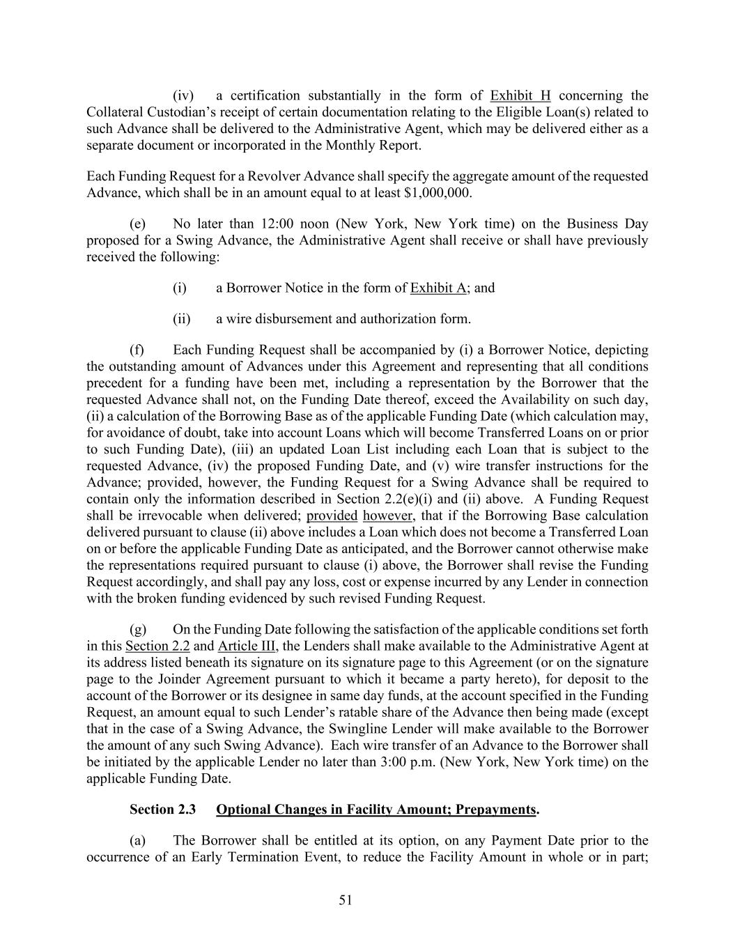 51 (iv) a certification substantially in the form of Exhibit H concerning the Collateral Custodian’s receipt of certain documentation relating to the Eligible Loan(s) related to such Advance shall be delivered to the Administrative Agent, which may be delivered either as a separate document or incorporated in the Monthly Report. Each Funding Request for a Revolver Advance shall specify the aggregate amount of the requested Advance, which shall be in an amount equal to at least $1,000,000. (e) No later than 12:00 noon (New York, New York time) on the Business Day proposed for a Swing Advance, the Administrative Agent shall receive or shall have previously received the following: (i) a Borrower Notice in the form of Exhibit A; and (ii) a wire disbursement and authorization form. (f) Each Funding Request shall be accompanied by (i) a Borrower Notice, depicting the outstanding amount of Advances under this Agreement and representing that all conditions precedent for a funding have been met, including a representation by the Borrower that the requested Advance shall not, on the Funding Date thereof, exceed the Availability on such day, (ii) a calculation of the Borrowing Base as of the applicable Funding Date (which calculation may, for avoidance of doubt, take into account Loans which will become Transferred Loans on or prior to such Funding Date), (iii) an updated Loan List including each Loan that is subject to the requested Advance, (iv) the proposed Funding Date, and (v) wire transfer instructions for the Advance; provided, however, the Funding Request for a Swing Advance shall be required to contain only the information described in Section 2.2(e)(i) and (ii) above. A Funding Request shall be irrevocable when delivered; provided however, that if the Borrowing Base calculation delivered pursuant to clause (ii) above includes a Loan which does not become a Transferred Loan on or before the applicable Funding Date as anticipated, and the Borrower cannot otherwise make the representations required pursuant to clause (i) above, the Borrower shall revise the Funding Request accordingly, and shall pay any loss, cost or expense incurred by any Lender in connection with the broken funding evidenced by such revised Funding Request. (g) On the Funding Date following the satisfaction of the applicable conditions set forth in this Section 2.2 and Article III, the Lenders shall make available to the Administrative Agent at its address listed beneath its signature on its signature page to this Agreement (or on the signature page to the Joinder Agreement pursuant to which it became a party hereto), for deposit to the account of the Borrower or its designee in same day funds, at the account specified in the Funding Request, an amount equal to such Lender’s ratable share of the Advance then being made (except that in the case of a Swing Advance, the Swingline Lender will make available to the Borrower the amount of any such Swing Advance). Each wire transfer of an Advance to the Borrower shall be initiated by the applicable Lender no later than 3:00 p.m. (New York, New York time) on the applicable Funding Date. Section 2.3 Optional Changes in Facility Amount; Prepayments. (a) The Borrower shall be entitled at its option, on any Payment Date prior to the occurrence of an Early Termination Event, to reduce the Facility Amount in whole or in part;