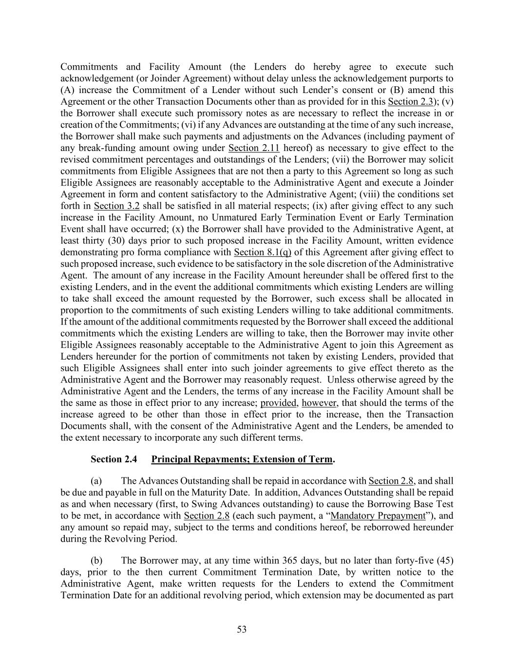 53 Commitments and Facility Amount (the Lenders do hereby agree to execute such acknowledgement (or Joinder Agreement) without delay unless the acknowledgement purports to (A) increase the Commitment of a Lender without such Lender’s consent or (B) amend this Agreement or the other Transaction Documents other than as provided for in this Section 2.3); (v) the Borrower shall execute such promissory notes as are necessary to reflect the increase in or creation of the Commitments; (vi) if any Advances are outstanding at the time of any such increase, the Borrower shall make such payments and adjustments on the Advances (including payment of any break-funding amount owing under Section 2.11 hereof) as necessary to give effect to the revised commitment percentages and outstandings of the Lenders; (vii) the Borrower may solicit commitments from Eligible Assignees that are not then a party to this Agreement so long as such Eligible Assignees are reasonably acceptable to the Administrative Agent and execute a Joinder Agreement in form and content satisfactory to the Administrative Agent; (viii) the conditions set forth in Section 3.2 shall be satisfied in all material respects; (ix) after giving effect to any such increase in the Facility Amount, no Unmatured Early Termination Event or Early Termination Event shall have occurred; (x) the Borrower shall have provided to the Administrative Agent, at least thirty (30) days prior to such proposed increase in the Facility Amount, written evidence demonstrating pro forma compliance with Section 8.1(q) of this Agreement after giving effect to such proposed increase, such evidence to be satisfactory in the sole discretion of the Administrative Agent. The amount of any increase in the Facility Amount hereunder shall be offered first to the existing Lenders, and in the event the additional commitments which existing Lenders are willing to take shall exceed the amount requested by the Borrower, such excess shall be allocated in proportion to the commitments of such existing Lenders willing to take additional commitments. If the amount of the additional commitments requested by the Borrower shall exceed the additional commitments which the existing Lenders are willing to take, then the Borrower may invite other Eligible Assignees reasonably acceptable to the Administrative Agent to join this Agreement as Lenders hereunder for the portion of commitments not taken by existing Lenders, provided that such Eligible Assignees shall enter into such joinder agreements to give effect thereto as the Administrative Agent and the Borrower may reasonably request. Unless otherwise agreed by the Administrative Agent and the Lenders, the terms of any increase in the Facility Amount shall be the same as those in effect prior to any increase; provided, however, that should the terms of the increase agreed to be other than those in effect prior to the increase, then the Transaction Documents shall, with the consent of the Administrative Agent and the Lenders, be amended to the extent necessary to incorporate any such different terms. Section 2.4 Principal Repayments; Extension of Term. (a) The Advances Outstanding shall be repaid in accordance with Section 2.8, and shall be due and payable in full on the Maturity Date. In addition, Advances Outstanding shall be repaid as and when necessary (first, to Swing Advances outstanding) to cause the Borrowing Base Test to be met, in accordance with Section 2.8 (each such payment, a “Mandatory Prepayment”), and any amount so repaid may, subject to the terms and conditions hereof, be reborrowed hereunder during the Revolving Period. (b) The Borrower may, at any time within 365 days, but no later than forty-five (45) days, prior to the then current Commitment Termination Date, by written notice to the Administrative Agent, make written requests for the Lenders to extend the Commitment Termination Date for an additional revolving period, which extension may be documented as part