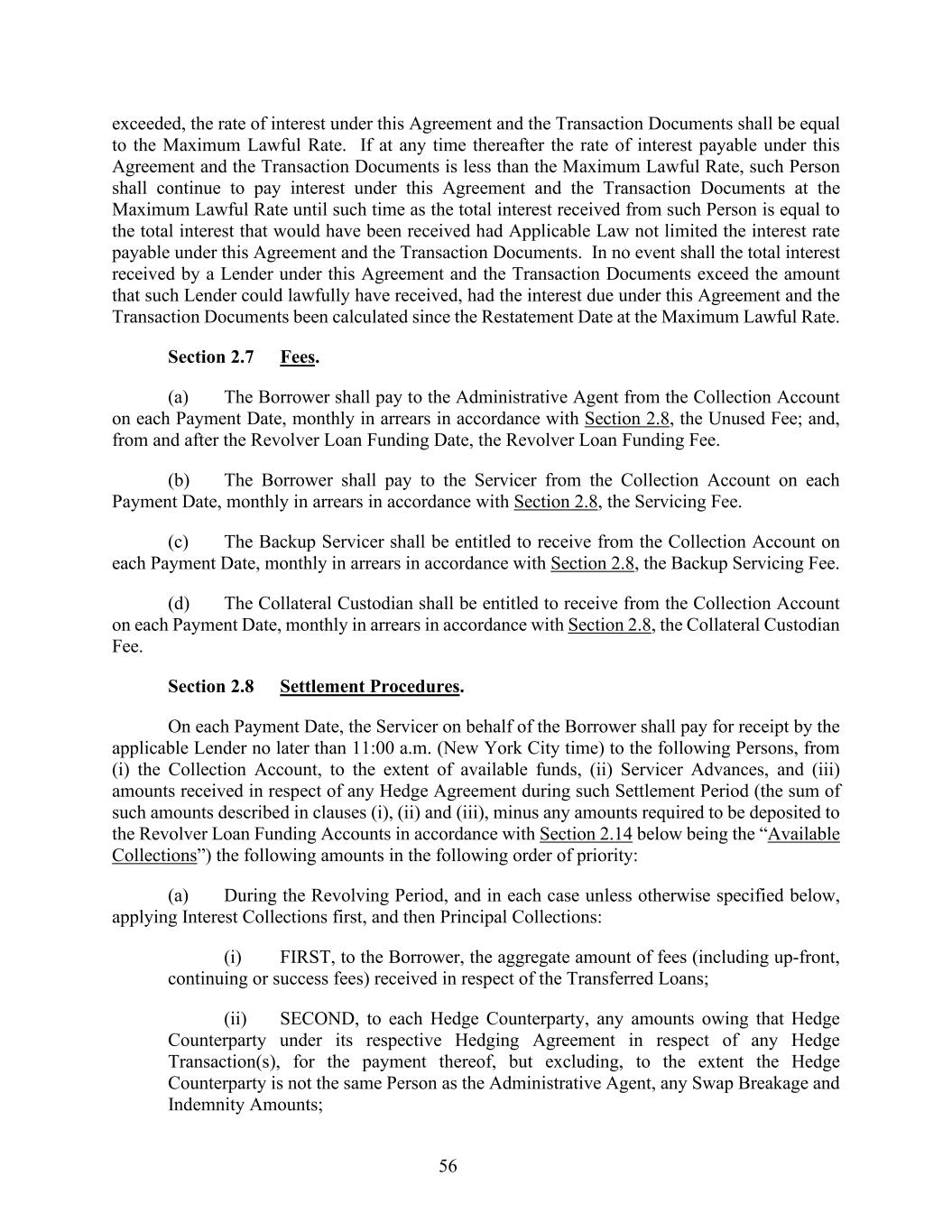 56 exceeded, the rate of interest under this Agreement and the Transaction Documents shall be equal to the Maximum Lawful Rate. If at any time thereafter the rate of interest payable under this Agreement and the Transaction Documents is less than the Maximum Lawful Rate, such Person shall continue to pay interest under this Agreement and the Transaction Documents at the Maximum Lawful Rate until such time as the total interest received from such Person is equal to the total interest that would have been received had Applicable Law not limited the interest rate payable under this Agreement and the Transaction Documents. In no event shall the total interest received by a Lender under this Agreement and the Transaction Documents exceed the amount that such Lender could lawfully have received, had the interest due under this Agreement and the Transaction Documents been calculated since the Restatement Date at the Maximum Lawful Rate. Section 2.7 Fees. (a) The Borrower shall pay to the Administrative Agent from the Collection Account on each Payment Date, monthly in arrears in accordance with Section 2.8, the Unused Fee; and, from and after the Revolver Loan Funding Date, the Revolver Loan Funding Fee. (b) The Borrower shall pay to the Servicer from the Collection Account on each Payment Date, monthly in arrears in accordance with Section 2.8, the Servicing Fee. (c) The Backup Servicer shall be entitled to receive from the Collection Account on each Payment Date, monthly in arrears in accordance with Section 2.8, the Backup Servicing Fee. (d) The Collateral Custodian shall be entitled to receive from the Collection Account on each Payment Date, monthly in arrears in accordance with Section 2.8, the Collateral Custodian Fee. Section 2.8 Settlement Procedures. On each Payment Date, the Servicer on behalf of the Borrower shall pay for receipt by the applicable Lender no later than 11:00 a.m. (New York City time) to the following Persons, from (i) the Collection Account, to the extent of available funds, (ii) Servicer Advances, and (iii) amounts received in respect of any Hedge Agreement during such Settlement Period (the sum of such amounts described in clauses (i), (ii) and (iii), minus any amounts required to be deposited to the Revolver Loan Funding Accounts in accordance with Section 2.14 below being the “Available Collections”) the following amounts in the following order of priority: (a) During the Revolving Period, and in each case unless otherwise specified below, applying Interest Collections first, and then Principal Collections: (i) FIRST, to the Borrower, the aggregate amount of fees (including up-front, continuing or success fees) received in respect of the Transferred Loans; (ii) SECOND, to each Hedge Counterparty, any amounts owing that Hedge Counterparty under its respective Hedging Agreement in respect of any Hedge Transaction(s), for the payment thereof, but excluding, to the extent the Hedge Counterparty is not the same Person as the Administrative Agent, any Swap Breakage and Indemnity Amounts;