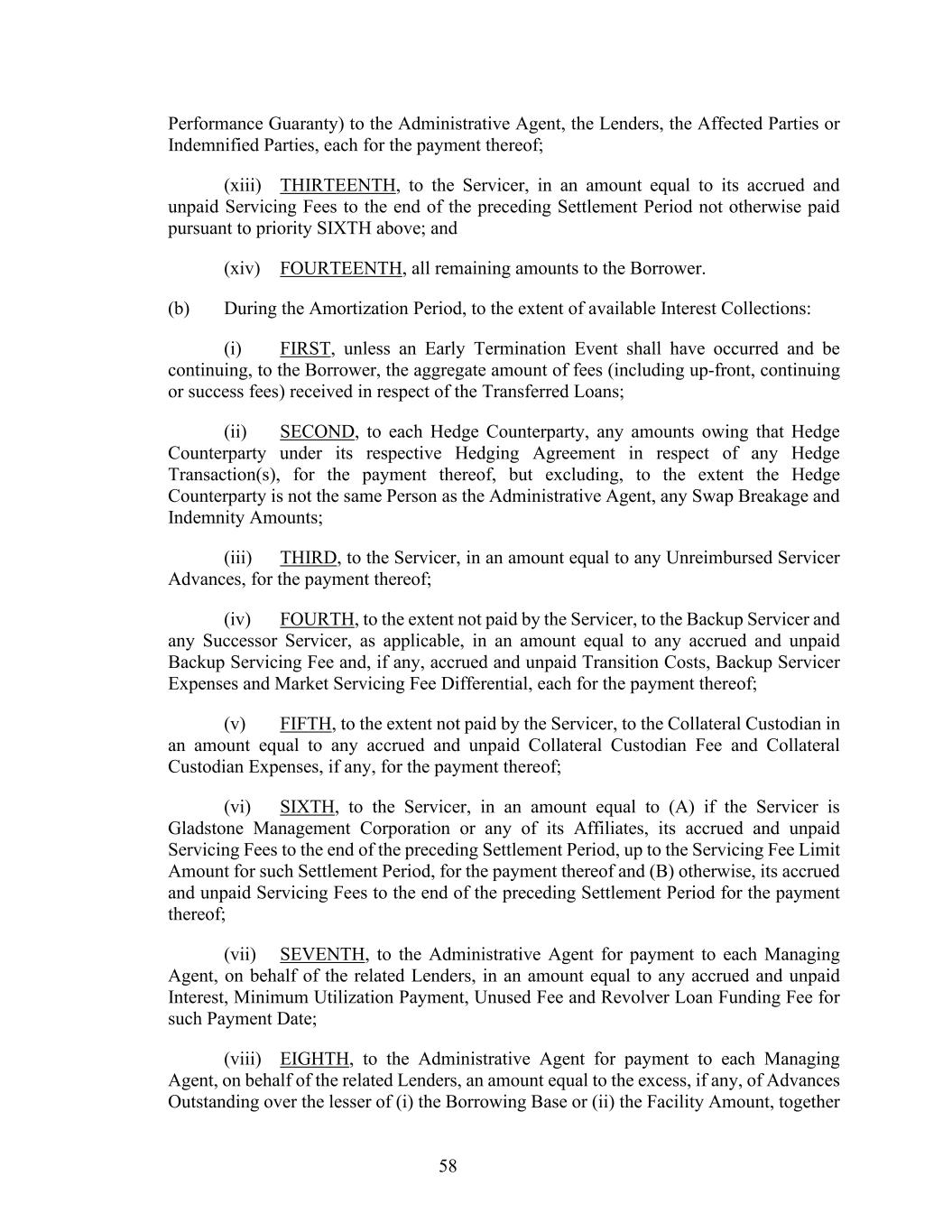 58 Performance Guaranty) to the Administrative Agent, the Lenders, the Affected Parties or Indemnified Parties, each for the payment thereof; (xiii) THIRTEENTH, to the Servicer, in an amount equal to its accrued and unpaid Servicing Fees to the end of the preceding Settlement Period not otherwise paid pursuant to priority SIXTH above; and (xiv) FOURTEENTH, all remaining amounts to the Borrower. (b) During the Amortization Period, to the extent of available Interest Collections: (i) FIRST, unless an Early Termination Event shall have occurred and be continuing, to the Borrower, the aggregate amount of fees (including up-front, continuing or success fees) received in respect of the Transferred Loans; (ii) SECOND, to each Hedge Counterparty, any amounts owing that Hedge Counterparty under its respective Hedging Agreement in respect of any Hedge Transaction(s), for the payment thereof, but excluding, to the extent the Hedge Counterparty is not the same Person as the Administrative Agent, any Swap Breakage and Indemnity Amounts; (iii) THIRD, to the Servicer, in an amount equal to any Unreimbursed Servicer Advances, for the payment thereof; (iv) FOURTH, to the extent not paid by the Servicer, to the Backup Servicer and any Successor Servicer, as applicable, in an amount equal to any accrued and unpaid Backup Servicing Fee and, if any, accrued and unpaid Transition Costs, Backup Servicer Expenses and Market Servicing Fee Differential, each for the payment thereof; (v) FIFTH, to the extent not paid by the Servicer, to the Collateral Custodian in an amount equal to any accrued and unpaid Collateral Custodian Fee and Collateral Custodian Expenses, if any, for the payment thereof; (vi) SIXTH, to the Servicer, in an amount equal to (A) if the Servicer is Gladstone Management Corporation or any of its Affiliates, its accrued and unpaid Servicing Fees to the end of the preceding Settlement Period, up to the Servicing Fee Limit Amount for such Settlement Period, for the payment thereof and (B) otherwise, its accrued and unpaid Servicing Fees to the end of the preceding Settlement Period for the payment thereof; (vii) SEVENTH, to the Administrative Agent for payment to each Managing Agent, on behalf of the related Lenders, in an amount equal to any accrued and unpaid Interest, Minimum Utilization Payment, Unused Fee and Revolver Loan Funding Fee for such Payment Date; (viii) EIGHTH, to the Administrative Agent for payment to each Managing Agent, on behalf of the related Lenders, an amount equal to the excess, if any, of Advances Outstanding over the lesser of (i) the Borrowing Base or (ii) the Facility Amount, together