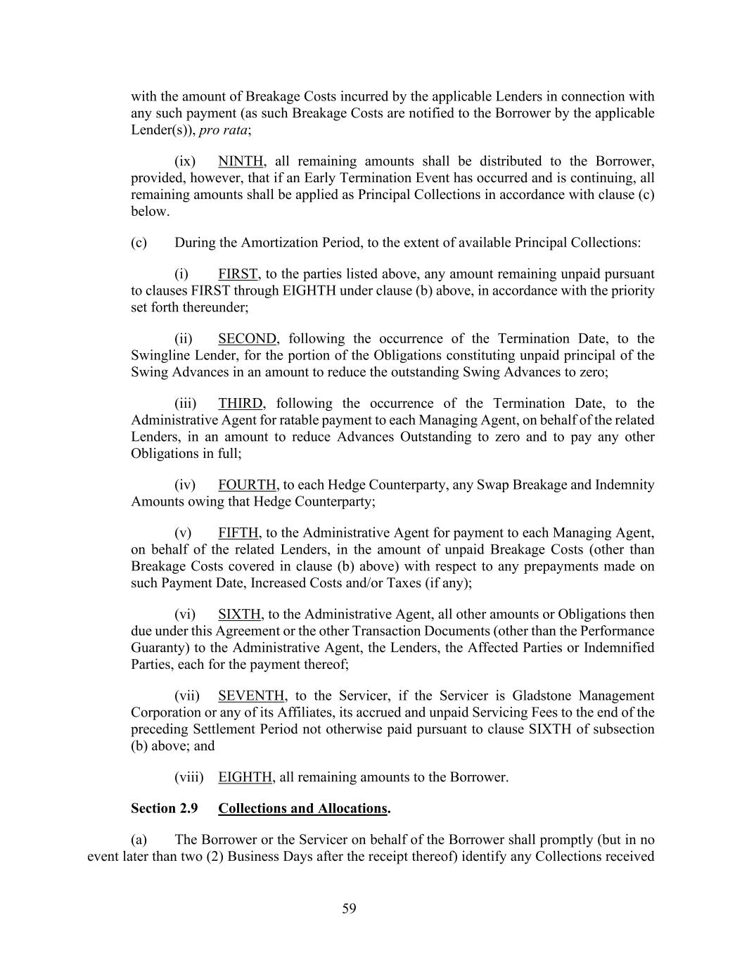 59 with the amount of Breakage Costs incurred by the applicable Lenders in connection with any such payment (as such Breakage Costs are notified to the Borrower by the applicable Lender(s)), pro rata; (ix) NINTH, all remaining amounts shall be distributed to the Borrower, provided, however, that if an Early Termination Event has occurred and is continuing, all remaining amounts shall be applied as Principal Collections in accordance with clause (c) below. (c) During the Amortization Period, to the extent of available Principal Collections: (i) FIRST, to the parties listed above, any amount remaining unpaid pursuant to clauses FIRST through EIGHTH under clause (b) above, in accordance with the priority set forth thereunder; (ii) SECOND, following the occurrence of the Termination Date, to the Swingline Lender, for the portion of the Obligations constituting unpaid principal of the Swing Advances in an amount to reduce the outstanding Swing Advances to zero; (iii) THIRD, following the occurrence of the Termination Date, to the Administrative Agent for ratable payment to each Managing Agent, on behalf of the related Lenders, in an amount to reduce Advances Outstanding to zero and to pay any other Obligations in full; (iv) FOURTH, to each Hedge Counterparty, any Swap Breakage and Indemnity Amounts owing that Hedge Counterparty; (v) FIFTH, to the Administrative Agent for payment to each Managing Agent, on behalf of the related Lenders, in the amount of unpaid Breakage Costs (other than Breakage Costs covered in clause (b) above) with respect to any prepayments made on such Payment Date, Increased Costs and/or Taxes (if any); (vi) SIXTH, to the Administrative Agent, all other amounts or Obligations then due under this Agreement or the other Transaction Documents (other than the Performance Guaranty) to the Administrative Agent, the Lenders, the Affected Parties or Indemnified Parties, each for the payment thereof; (vii) SEVENTH, to the Servicer, if the Servicer is Gladstone Management Corporation or any of its Affiliates, its accrued and unpaid Servicing Fees to the end of the preceding Settlement Period not otherwise paid pursuant to clause SIXTH of subsection (b) above; and (viii) EIGHTH, all remaining amounts to the Borrower. Section 2.9 Collections and Allocations. (a) The Borrower or the Servicer on behalf of the Borrower shall promptly (but in no event later than two (2) Business Days after the receipt thereof) identify any Collections received