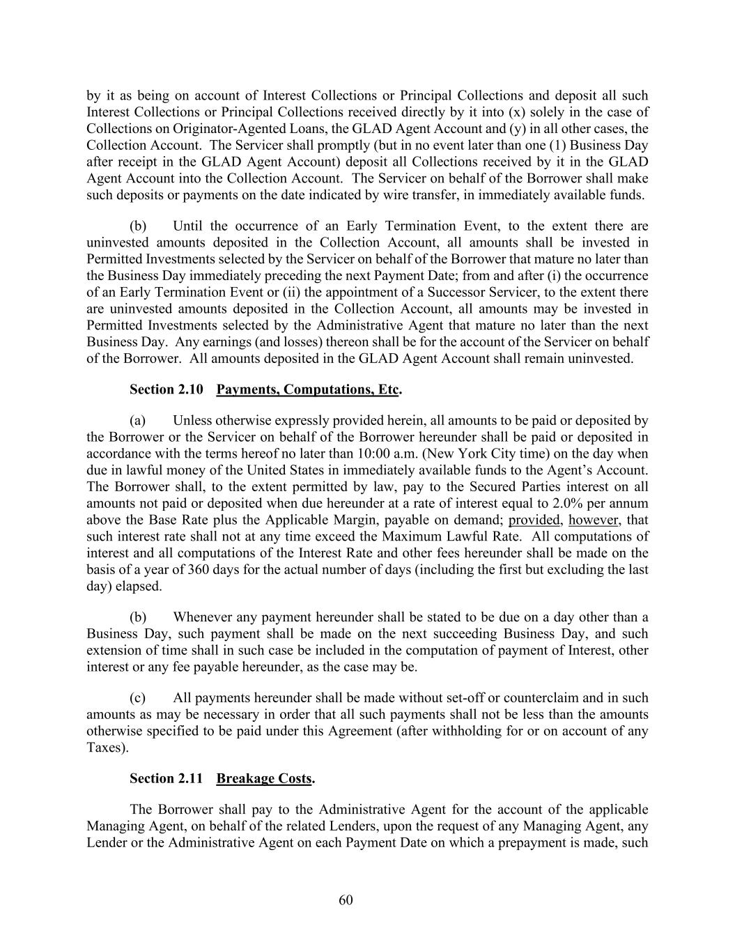 60 by it as being on account of Interest Collections or Principal Collections and deposit all such Interest Collections or Principal Collections received directly by it into (x) solely in the case of Collections on Originator-Agented Loans, the GLAD Agent Account and (y) in all other cases, the Collection Account. The Servicer shall promptly (but in no event later than one (1) Business Day after receipt in the GLAD Agent Account) deposit all Collections received by it in the GLAD Agent Account into the Collection Account. The Servicer on behalf of the Borrower shall make such deposits or payments on the date indicated by wire transfer, in immediately available funds. (b) Until the occurrence of an Early Termination Event, to the extent there are uninvested amounts deposited in the Collection Account, all amounts shall be invested in Permitted Investments selected by the Servicer on behalf of the Borrower that mature no later than the Business Day immediately preceding the next Payment Date; from and after (i) the occurrence of an Early Termination Event or (ii) the appointment of a Successor Servicer, to the extent there are uninvested amounts deposited in the Collection Account, all amounts may be invested in Permitted Investments selected by the Administrative Agent that mature no later than the next Business Day. Any earnings (and losses) thereon shall be for the account of the Servicer on behalf of the Borrower. All amounts deposited in the GLAD Agent Account shall remain uninvested. Section 2.10 Payments, Computations, Etc. (a) Unless otherwise expressly provided herein, all amounts to be paid or deposited by the Borrower or the Servicer on behalf of the Borrower hereunder shall be paid or deposited in accordance with the terms hereof no later than 10:00 a.m. (New York City time) on the day when due in lawful money of the United States in immediately available funds to the Agent’s Account. The Borrower shall, to the extent permitted by law, pay to the Secured Parties interest on all amounts not paid or deposited when due hereunder at a rate of interest equal to 2.0% per annum above the Base Rate plus the Applicable Margin, payable on demand; provided, however, that such interest rate shall not at any time exceed the Maximum Lawful Rate. All computations of interest and all computations of the Interest Rate and other fees hereunder shall be made on the basis of a year of 360 days for the actual number of days (including the first but excluding the last day) elapsed. (b) Whenever any payment hereunder shall be stated to be due on a day other than a Business Day, such payment shall be made on the next succeeding Business Day, and such extension of time shall in such case be included in the computation of payment of Interest, other interest or any fee payable hereunder, as the case may be. (c) All payments hereunder shall be made without set-off or counterclaim and in such amounts as may be necessary in order that all such payments shall not be less than the amounts otherwise specified to be paid under this Agreement (after withholding for or on account of any Taxes). Section 2.11 Breakage Costs. The Borrower shall pay to the Administrative Agent for the account of the applicable Managing Agent, on behalf of the related Lenders, upon the request of any Managing Agent, any Lender or the Administrative Agent on each Payment Date on which a prepayment is made, such