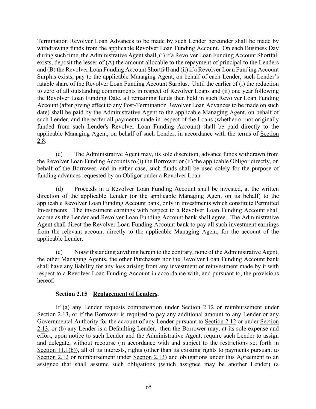65 Termination Revolver Loan Advances to be made by such Lender hereunder shall be made by withdrawing funds from the applicable Revolver Loan Funding Account. On each Business Day during such time, the Administrative Agent shall, (i) if a Revolver Loan Funding Account Shortfall exists, deposit the lesser of (A) the amount allocable to the repayment of principal to the Lenders and (B) the Revolver Loan Funding Account Shortfall and (ii) if a Revolver Loan Funding Account Surplus exists, pay to the applicable Managing Agent, on behalf of each Lender, such Lender’s ratable share of the Revolver Loan Funding Account Surplus. Until the earlier of (i) the reduction to zero of all outstanding commitments in respect of Revolver Loans and (ii) one year following the Revolver Loan Funding Date, all remaining funds then held in such Revolver Loan Funding Account (after giving effect to any Post-Termination Revolver Loan Advances to be made on such date) shall be paid by the Administrative Agent to the applicable Managing Agent, on behalf of such Lender, and thereafter all payments made in respect of the Loans (whether or not originally funded from such Lender's Revolver Loan Funding Account) shall be paid directly to the applicable Managing Agent, on behalf of such Lender, in accordance with the terms of Section 2.8. (c) The Administrative Agent may, its sole discretion, advance funds withdrawn from the Revolver Loan Funding Accounts to (i) the Borrower or (ii) the applicable Obligor directly, on behalf of the Borrower, and in either case, such funds shall be used solely for the purpose of funding advances requested by an Obligor under a Revolver Loan. (d) Proceeds in a Revolver Loan Funding Account shall be invested, at the written direction of the applicable Lender (or the applicable Managing Agent on its behalf) to the applicable Revolver Loan Funding Account bank, only in investments which constitute Permitted Investments. The investment earnings with respect to a Revolver Loan Funding Account shall accrue as the Lender and Revolver Loan Funding Account bank shall agree. The Administrative Agent shall direct the Revolver Loan Funding Account bank to pay all such investment earnings from the relevant account directly to the applicable Managing Agent, for the account of the applicable Lender. (e) Notwithstanding anything herein to the contrary, none of the Administrative Agent, the other Managing Agents, the other Purchasers nor the Revolver Loan Funding Account bank shall have any liability for any loss arising from any investment or reinvestment made by it with respect to a Revolver Loan Funding Account in accordance with, and pursuant to, the provisions hereof. Section 2.15 Replacement of Lenders. If (a) any Lender requests compensation under Section 2.12 or reimbursement under Section 2.13, or if the Borrower is required to pay any additional amount to any Lender or any Governmental Authority for the account of any Lender pursuant to Section 2.12 or under Section 2.13, or (b) any Lender is a Defaulting Lender, then the Borrower may, at its sole expense and effort, upon notice to such Lender and the Administrative Agent, require such Lender to assign and delegate, without recourse (in accordance with and subject to the restrictions set forth in Section 11.1(b)), all of its interests, rights (other than its existing rights to payments pursuant to Section 2.12 or reimbursement under Section 2.13) and obligations under this Agreement to an assignee that shall assume such obligations (which assignee may be another Lender) (a