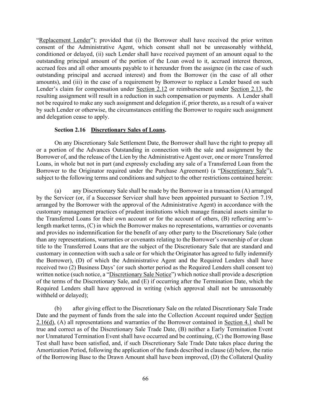 66 “Replacement Lender”); provided that (i) the Borrower shall have received the prior written consent of the Administrative Agent, which consent shall not be unreasonably withheld, conditioned or delayed, (ii) such Lender shall have received payment of an amount equal to the outstanding principal amount of the portion of the Loan owed to it, accrued interest thereon, accrued fees and all other amounts payable to it hereunder from the assignee (in the case of such outstanding principal and accrued interest) and from the Borrower (in the case of all other amounts), and (iii) in the case of a requirement by Borrower to replace a Lender based on such Lender’s claim for compensation under Section 2.12 or reimbursement under Section 2.13, the resulting assignment will result in a reduction in such compensation or payments. A Lender shall not be required to make any such assignment and delegation if, prior thereto, as a result of a waiver by such Lender or otherwise, the circumstances entitling the Borrower to require such assignment and delegation cease to apply. Section 2.16 Discretionary Sales of Loans. On any Discretionary Sale Settlement Date, the Borrower shall have the right to prepay all or a portion of the Advances Outstanding in connection with the sale and assignment by the Borrower of, and the release of the Lien by the Administrative Agent over, one or more Transferred Loans, in whole but not in part (and expressly excluding any sale of a Transferred Loan from the Borrower to the Originator required under the Purchase Agreement) (a “Discretionary Sale”), subject to the following terms and conditions and subject to the other restrictions contained herein: (a) any Discretionary Sale shall be made by the Borrower in a transaction (A) arranged by the Servicer (or, if a Successor Servicer shall have been appointed pursuant to Section 7.19, arranged by the Borrower with the approval of the Administrative Agent) in accordance with the customary management practices of prudent institutions which manage financial assets similar to the Transferred Loans for their own account or for the account of others, (B) reflecting arm’s- length market terms, (C) in which the Borrower makes no representations, warranties or covenants and provides no indemnification for the benefit of any other party to the Discretionary Sale (other than any representations, warranties or covenants relating to the Borrower’s ownership of or clean title to the Transferred Loans that are the subject of the Discretionary Sale that are standard and customary in connection with such a sale or for which the Originator has agreed to fully indemnify the Borrower), (D) of which the Administrative Agent and the Required Lenders shall have received two (2) Business Days’ (or such shorter period as the Required Lenders shall consent to) written notice (such notice, a “Discretionary Sale Notice”) which notice shall provide a description of the terms of the Discretionary Sale, and (E) if occurring after the Termination Date, which the Required Lenders shall have approved in writing (which approval shall not be unreasonably withheld or delayed); (b) after giving effect to the Discretionary Sale on the related Discretionary Sale Trade Date and the payment of funds from the sale into the Collection Account required under Section 2.16(d), (A) all representations and warranties of the Borrower contained in Section 4.1 shall be true and correct as of the Discretionary Sale Trade Date, (B) neither a Early Termination Event nor Unmatured Termination Event shall have occurred and be continuing, (C) the Borrowing Base Test shall have been satisfied, and, if such Discretionary Sale Trade Date takes place during the Amortization Period, following the application of the funds described in clause (d) below, the ratio of the Borrowing Base to the Drawn Amount shall have been improved, (D) the Collateral Quality