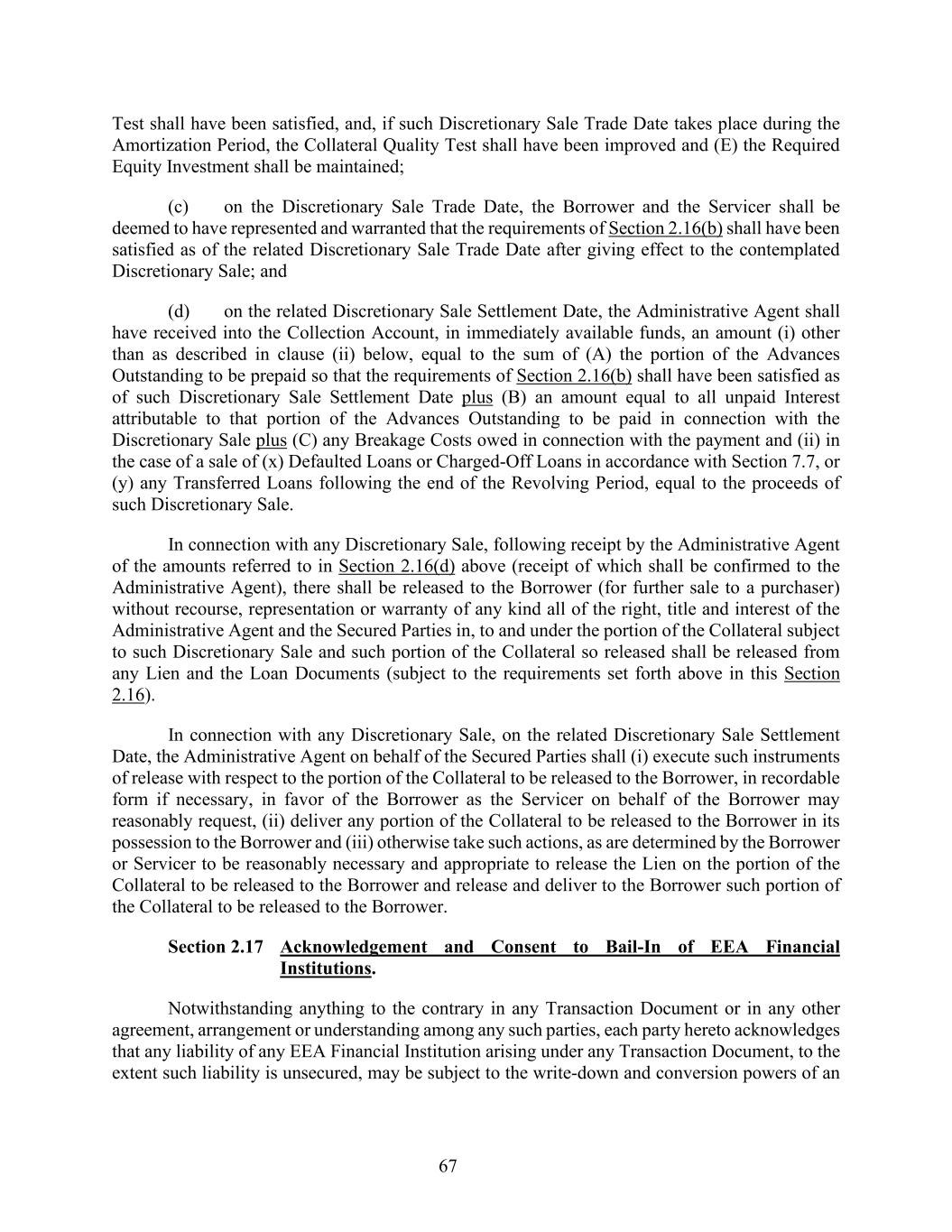 67 Test shall have been satisfied, and, if such Discretionary Sale Trade Date takes place during the Amortization Period, the Collateral Quality Test shall have been improved and (E) the Required Equity Investment shall be maintained; (c) on the Discretionary Sale Trade Date, the Borrower and the Servicer shall be deemed to have represented and warranted that the requirements of Section 2.16(b) shall have been satisfied as of the related Discretionary Sale Trade Date after giving effect to the contemplated Discretionary Sale; and (d) on the related Discretionary Sale Settlement Date, the Administrative Agent shall have received into the Collection Account, in immediately available funds, an amount (i) other than as described in clause (ii) below, equal to the sum of (A) the portion of the Advances Outstanding to be prepaid so that the requirements of Section 2.16(b) shall have been satisfied as of such Discretionary Sale Settlement Date plus (B) an amount equal to all unpaid Interest attributable to that portion of the Advances Outstanding to be paid in connection with the Discretionary Sale plus (C) any Breakage Costs owed in connection with the payment and (ii) in the case of a sale of (x) Defaulted Loans or Charged-Off Loans in accordance with Section 7.7, or (y) any Transferred Loans following the end of the Revolving Period, equal to the proceeds of such Discretionary Sale. In connection with any Discretionary Sale, following receipt by the Administrative Agent of the amounts referred to in Section 2.16(d) above (receipt of which shall be confirmed to the Administrative Agent), there shall be released to the Borrower (for further sale to a purchaser) without recourse, representation or warranty of any kind all of the right, title and interest of the Administrative Agent and the Secured Parties in, to and under the portion of the Collateral subject to such Discretionary Sale and such portion of the Collateral so released shall be released from any Lien and the Loan Documents (subject to the requirements set forth above in this Section 2.16). In connection with any Discretionary Sale, on the related Discretionary Sale Settlement Date, the Administrative Agent on behalf of the Secured Parties shall (i) execute such instruments of release with respect to the portion of the Collateral to be released to the Borrower, in recordable form if necessary, in favor of the Borrower as the Servicer on behalf of the Borrower may reasonably request, (ii) deliver any portion of the Collateral to be released to the Borrower in its possession to the Borrower and (iii) otherwise take such actions, as are determined by the Borrower or Servicer to be reasonably necessary and appropriate to release the Lien on the portion of the Collateral to be released to the Borrower and release and deliver to the Borrower such portion of the Collateral to be released to the Borrower. Section 2.17 Acknowledgement and Consent to Bail-In of EEA Financial Institutions. Notwithstanding anything to the contrary in any Transaction Document or in any other agreement, arrangement or understanding among any such parties, each party hereto acknowledges that any liability of any EEA Financial Institution arising under any Transaction Document, to the extent such liability is unsecured, may be subject to the write-down and conversion powers of an