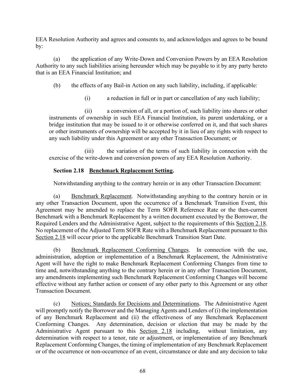 68 EEA Resolution Authority and agrees and consents to, and acknowledges and agrees to be bound by: (a) the application of any Write-Down and Conversion Powers by an EEA Resolution Authority to any such liabilities arising hereunder which may be payable to it by any party hereto that is an EEA Financial Institution; and (b) the effects of any Bail-in Action on any such liability, including, if applicable: (i) a reduction in full or in part or cancellation of any such liability; (ii) a conversion of all, or a portion of, such liability into shares or other instruments of ownership in such EEA Financial Institution, its parent undertaking, or a bridge institution that may be issued to it or otherwise conferred on it, and that such shares or other instruments of ownership will be accepted by it in lieu of any rights with respect to any such liability under this Agreement or any other Transaction Document; or (iii) the variation of the terms of such liability in connection with the exercise of the write-down and conversion powers of any EEA Resolution Authority. Section 2.18 Benchmark Replacement Setting. Notwithstanding anything to the contrary herein or in any other Transaction Document: (a) Benchmark Replacement. Notwithstanding anything to the contrary herein or in any other Transaction Document, upon the occurrence of a Benchmark Transition Event, this Agreement may be amended to replace the Term SOFR Reference Rate or the then-current Benchmark with a Benchmark Replacement by a written document executed by the Borrower, the Required Lenders and the Administrative Agent, subject to the requirements of this Section 2.18. No replacement of the Adjusted Term SOFR Rate with a Benchmark Replacement pursuant to this Section 2.18 will occur prior to the applicable Benchmark Transition Start Date. (b) Benchmark Replacement Conforming Changes. In connection with the use, administration, adoption or implementation of a Benchmark Replacement, the Administrative Agent will have the right to make Benchmark Replacement Conforming Changes from time to time and, notwithstanding anything to the contrary herein or in any other Transaction Document, any amendments implementing such Benchmark Replacement Conforming Changes will become effective without any further action or consent of any other party to this Agreement or any other Transaction Document. (c) Notices; Standards for Decisions and Determinations. The Administrative Agent will promptly notify the Borrower and the Managing Agents and Lenders of (i) the implementation of any Benchmark Replacement and (ii) the effectiveness of any Benchmark Replacement Conforming Changes. Any determination, decision or election that may be made by the Administrative Agent pursuant to this Section 2.18 including, without limitation, any determination with respect to a tenor, rate or adjustment, or implementation of any Benchmark Replacement Conforming Changes, the timing of implementation of any Benchmark Replacement or of the occurrence or non-occurrence of an event, circumstance or date and any decision to take