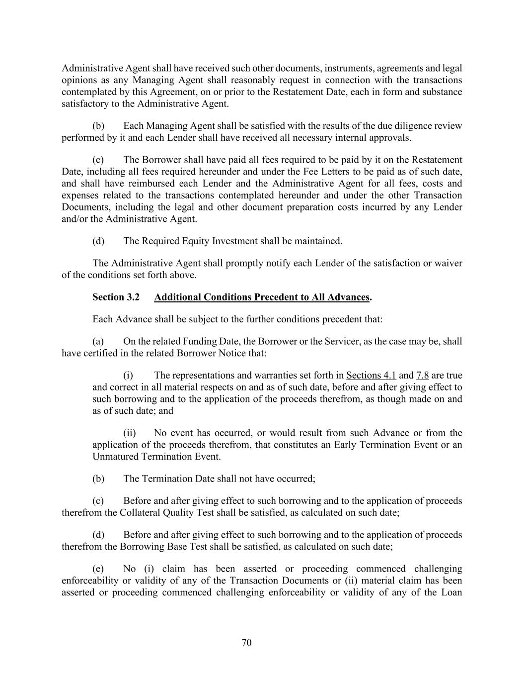70 Administrative Agent shall have received such other documents, instruments, agreements and legal opinions as any Managing Agent shall reasonably request in connection with the transactions contemplated by this Agreement, on or prior to the Restatement Date, each in form and substance satisfactory to the Administrative Agent. (b) Each Managing Agent shall be satisfied with the results of the due diligence review performed by it and each Lender shall have received all necessary internal approvals. (c) The Borrower shall have paid all fees required to be paid by it on the Restatement Date, including all fees required hereunder and under the Fee Letters to be paid as of such date, and shall have reimbursed each Lender and the Administrative Agent for all fees, costs and expenses related to the transactions contemplated hereunder and under the other Transaction Documents, including the legal and other document preparation costs incurred by any Lender and/or the Administrative Agent. (d) The Required Equity Investment shall be maintained. The Administrative Agent shall promptly notify each Lender of the satisfaction or waiver of the conditions set forth above. Section 3.2 Additional Conditions Precedent to All Advances. Each Advance shall be subject to the further conditions precedent that: (a) On the related Funding Date, the Borrower or the Servicer, as the case may be, shall have certified in the related Borrower Notice that: (i) The representations and warranties set forth in Sections 4.1 and 7.8 are true and correct in all material respects on and as of such date, before and after giving effect to such borrowing and to the application of the proceeds therefrom, as though made on and as of such date; and (ii) No event has occurred, or would result from such Advance or from the application of the proceeds therefrom, that constitutes an Early Termination Event or an Unmatured Termination Event. (b) The Termination Date shall not have occurred; (c) Before and after giving effect to such borrowing and to the application of proceeds therefrom the Collateral Quality Test shall be satisfied, as calculated on such date; (d) Before and after giving effect to such borrowing and to the application of proceeds therefrom the Borrowing Base Test shall be satisfied, as calculated on such date; (e) No (i) claim has been asserted or proceeding commenced challenging enforceability or validity of any of the Transaction Documents or (ii) material claim has been asserted or proceeding commenced challenging enforceability or validity of any of the Loan
