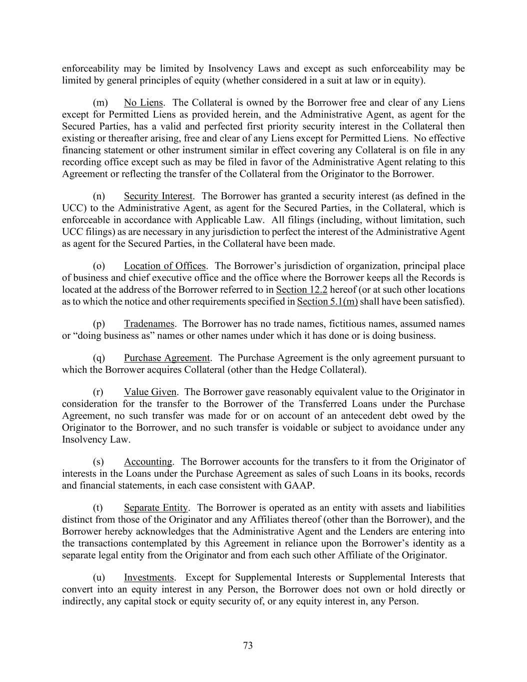 73 enforceability may be limited by Insolvency Laws and except as such enforceability may be limited by general principles of equity (whether considered in a suit at law or in equity). (m) No Liens. The Collateral is owned by the Borrower free and clear of any Liens except for Permitted Liens as provided herein, and the Administrative Agent, as agent for the Secured Parties, has a valid and perfected first priority security interest in the Collateral then existing or thereafter arising, free and clear of any Liens except for Permitted Liens. No effective financing statement or other instrument similar in effect covering any Collateral is on file in any recording office except such as may be filed in favor of the Administrative Agent relating to this Agreement or reflecting the transfer of the Collateral from the Originator to the Borrower. (n) Security Interest. The Borrower has granted a security interest (as defined in the UCC) to the Administrative Agent, as agent for the Secured Parties, in the Collateral, which is enforceable in accordance with Applicable Law. All filings (including, without limitation, such UCC filings) as are necessary in any jurisdiction to perfect the interest of the Administrative Agent as agent for the Secured Parties, in the Collateral have been made. (o) Location of Offices. The Borrower’s jurisdiction of organization, principal place of business and chief executive office and the office where the Borrower keeps all the Records is located at the address of the Borrower referred to in Section 12.2 hereof (or at such other locations as to which the notice and other requirements specified in Section 5.1(m) shall have been satisfied). (p) Tradenames. The Borrower has no trade names, fictitious names, assumed names or “doing business as” names or other names under which it has done or is doing business. (q) Purchase Agreement. The Purchase Agreement is the only agreement pursuant to which the Borrower acquires Collateral (other than the Hedge Collateral). (r) Value Given. The Borrower gave reasonably equivalent value to the Originator in consideration for the transfer to the Borrower of the Transferred Loans under the Purchase Agreement, no such transfer was made for or on account of an antecedent debt owed by the Originator to the Borrower, and no such transfer is voidable or subject to avoidance under any Insolvency Law. (s) Accounting. The Borrower accounts for the transfers to it from the Originator of interests in the Loans under the Purchase Agreement as sales of such Loans in its books, records and financial statements, in each case consistent with GAAP. (t) Separate Entity. The Borrower is operated as an entity with assets and liabilities distinct from those of the Originator and any Affiliates thereof (other than the Borrower), and the Borrower hereby acknowledges that the Administrative Agent and the Lenders are entering into the transactions contemplated by this Agreement in reliance upon the Borrower’s identity as a separate legal entity from the Originator and from each such other Affiliate of the Originator. (u) Investments. Except for Supplemental Interests or Supplemental Interests that convert into an equity interest in any Person, the Borrower does not own or hold directly or indirectly, any capital stock or equity security of, or any equity interest in, any Person.