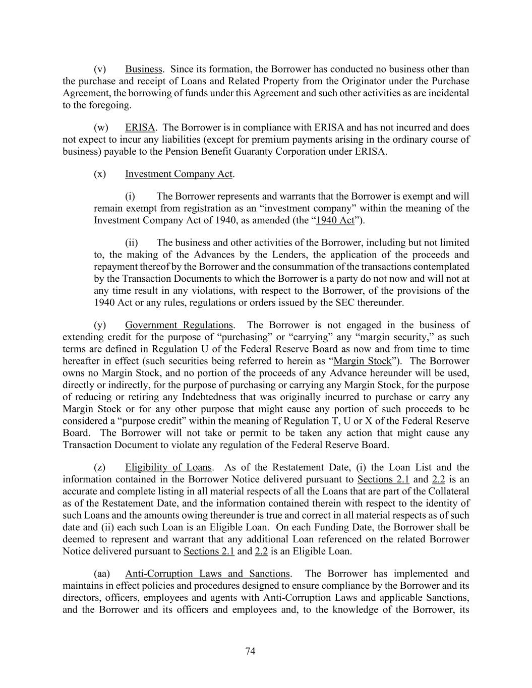74 (v) Business. Since its formation, the Borrower has conducted no business other than the purchase and receipt of Loans and Related Property from the Originator under the Purchase Agreement, the borrowing of funds under this Agreement and such other activities as are incidental to the foregoing. (w) ERISA. The Borrower is in compliance with ERISA and has not incurred and does not expect to incur any liabilities (except for premium payments arising in the ordinary course of business) payable to the Pension Benefit Guaranty Corporation under ERISA. (x) Investment Company Act. (i) The Borrower represents and warrants that the Borrower is exempt and will remain exempt from registration as an “investment company” within the meaning of the Investment Company Act of 1940, as amended (the “1940 Act”). (ii) The business and other activities of the Borrower, including but not limited to, the making of the Advances by the Lenders, the application of the proceeds and repayment thereof by the Borrower and the consummation of the transactions contemplated by the Transaction Documents to which the Borrower is a party do not now and will not at any time result in any violations, with respect to the Borrower, of the provisions of the 1940 Act or any rules, regulations or orders issued by the SEC thereunder. (y) Government Regulations. The Borrower is not engaged in the business of extending credit for the purpose of “purchasing” or “carrying” any “margin security,” as such terms are defined in Regulation U of the Federal Reserve Board as now and from time to time hereafter in effect (such securities being referred to herein as “Margin Stock”). The Borrower owns no Margin Stock, and no portion of the proceeds of any Advance hereunder will be used, directly or indirectly, for the purpose of purchasing or carrying any Margin Stock, for the purpose of reducing or retiring any Indebtedness that was originally incurred to purchase or carry any Margin Stock or for any other purpose that might cause any portion of such proceeds to be considered a “purpose credit” within the meaning of Regulation T, U or X of the Federal Reserve Board. The Borrower will not take or permit to be taken any action that might cause any Transaction Document to violate any regulation of the Federal Reserve Board. (z) Eligibility of Loans. As of the Restatement Date, (i) the Loan List and the information contained in the Borrower Notice delivered pursuant to Sections 2.1 and 2.2 is an accurate and complete listing in all material respects of all the Loans that are part of the Collateral as of the Restatement Date, and the information contained therein with respect to the identity of such Loans and the amounts owing thereunder is true and correct in all material respects as of such date and (ii) each such Loan is an Eligible Loan. On each Funding Date, the Borrower shall be deemed to represent and warrant that any additional Loan referenced on the related Borrower Notice delivered pursuant to Sections 2.1 and 2.2 is an Eligible Loan. (aa) Anti-Corruption Laws and Sanctions. The Borrower has implemented and maintains in effect policies and procedures designed to ensure compliance by the Borrower and its directors, officers, employees and agents with Anti-Corruption Laws and applicable Sanctions, and the Borrower and its officers and employees and, to the knowledge of the Borrower, its