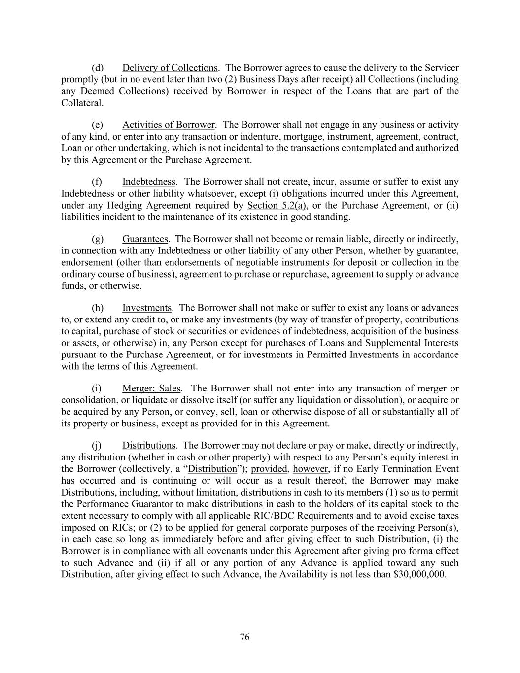 76 (d) Delivery of Collections. The Borrower agrees to cause the delivery to the Servicer promptly (but in no event later than two (2) Business Days after receipt) all Collections (including any Deemed Collections) received by Borrower in respect of the Loans that are part of the Collateral. (e) Activities of Borrower. The Borrower shall not engage in any business or activity of any kind, or enter into any transaction or indenture, mortgage, instrument, agreement, contract, Loan or other undertaking, which is not incidental to the transactions contemplated and authorized by this Agreement or the Purchase Agreement. (f) Indebtedness. The Borrower shall not create, incur, assume or suffer to exist any Indebtedness or other liability whatsoever, except (i) obligations incurred under this Agreement, under any Hedging Agreement required by Section 5.2(a), or the Purchase Agreement, or (ii) liabilities incident to the maintenance of its existence in good standing. (g) Guarantees. The Borrower shall not become or remain liable, directly or indirectly, in connection with any Indebtedness or other liability of any other Person, whether by guarantee, endorsement (other than endorsements of negotiable instruments for deposit or collection in the ordinary course of business), agreement to purchase or repurchase, agreement to supply or advance funds, or otherwise. (h) Investments. The Borrower shall not make or suffer to exist any loans or advances to, or extend any credit to, or make any investments (by way of transfer of property, contributions to capital, purchase of stock or securities or evidences of indebtedness, acquisition of the business or assets, or otherwise) in, any Person except for purchases of Loans and Supplemental Interests pursuant to the Purchase Agreement, or for investments in Permitted Investments in accordance with the terms of this Agreement. (i) Merger; Sales. The Borrower shall not enter into any transaction of merger or consolidation, or liquidate or dissolve itself (or suffer any liquidation or dissolution), or acquire or be acquired by any Person, or convey, sell, loan or otherwise dispose of all or substantially all of its property or business, except as provided for in this Agreement. (j) Distributions. The Borrower may not declare or pay or make, directly or indirectly, any distribution (whether in cash or other property) with respect to any Person’s equity interest in the Borrower (collectively, a “Distribution”); provided, however, if no Early Termination Event has occurred and is continuing or will occur as a result thereof, the Borrower may make Distributions, including, without limitation, distributions in cash to its members (1) so as to permit the Performance Guarantor to make distributions in cash to the holders of its capital stock to the extent necessary to comply with all applicable RIC/BDC Requirements and to avoid excise taxes imposed on RICs; or (2) to be applied for general corporate purposes of the receiving Person(s), in each case so long as immediately before and after giving effect to such Distribution, (i) the Borrower is in compliance with all covenants under this Agreement after giving pro forma effect to such Advance and (ii) if all or any portion of any Advance is applied toward any such Distribution, after giving effect to such Advance, the Availability is not less than $30,000,000.