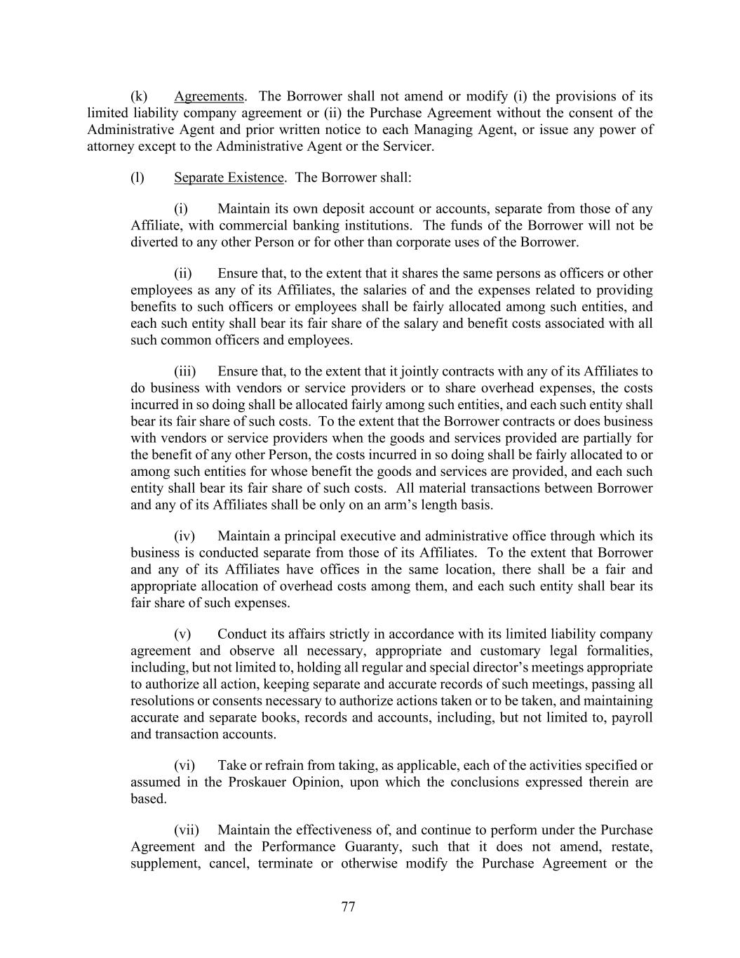 77 (k) Agreements. The Borrower shall not amend or modify (i) the provisions of its limited liability company agreement or (ii) the Purchase Agreement without the consent of the Administrative Agent and prior written notice to each Managing Agent, or issue any power of attorney except to the Administrative Agent or the Servicer. (l) Separate Existence. The Borrower shall: (i) Maintain its own deposit account or accounts, separate from those of any Affiliate, with commercial banking institutions. The funds of the Borrower will not be diverted to any other Person or for other than corporate uses of the Borrower. (ii) Ensure that, to the extent that it shares the same persons as officers or other employees as any of its Affiliates, the salaries of and the expenses related to providing benefits to such officers or employees shall be fairly allocated among such entities, and each such entity shall bear its fair share of the salary and benefit costs associated with all such common officers and employees. (iii) Ensure that, to the extent that it jointly contracts with any of its Affiliates to do business with vendors or service providers or to share overhead expenses, the costs incurred in so doing shall be allocated fairly among such entities, and each such entity shall bear its fair share of such costs. To the extent that the Borrower contracts or does business with vendors or service providers when the goods and services provided are partially for the benefit of any other Person, the costs incurred in so doing shall be fairly allocated to or among such entities for whose benefit the goods and services are provided, and each such entity shall bear its fair share of such costs. All material transactions between Borrower and any of its Affiliates shall be only on an arm’s length basis. (iv) Maintain a principal executive and administrative office through which its business is conducted separate from those of its Affiliates. To the extent that Borrower and any of its Affiliates have offices in the same location, there shall be a fair and appropriate allocation of overhead costs among them, and each such entity shall bear its fair share of such expenses. (v) Conduct its affairs strictly in accordance with its limited liability company agreement and observe all necessary, appropriate and customary legal formalities, including, but not limited to, holding all regular and special director’s meetings appropriate to authorize all action, keeping separate and accurate records of such meetings, passing all resolutions or consents necessary to authorize actions taken or to be taken, and maintaining accurate and separate books, records and accounts, including, but not limited to, payroll and transaction accounts. (vi) Take or refrain from taking, as applicable, each of the activities specified or assumed in the Proskauer Opinion, upon which the conclusions expressed therein are based. (vii) Maintain the effectiveness of, and continue to perform under the Purchase Agreement and the Performance Guaranty, such that it does not amend, restate, supplement, cancel, terminate or otherwise modify the Purchase Agreement or the