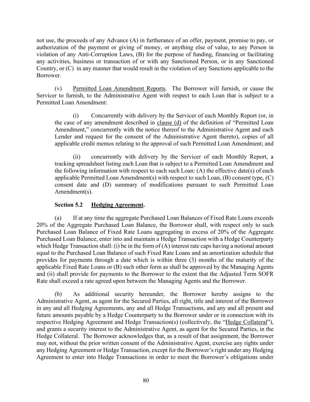 80 not use, the proceeds of any Advance (A) in furtherance of an offer, payment, promise to pay, or authorization of the payment or giving of money, or anything else of value, to any Person in violation of any Anti-Corruption Laws, (B) for the purpose of funding, financing or facilitating any activities, business or transaction of or with any Sanctioned Person, or in any Sanctioned Country, or (C) in any manner that would result in the violation of any Sanctions applicable to the Borrower. (v) Permitted Loan Amendment Reports. The Borrower will furnish, or cause the Servicer to furnish, to the Administrative Agent with respect to each Loan that is subject to a Permitted Loan Amendment: (i) Concurrently with delivery by the Servicer of each Monthly Report (or, in the case of any amendment described in clause (d) of the definition of “Permitted Loan Amendment,” concurrently with the notice thereof to the Administrative Agent and each Lender and request for the consent of the Administrative Agent thereto), copies of all applicable credit memos relating to the approval of such Permitted Loan Amendment; and (ii) concurrently with delivery by the Servicer of each Monthly Report, a tracking spreadsheet listing each Loan that is subject to a Permitted Loan Amendment and the following information with respect to each such Loan: (A) the effective date(s) of each applicable Permitted Loan Amendment(s) with respect to such Loan, (B) consent type, (C) consent date and (D) summary of modifications pursuant to such Permitted Loan Amendment(s). Section 5.2 Hedging Agreement. (a) If at any time the aggregate Purchased Loan Balances of Fixed Rate Loans exceeds 20% of the Aggregate Purchased Loan Balance, the Borrower shall, with respect only to such Purchased Loan Balance of Fixed Rate Loans aggregating in excess of 20% of the Aggregate Purchased Loan Balance, enter into and maintain a Hedge Transaction with a Hedge Counterparty which Hedge Transaction shall: (i) be in the form of (A) interest rate caps having a notional amount equal to the Purchased Loan Balance of such Fixed Rate Loans and an amortization schedule that provides for payments through a date which is within three (3) months of the maturity of the applicable Fixed Rate Loans or (B) such other form as shall be approved by the Managing Agents and (ii) shall provide for payments to the Borrower to the extent that the Adjusted Term SOFR Rate shall exceed a rate agreed upon between the Managing Agents and the Borrower. (b) As additional security hereunder, the Borrower hereby assigns to the Administrative Agent, as agent for the Secured Parties, all right, title and interest of the Borrower in any and all Hedging Agreements, any and all Hedge Transactions, and any and all present and future amounts payable by a Hedge Counterparty to the Borrower under or in connection with its respective Hedging Agreement and Hedge Transaction(s) (collectively, the “Hedge Collateral”), and grants a security interest to the Administrative Agent, as agent for the Secured Parties, in the Hedge Collateral. The Borrower acknowledges that, as a result of that assignment, the Borrower may not, without the prior written consent of the Administrative Agent, exercise any rights under any Hedging Agreement or Hedge Transaction, except for the Borrower’s right under any Hedging Agreement to enter into Hedge Transactions in order to meet the Borrower’s obligations under