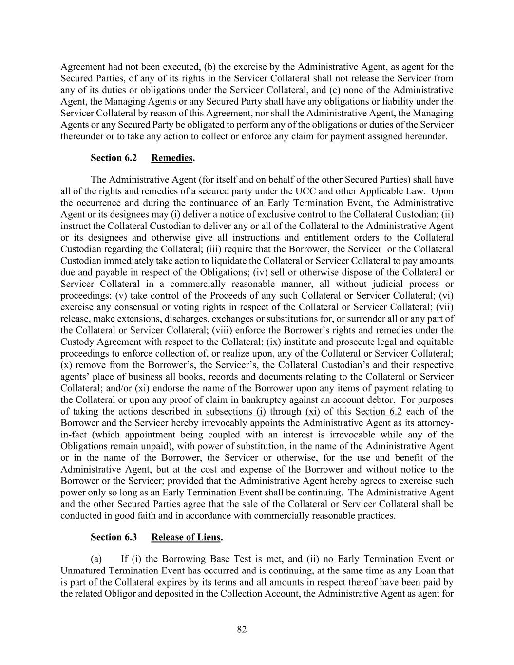 82 Agreement had not been executed, (b) the exercise by the Administrative Agent, as agent for the Secured Parties, of any of its rights in the Servicer Collateral shall not release the Servicer from any of its duties or obligations under the Servicer Collateral, and (c) none of the Administrative Agent, the Managing Agents or any Secured Party shall have any obligations or liability under the Servicer Collateral by reason of this Agreement, nor shall the Administrative Agent, the Managing Agents or any Secured Party be obligated to perform any of the obligations or duties of the Servicer thereunder or to take any action to collect or enforce any claim for payment assigned hereunder. Section 6.2 Remedies. The Administrative Agent (for itself and on behalf of the other Secured Parties) shall have all of the rights and remedies of a secured party under the UCC and other Applicable Law. Upon the occurrence and during the continuance of an Early Termination Event, the Administrative Agent or its designees may (i) deliver a notice of exclusive control to the Collateral Custodian; (ii) instruct the Collateral Custodian to deliver any or all of the Collateral to the Administrative Agent or its designees and otherwise give all instructions and entitlement orders to the Collateral Custodian regarding the Collateral; (iii) require that the Borrower, the Servicer or the Collateral Custodian immediately take action to liquidate the Collateral or Servicer Collateral to pay amounts due and payable in respect of the Obligations; (iv) sell or otherwise dispose of the Collateral or Servicer Collateral in a commercially reasonable manner, all without judicial process or proceedings; (v) take control of the Proceeds of any such Collateral or Servicer Collateral; (vi) exercise any consensual or voting rights in respect of the Collateral or Servicer Collateral; (vii) release, make extensions, discharges, exchanges or substitutions for, or surrender all or any part of the Collateral or Servicer Collateral; (viii) enforce the Borrower’s rights and remedies under the Custody Agreement with respect to the Collateral; (ix) institute and prosecute legal and equitable proceedings to enforce collection of, or realize upon, any of the Collateral or Servicer Collateral; (x) remove from the Borrower’s, the Servicer’s, the Collateral Custodian’s and their respective agents’ place of business all books, records and documents relating to the Collateral or Servicer Collateral; and/or (xi) endorse the name of the Borrower upon any items of payment relating to the Collateral or upon any proof of claim in bankruptcy against an account debtor. For purposes of taking the actions described in subsections (i) through (xi) of this Section 6.2 each of the Borrower and the Servicer hereby irrevocably appoints the Administrative Agent as its attorney- in-fact (which appointment being coupled with an interest is irrevocable while any of the Obligations remain unpaid), with power of substitution, in the name of the Administrative Agent or in the name of the Borrower, the Servicer or otherwise, for the use and benefit of the Administrative Agent, but at the cost and expense of the Borrower and without notice to the Borrower or the Servicer; provided that the Administrative Agent hereby agrees to exercise such power only so long as an Early Termination Event shall be continuing. The Administrative Agent and the other Secured Parties agree that the sale of the Collateral or Servicer Collateral shall be conducted in good faith and in accordance with commercially reasonable practices. Section 6.3 Release of Liens. (a) If (i) the Borrowing Base Test is met, and (ii) no Early Termination Event or Unmatured Termination Event has occurred and is continuing, at the same time as any Loan that is part of the Collateral expires by its terms and all amounts in respect thereof have been paid by the related Obligor and deposited in the Collection Account, the Administrative Agent as agent for