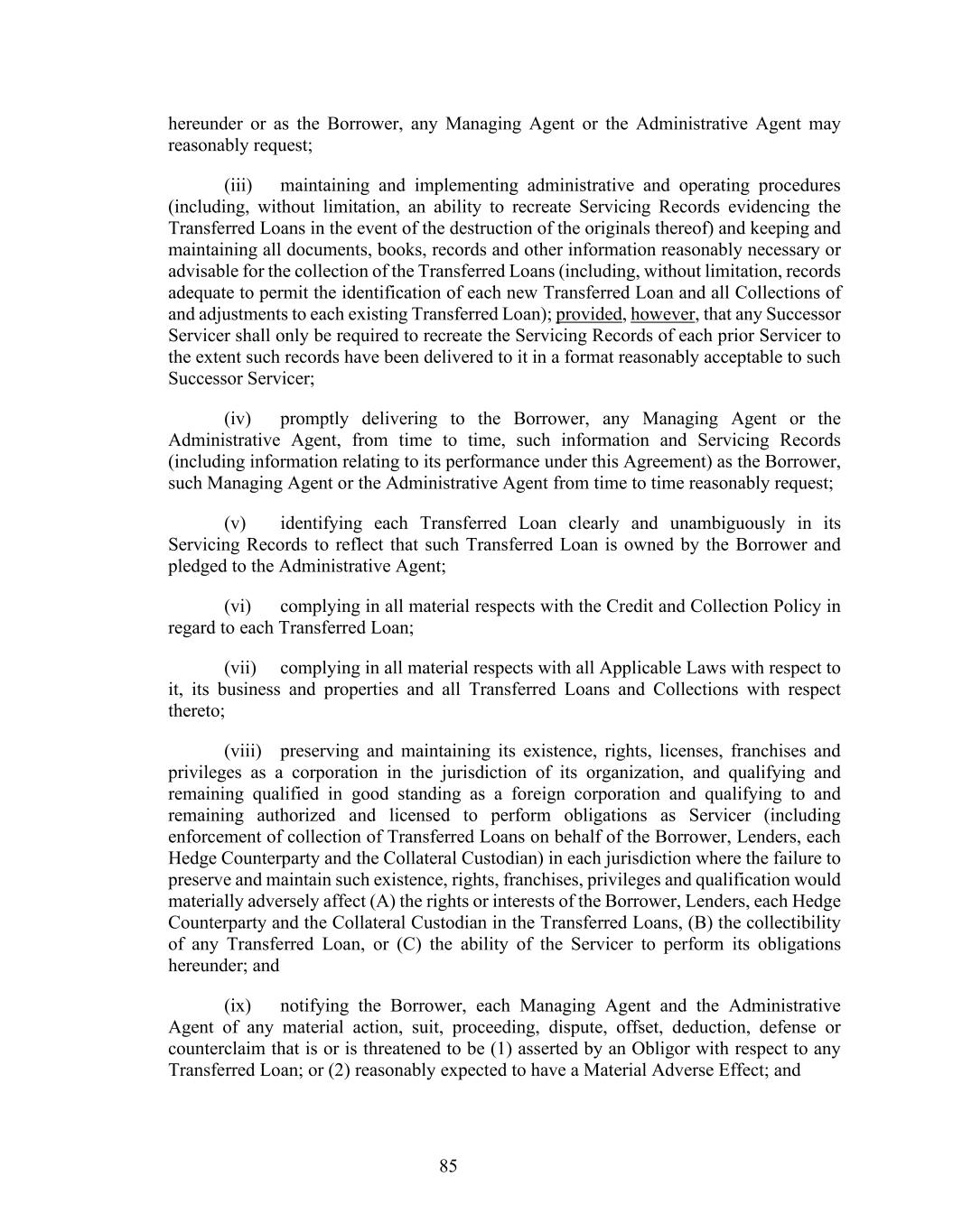85 hereunder or as the Borrower, any Managing Agent or the Administrative Agent may reasonably request; (iii) maintaining and implementing administrative and operating procedures (including, without limitation, an ability to recreate Servicing Records evidencing the Transferred Loans in the event of the destruction of the originals thereof) and keeping and maintaining all documents, books, records and other information reasonably necessary or advisable for the collection of the Transferred Loans (including, without limitation, records adequate to permit the identification of each new Transferred Loan and all Collections of and adjustments to each existing Transferred Loan); provided, however, that any Successor Servicer shall only be required to recreate the Servicing Records of each prior Servicer to the extent such records have been delivered to it in a format reasonably acceptable to such Successor Servicer; (iv) promptly delivering to the Borrower, any Managing Agent or the Administrative Agent, from time to time, such information and Servicing Records (including information relating to its performance under this Agreement) as the Borrower, such Managing Agent or the Administrative Agent from time to time reasonably request; (v) identifying each Transferred Loan clearly and unambiguously in its Servicing Records to reflect that such Transferred Loan is owned by the Borrower and pledged to the Administrative Agent; (vi) complying in all material respects with the Credit and Collection Policy in regard to each Transferred Loan; (vii) complying in all material respects with all Applicable Laws with respect to it, its business and properties and all Transferred Loans and Collections with respect thereto; (viii) preserving and maintaining its existence, rights, licenses, franchises and privileges as a corporation in the jurisdiction of its organization, and qualifying and remaining qualified in good standing as a foreign corporation and qualifying to and remaining authorized and licensed to perform obligations as Servicer (including enforcement of collection of Transferred Loans on behalf of the Borrower, Lenders, each Hedge Counterparty and the Collateral Custodian) in each jurisdiction where the failure to preserve and maintain such existence, rights, franchises, privileges and qualification would materially adversely affect (A) the rights or interests of the Borrower, Lenders, each Hedge Counterparty and the Collateral Custodian in the Transferred Loans, (B) the collectibility of any Transferred Loan, or (C) the ability of the Servicer to perform its obligations hereunder; and (ix) notifying the Borrower, each Managing Agent and the Administrative Agent of any material action, suit, proceeding, dispute, offset, deduction, defense or counterclaim that is or is threatened to be (1) asserted by an Obligor with respect to any Transferred Loan; or (2) reasonably expected to have a Material Adverse Effect; and