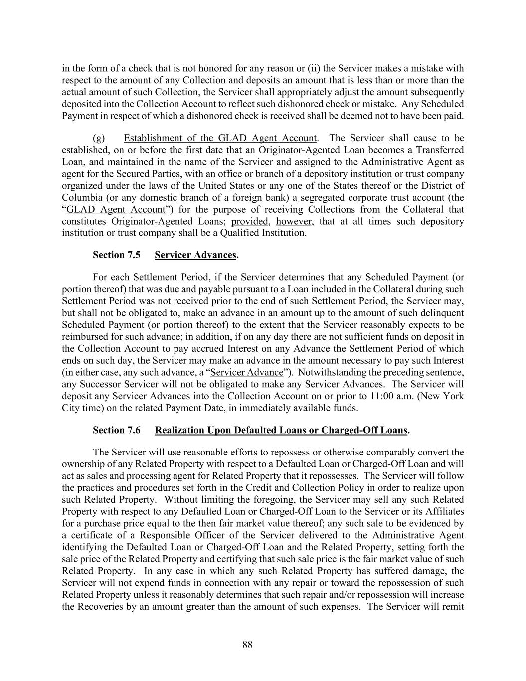 88 in the form of a check that is not honored for any reason or (ii) the Servicer makes a mistake with respect to the amount of any Collection and deposits an amount that is less than or more than the actual amount of such Collection, the Servicer shall appropriately adjust the amount subsequently deposited into the Collection Account to reflect such dishonored check or mistake. Any Scheduled Payment in respect of which a dishonored check is received shall be deemed not to have been paid. (g) Establishment of the GLAD Agent Account. The Servicer shall cause to be established, on or before the first date that an Originator-Agented Loan becomes a Transferred Loan, and maintained in the name of the Servicer and assigned to the Administrative Agent as agent for the Secured Parties, with an office or branch of a depository institution or trust company organized under the laws of the United States or any one of the States thereof or the District of Columbia (or any domestic branch of a foreign bank) a segregated corporate trust account (the “GLAD Agent Account”) for the purpose of receiving Collections from the Collateral that constitutes Originator-Agented Loans; provided, however, that at all times such depository institution or trust company shall be a Qualified Institution. Section 7.5 Servicer Advances. For each Settlement Period, if the Servicer determines that any Scheduled Payment (or portion thereof) that was due and payable pursuant to a Loan included in the Collateral during such Settlement Period was not received prior to the end of such Settlement Period, the Servicer may, but shall not be obligated to, make an advance in an amount up to the amount of such delinquent Scheduled Payment (or portion thereof) to the extent that the Servicer reasonably expects to be reimbursed for such advance; in addition, if on any day there are not sufficient funds on deposit in the Collection Account to pay accrued Interest on any Advance the Settlement Period of which ends on such day, the Servicer may make an advance in the amount necessary to pay such Interest (in either case, any such advance, a “Servicer Advance”). Notwithstanding the preceding sentence, any Successor Servicer will not be obligated to make any Servicer Advances. The Servicer will deposit any Servicer Advances into the Collection Account on or prior to 11:00 a.m. (New York City time) on the related Payment Date, in immediately available funds. Section 7.6 Realization Upon Defaulted Loans or Charged-Off Loans. The Servicer will use reasonable efforts to repossess or otherwise comparably convert the ownership of any Related Property with respect to a Defaulted Loan or Charged-Off Loan and will act as sales and processing agent for Related Property that it repossesses. The Servicer will follow the practices and procedures set forth in the Credit and Collection Policy in order to realize upon such Related Property. Without limiting the foregoing, the Servicer may sell any such Related Property with respect to any Defaulted Loan or Charged-Off Loan to the Servicer or its Affiliates for a purchase price equal to the then fair market value thereof; any such sale to be evidenced by a certificate of a Responsible Officer of the Servicer delivered to the Administrative Agent identifying the Defaulted Loan or Charged-Off Loan and the Related Property, setting forth the sale price of the Related Property and certifying that such sale price is the fair market value of such Related Property. In any case in which any such Related Property has suffered damage, the Servicer will not expend funds in connection with any repair or toward the repossession of such Related Property unless it reasonably determines that such repair and/or repossession will increase the Recoveries by an amount greater than the amount of such expenses. The Servicer will remit