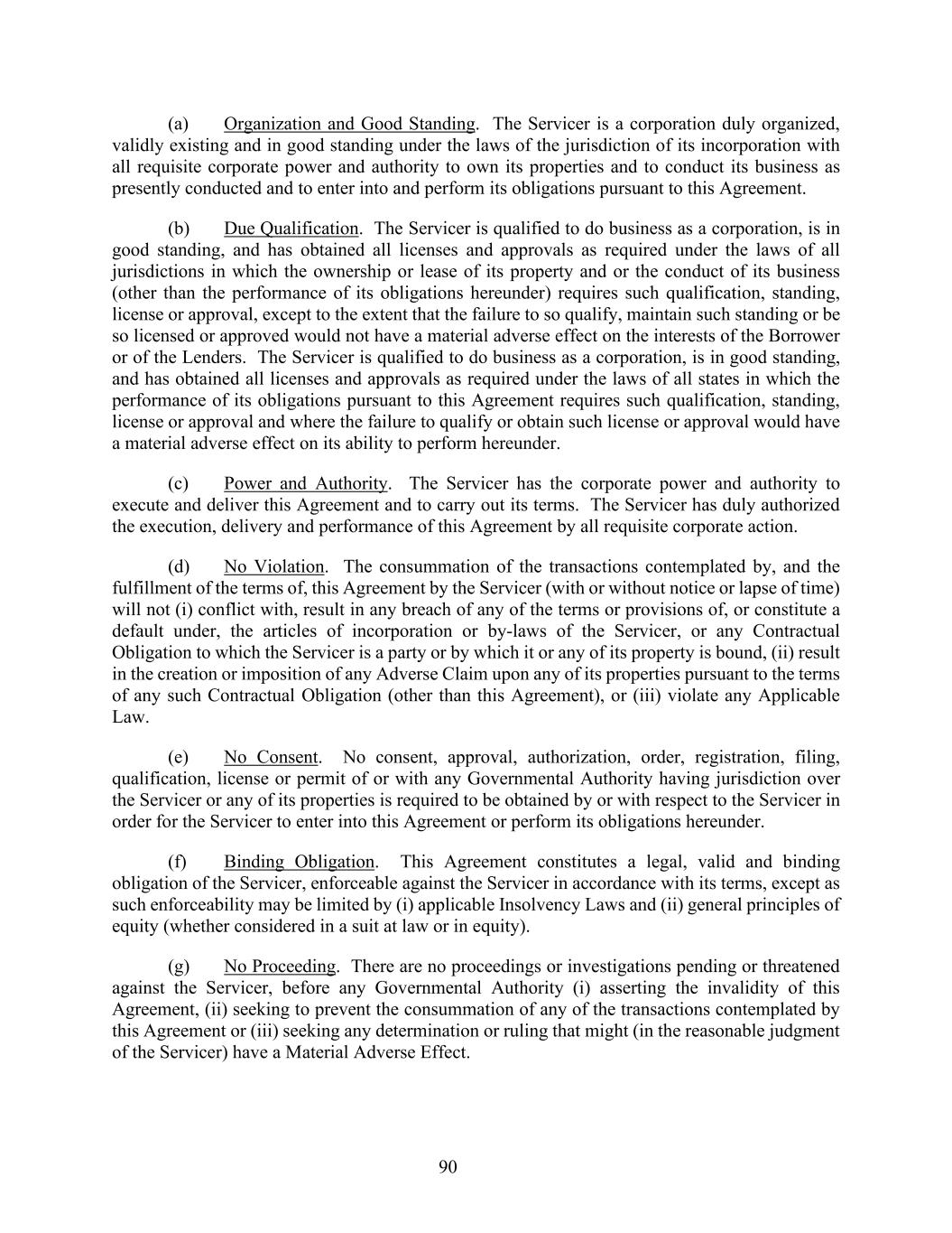 90 (a) Organization and Good Standing. The Servicer is a corporation duly organized, validly existing and in good standing under the laws of the jurisdiction of its incorporation with all requisite corporate power and authority to own its properties and to conduct its business as presently conducted and to enter into and perform its obligations pursuant to this Agreement. (b) Due Qualification. The Servicer is qualified to do business as a corporation, is in good standing, and has obtained all licenses and approvals as required under the laws of all jurisdictions in which the ownership or lease of its property and or the conduct of its business (other than the performance of its obligations hereunder) requires such qualification, standing, license or approval, except to the extent that the failure to so qualify, maintain such standing or be so licensed or approved would not have a material adverse effect on the interests of the Borrower or of the Lenders. The Servicer is qualified to do business as a corporation, is in good standing, and has obtained all licenses and approvals as required under the laws of all states in which the performance of its obligations pursuant to this Agreement requires such qualification, standing, license or approval and where the failure to qualify or obtain such license or approval would have a material adverse effect on its ability to perform hereunder. (c) Power and Authority. The Servicer has the corporate power and authority to execute and deliver this Agreement and to carry out its terms. The Servicer has duly authorized the execution, delivery and performance of this Agreement by all requisite corporate action. (d) No Violation. The consummation of the transactions contemplated by, and the fulfillment of the terms of, this Agreement by the Servicer (with or without notice or lapse of time) will not (i) conflict with, result in any breach of any of the terms or provisions of, or constitute a default under, the articles of incorporation or by-laws of the Servicer, or any Contractual Obligation to which the Servicer is a party or by which it or any of its property is bound, (ii) result in the creation or imposition of any Adverse Claim upon any of its properties pursuant to the terms of any such Contractual Obligation (other than this Agreement), or (iii) violate any Applicable Law. (e) No Consent. No consent, approval, authorization, order, registration, filing, qualification, license or permit of or with any Governmental Authority having jurisdiction over the Servicer or any of its properties is required to be obtained by or with respect to the Servicer in order for the Servicer to enter into this Agreement or perform its obligations hereunder. (f) Binding Obligation. This Agreement constitutes a legal, valid and binding obligation of the Servicer, enforceable against the Servicer in accordance with its terms, except as such enforceability may be limited by (i) applicable Insolvency Laws and (ii) general principles of equity (whether considered in a suit at law or in equity). (g) No Proceeding. There are no proceedings or investigations pending or threatened against the Servicer, before any Governmental Authority (i) asserting the invalidity of this Agreement, (ii) seeking to prevent the consummation of any of the transactions contemplated by this Agreement or (iii) seeking any determination or ruling that might (in the reasonable judgment of the Servicer) have a Material Adverse Effect.