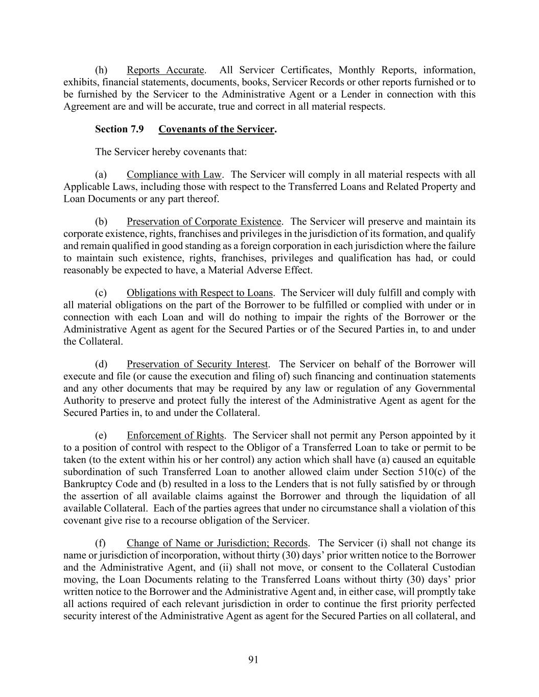 91 (h) Reports Accurate. All Servicer Certificates, Monthly Reports, information, exhibits, financial statements, documents, books, Servicer Records or other reports furnished or to be furnished by the Servicer to the Administrative Agent or a Lender in connection with this Agreement are and will be accurate, true and correct in all material respects. Section 7.9 Covenants of the Servicer. The Servicer hereby covenants that: (a) Compliance with Law. The Servicer will comply in all material respects with all Applicable Laws, including those with respect to the Transferred Loans and Related Property and Loan Documents or any part thereof. (b) Preservation of Corporate Existence. The Servicer will preserve and maintain its corporate existence, rights, franchises and privileges in the jurisdiction of its formation, and qualify and remain qualified in good standing as a foreign corporation in each jurisdiction where the failure to maintain such existence, rights, franchises, privileges and qualification has had, or could reasonably be expected to have, a Material Adverse Effect. (c) Obligations with Respect to Loans. The Servicer will duly fulfill and comply with all material obligations on the part of the Borrower to be fulfilled or complied with under or in connection with each Loan and will do nothing to impair the rights of the Borrower or the Administrative Agent as agent for the Secured Parties or of the Secured Parties in, to and under the Collateral. (d) Preservation of Security Interest. The Servicer on behalf of the Borrower will execute and file (or cause the execution and filing of) such financing and continuation statements and any other documents that may be required by any law or regulation of any Governmental Authority to preserve and protect fully the interest of the Administrative Agent as agent for the Secured Parties in, to and under the Collateral. (e) Enforcement of Rights. The Servicer shall not permit any Person appointed by it to a position of control with respect to the Obligor of a Transferred Loan to take or permit to be taken (to the extent within his or her control) any action which shall have (a) caused an equitable subordination of such Transferred Loan to another allowed claim under Section 510(c) of the Bankruptcy Code and (b) resulted in a loss to the Lenders that is not fully satisfied by or through the assertion of all available claims against the Borrower and through the liquidation of all available Collateral. Each of the parties agrees that under no circumstance shall a violation of this covenant give rise to a recourse obligation of the Servicer. (f) Change of Name or Jurisdiction; Records. The Servicer (i) shall not change its name or jurisdiction of incorporation, without thirty (30) days’ prior written notice to the Borrower and the Administrative Agent, and (ii) shall not move, or consent to the Collateral Custodian moving, the Loan Documents relating to the Transferred Loans without thirty (30) days’ prior written notice to the Borrower and the Administrative Agent and, in either case, will promptly take all actions required of each relevant jurisdiction in order to continue the first priority perfected security interest of the Administrative Agent as agent for the Secured Parties on all collateral, and