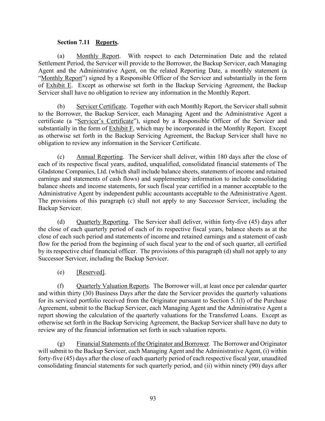 93 Section 7.11 Reports. (a) Monthly Report. With respect to each Determination Date and the related Settlement Period, the Servicer will provide to the Borrower, the Backup Servicer, each Managing Agent and the Administrative Agent, on the related Reporting Date, a monthly statement (a “Monthly Report”) signed by a Responsible Officer of the Servicer and substantially in the form of Exhibit E. Except as otherwise set forth in the Backup Servicing Agreement, the Backup Servicer shall have no obligation to review any information in the Monthly Report. (b) Servicer Certificate. Together with each Monthly Report, the Servicer shall submit to the Borrower, the Backup Servicer, each Managing Agent and the Administrative Agent a certificate (a “Servicer’s Certificate”), signed by a Responsible Officer of the Servicer and substantially in the form of Exhibit F, which may be incorporated in the Monthly Report. Except as otherwise set forth in the Backup Servicing Agreement, the Backup Servicer shall have no obligation to review any information in the Servicer Certificate. (c) Annual Reporting. The Servicer shall deliver, within 180 days after the close of each of its respective fiscal years, audited, unqualified, consolidated financial statements of The Gladstone Companies, Ltd. (which shall include balance sheets, statements of income and retained earnings and statements of cash flows) and supplementary information to include consolidating balance sheets and income statements, for such fiscal year certified in a manner acceptable to the Administrative Agent by independent public accountants acceptable to the Administrative Agent. The provisions of this paragraph (c) shall not apply to any Successor Servicer, including the Backup Servicer. (d) Quarterly Reporting. The Servicer shall deliver, within forty-five (45) days after the close of each quarterly period of each of its respective fiscal years, balance sheets as at the close of each such period and statements of income and retained earnings and a statement of cash flow for the period from the beginning of such fiscal year to the end of such quarter, all certified by its respective chief financial officer. The provisions of this paragraph (d) shall not apply to any Successor Servicer, including the Backup Servicer. (e) [Reserved]. (f) Quarterly Valuation Reports. The Borrower will, at least once per calendar quarter and within thirty (30) Business Days after the date the Servicer provides the quarterly valuations for its serviced portfolio received from the Originator pursuant to Section 5.1(l) of the Purchase Agreement, submit to the Backup Servicer, each Managing Agent and the Administrative Agent a report showing the calculation of the quarterly valuations for the Transferred Loans. Except as otherwise set forth in the Backup Servicing Agreement, the Backup Servicer shall have no duty to review any of the financial information set forth in such valuation reports. (g) Financial Statements of the Originator and Borrower. The Borrower and Originator will submit to the Backup Servicer, each Managing Agent and the Administrative Agent, (i) within forty-five (45) days after the close of each quarterly period of each respective fiscal year, unaudited consolidating financial statements for such quarterly period, and (ii) within ninety (90) days after