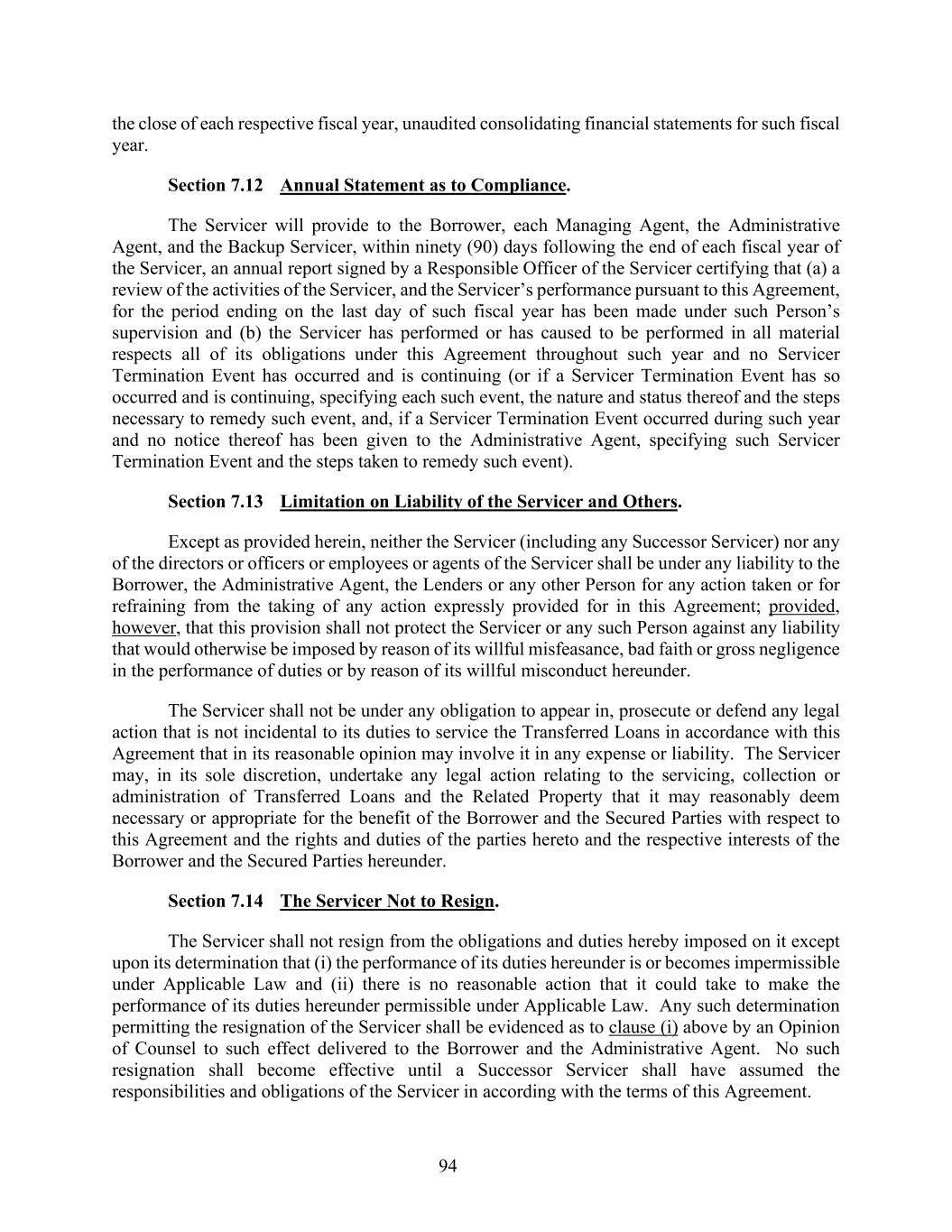 94 the close of each respective fiscal year, unaudited consolidating financial statements for such fiscal year. Section 7.12 Annual Statement as to Compliance. The Servicer will provide to the Borrower, each Managing Agent, the Administrative Agent, and the Backup Servicer, within ninety (90) days following the end of each fiscal year of the Servicer, an annual report signed by a Responsible Officer of the Servicer certifying that (a) a review of the activities of the Servicer, and the Servicer’s performance pursuant to this Agreement, for the period ending on the last day of such fiscal year has been made under such Person’s supervision and (b) the Servicer has performed or has caused to be performed in all material respects all of its obligations under this Agreement throughout such year and no Servicer Termination Event has occurred and is continuing (or if a Servicer Termination Event has so occurred and is continuing, specifying each such event, the nature and status thereof and the steps necessary to remedy such event, and, if a Servicer Termination Event occurred during such year and no notice thereof has been given to the Administrative Agent, specifying such Servicer Termination Event and the steps taken to remedy such event). Section 7.13 Limitation on Liability of the Servicer and Others. Except as provided herein, neither the Servicer (including any Successor Servicer) nor any of the directors or officers or employees or agents of the Servicer shall be under any liability to the Borrower, the Administrative Agent, the Lenders or any other Person for any action taken or for refraining from the taking of any action expressly provided for in this Agreement; provided, however, that this provision shall not protect the Servicer or any such Person against any liability that would otherwise be imposed by reason of its willful misfeasance, bad faith or gross negligence in the performance of duties or by reason of its willful misconduct hereunder. The Servicer shall not be under any obligation to appear in, prosecute or defend any legal action that is not incidental to its duties to service the Transferred Loans in accordance with this Agreement that in its reasonable opinion may involve it in any expense or liability. The Servicer may, in its sole discretion, undertake any legal action relating to the servicing, collection or administration of Transferred Loans and the Related Property that it may reasonably deem necessary or appropriate for the benefit of the Borrower and the Secured Parties with respect to this Agreement and the rights and duties of the parties hereto and the respective interests of the Borrower and the Secured Parties hereunder. Section 7.14 The Servicer Not to Resign. The Servicer shall not resign from the obligations and duties hereby imposed on it except upon its determination that (i) the performance of its duties hereunder is or becomes impermissible under Applicable Law and (ii) there is no reasonable action that it could take to make the performance of its duties hereunder permissible under Applicable Law. Any such determination permitting the resignation of the Servicer shall be evidenced as to clause (i) above by an Opinion of Counsel to such effect delivered to the Borrower and the Administrative Agent. No such resignation shall become effective until a Successor Servicer shall have assumed the responsibilities and obligations of the Servicer in according with the terms of this Agreement.