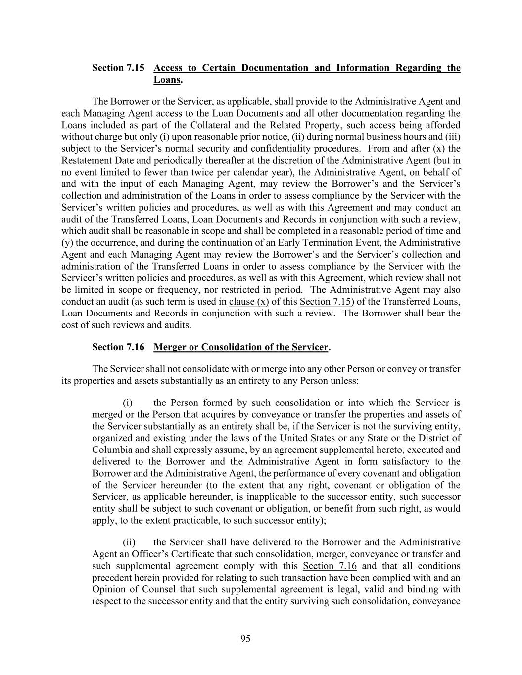 95 Section 7.15 Access to Certain Documentation and Information Regarding the Loans. The Borrower or the Servicer, as applicable, shall provide to the Administrative Agent and each Managing Agent access to the Loan Documents and all other documentation regarding the Loans included as part of the Collateral and the Related Property, such access being afforded without charge but only (i) upon reasonable prior notice, (ii) during normal business hours and (iii) subject to the Servicer’s normal security and confidentiality procedures. From and after (x) the Restatement Date and periodically thereafter at the discretion of the Administrative Agent (but in no event limited to fewer than twice per calendar year), the Administrative Agent, on behalf of and with the input of each Managing Agent, may review the Borrower’s and the Servicer’s collection and administration of the Loans in order to assess compliance by the Servicer with the Servicer’s written policies and procedures, as well as with this Agreement and may conduct an audit of the Transferred Loans, Loan Documents and Records in conjunction with such a review, which audit shall be reasonable in scope and shall be completed in a reasonable period of time and (y) the occurrence, and during the continuation of an Early Termination Event, the Administrative Agent and each Managing Agent may review the Borrower’s and the Servicer’s collection and administration of the Transferred Loans in order to assess compliance by the Servicer with the Servicer’s written policies and procedures, as well as with this Agreement, which review shall not be limited in scope or frequency, nor restricted in period. The Administrative Agent may also conduct an audit (as such term is used in clause (x) of this Section 7.15) of the Transferred Loans, Loan Documents and Records in conjunction with such a review. The Borrower shall bear the cost of such reviews and audits. Section 7.16 Merger or Consolidation of the Servicer. The Servicer shall not consolidate with or merge into any other Person or convey or transfer its properties and assets substantially as an entirety to any Person unless: (i) the Person formed by such consolidation or into which the Servicer is merged or the Person that acquires by conveyance or transfer the properties and assets of the Servicer substantially as an entirety shall be, if the Servicer is not the surviving entity, organized and existing under the laws of the United States or any State or the District of Columbia and shall expressly assume, by an agreement supplemental hereto, executed and delivered to the Borrower and the Administrative Agent in form satisfactory to the Borrower and the Administrative Agent, the performance of every covenant and obligation of the Servicer hereunder (to the extent that any right, covenant or obligation of the Servicer, as applicable hereunder, is inapplicable to the successor entity, such successor entity shall be subject to such covenant or obligation, or benefit from such right, as would apply, to the extent practicable, to such successor entity); (ii) the Servicer shall have delivered to the Borrower and the Administrative Agent an Officer’s Certificate that such consolidation, merger, conveyance or transfer and such supplemental agreement comply with this Section 7.16 and that all conditions precedent herein provided for relating to such transaction have been complied with and an Opinion of Counsel that such supplemental agreement is legal, valid and binding with respect to the successor entity and that the entity surviving such consolidation, conveyance