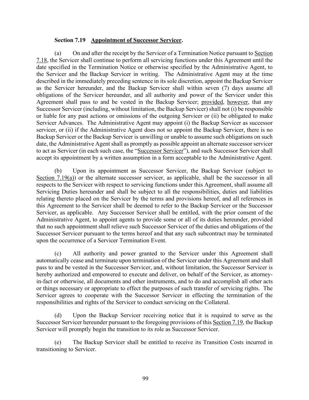 99 Section 7.19 Appointment of Successor Servicer. (a) On and after the receipt by the Servicer of a Termination Notice pursuant to Section 7.18, the Servicer shall continue to perform all servicing functions under this Agreement until the date specified in the Termination Notice or otherwise specified by the Administrative Agent, to the Servicer and the Backup Servicer in writing. The Administrative Agent may at the time described in the immediately preceding sentence in its sole discretion, appoint the Backup Servicer as the Servicer hereunder, and the Backup Servicer shall within seven (7) days assume all obligations of the Servicer hereunder, and all authority and power of the Servicer under this Agreement shall pass to and be vested in the Backup Servicer; provided, however, that any Successor Servicer (including, without limitation, the Backup Servicer) shall not (i) be responsible or liable for any past actions or omissions of the outgoing Servicer or (ii) be obligated to make Servicer Advances. The Administrative Agent may appoint (i) the Backup Servicer as successor servicer, or (ii) if the Administrative Agent does not so appoint the Backup Servicer, there is no Backup Servicer or the Backup Servicer is unwilling or unable to assume such obligations on such date, the Administrative Agent shall as promptly as possible appoint an alternate successor servicer to act as Servicer (in each such case, the “Successor Servicer”), and such Successor Servicer shall accept its appointment by a written assumption in a form acceptable to the Administrative Agent. (b) Upon its appointment as Successor Servicer, the Backup Servicer (subject to Section 7.19(a)) or the alternate successor servicer, as applicable, shall be the successor in all respects to the Servicer with respect to servicing functions under this Agreement, shall assume all Servicing Duties hereunder and shall be subject to all the responsibilities, duties and liabilities relating thereto placed on the Servicer by the terms and provisions hereof, and all references in this Agreement to the Servicer shall be deemed to refer to the Backup Servicer or the Successor Servicer, as applicable. Any Successor Servicer shall be entitled, with the prior consent of the Administrative Agent, to appoint agents to provide some or all of its duties hereunder, provided that no such appointment shall relieve such Successor Servicer of the duties and obligations of the Successor Servicer pursuant to the terms hereof and that any such subcontract may be terminated upon the occurrence of a Servicer Termination Event. (c) All authority and power granted to the Servicer under this Agreement shall automatically cease and terminate upon termination of the Servicer under this Agreement and shall pass to and be vested in the Successor Servicer, and, without limitation, the Successor Servicer is hereby authorized and empowered to execute and deliver, on behalf of the Servicer, as attorney- in-fact or otherwise, all documents and other instruments, and to do and accomplish all other acts or things necessary or appropriate to effect the purposes of such transfer of servicing rights. The Servicer agrees to cooperate with the Successor Servicer in effecting the termination of the responsibilities and rights of the Servicer to conduct servicing on the Collateral. (d) Upon the Backup Servicer receiving notice that it is required to serve as the Successor Servicer hereunder pursuant to the foregoing provisions of this Section 7.19, the Backup Servicer will promptly begin the transition to its role as Successor Servicer. (e) The Backup Servicer shall be entitled to receive its Transition Costs incurred in transitioning to Servicer.