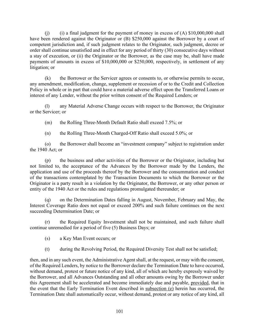 101 (j) (i) a final judgment for the payment of money in excess of (A) $10,000,000 shall have been rendered against the Originator or (B) $250,000 against the Borrower by a court of competent jurisdiction and, if such judgment relates to the Originator, such judgment, decree or order shall continue unsatisfied and in effect for any period of thirty (30) consecutive days without a stay of execution, or (ii) the Originator or the Borrower, as the case may be, shall have made payments of amounts in excess of $10,000,000 or $250,000, respectively, in settlement of any litigation; or (k) the Borrower or the Servicer agrees or consents to, or otherwise permits to occur, any amendment, modification, change, supplement or recession of or to the Credit and Collection Policy in whole or in part that could have a material adverse effect upon the Transferred Loans or interest of any Lender, without the prior written consent of the Required Lenders; or (l) any Material Adverse Change occurs with respect to the Borrower, the Originator or the Servicer; or (m) the Rolling Three-Month Default Ratio shall exceed 7.5%; or (n) the Rolling Three-Month Charged-Off Ratio shall exceed 5.0%; or (o) the Borrower shall become an “investment company” subject to registration under the 1940 Act; or (p) the business and other activities of the Borrower or the Originator, including but not limited to, the acceptance of the Advances by the Borrower made by the Lenders, the application and use of the proceeds thereof by the Borrower and the consummation and conduct of the transactions contemplated by the Transaction Documents to which the Borrower or the Originator is a party result in a violation by the Originator, the Borrower, or any other person or entity of the 1940 Act or the rules and regulations promulgated thereunder; or (q) on the Determination Dates falling in August, November, February and May, the Interest Coverage Ratio does not equal or exceed 200% and such failure continues on the next succeeding Determination Date; or (r) the Required Equity Investment shall not be maintained, and such failure shall continue unremedied for a period of five (5) Business Days; or (s) a Key Man Event occurs; or (t) during the Revolving Period, the Required Diversity Test shall not be satisfied; then, and in any such event, the Administrative Agent shall, at the request, or may with the consent, of the Required Lenders, by notice to the Borrower declare the Termination Date to have occurred, without demand, protest or future notice of any kind, all of which are hereby expressly waived by the Borrower, and all Advances Outstanding and all other amounts owing by the Borrower under this Agreement shall be accelerated and become immediately due and payable, provided, that in the event that the Early Termination Event described in subsection (e) herein has occurred, the Termination Date shall automatically occur, without demand, protest or any notice of any kind, all
