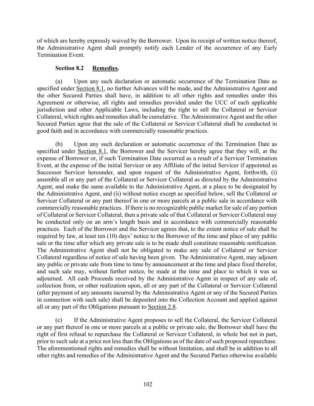 102 of which are hereby expressly waived by the Borrower. Upon its receipt of written notice thereof, the Administrative Agent shall promptly notify each Lender of the occurrence of any Early Termination Event. Section 8.2 Remedies. (a) Upon any such declaration or automatic occurrence of the Termination Date as specified under Section 8.1, no further Advances will be made, and the Administrative Agent and the other Secured Parties shall have, in addition to all other rights and remedies under this Agreement or otherwise, all rights and remedies provided under the UCC of each applicable jurisdiction and other Applicable Laws, including the right to sell the Collateral or Servicer Collateral, which rights and remedies shall be cumulative. The Administrative Agent and the other Secured Parties agree that the sale of the Collateral or Servicer Collateral shall be conducted in good faith and in accordance with commercially reasonable practices. (b) Upon any such declaration or automatic occurrence of the Termination Date as specified under Section 8.1, the Borrower and the Servicer hereby agree that they will, at the expense of Borrower or, if such Termination Date occurred as a result of a Servicer Termination Event, at the expense of the initial Servicer or any Affiliate of the initial Servicer if appointed as Successor Servicer hereunder, and upon request of the Administrative Agent, forthwith, (i) assemble all or any part of the Collateral or Servicer Collateral as directed by the Administrative Agent, and make the same available to the Administrative Agent, at a place to be designated by the Administrative Agent, and (ii) without notice except as specified below, sell the Collateral or Servicer Collateral or any part thereof in one or more parcels at a public sale in accordance with commercially reasonable practices. If there is no recognizable public market for sale of any portion of Collateral or Servicer Collateral, then a private sale of that Collateral or Servicer Collateral may be conducted only on an arm’s length basis and in accordance with commercially reasonable practices. Each of the Borrower and the Servicer agrees that, to the extent notice of sale shall be required by law, at least ten (10) days’ notice to the Borrower of the time and place of any public sale or the time after which any private sale is to be made shall constitute reasonable notification. The Administrative Agent shall not be obligated to make any sale of Collateral or Servicer Collateral regardless of notice of sale having been given. The Administrative Agent, may adjourn any public or private sale from time to time by announcement at the time and place fixed therefor, and such sale may, without further notice, be made at the time and place to which it was so adjourned. All cash Proceeds received by the Administrative Agent in respect of any sale of, collection from, or other realization upon, all or any part of the Collateral or Servicer Collateral (after payment of any amounts incurred by the Administrative Agent or any of the Secured Parties in connection with such sale) shall be deposited into the Collection Account and applied against all or any part of the Obligations pursuant to Section 2.8. (c) If the Administrative Agent proposes to sell the Collateral, the Servicer Collateral or any part thereof in one or more parcels at a public or private sale, the Borrower shall have the right of first refusal to repurchase the Collateral or Servicer Collateral, in whole but not in part, prior to such sale at a price not less than the Obligations as of the date of such proposed repurchase. The aforementioned rights and remedies shall be without limitation, and shall be in addition to all other rights and remedies of the Administrative Agent and the Secured Parties otherwise available