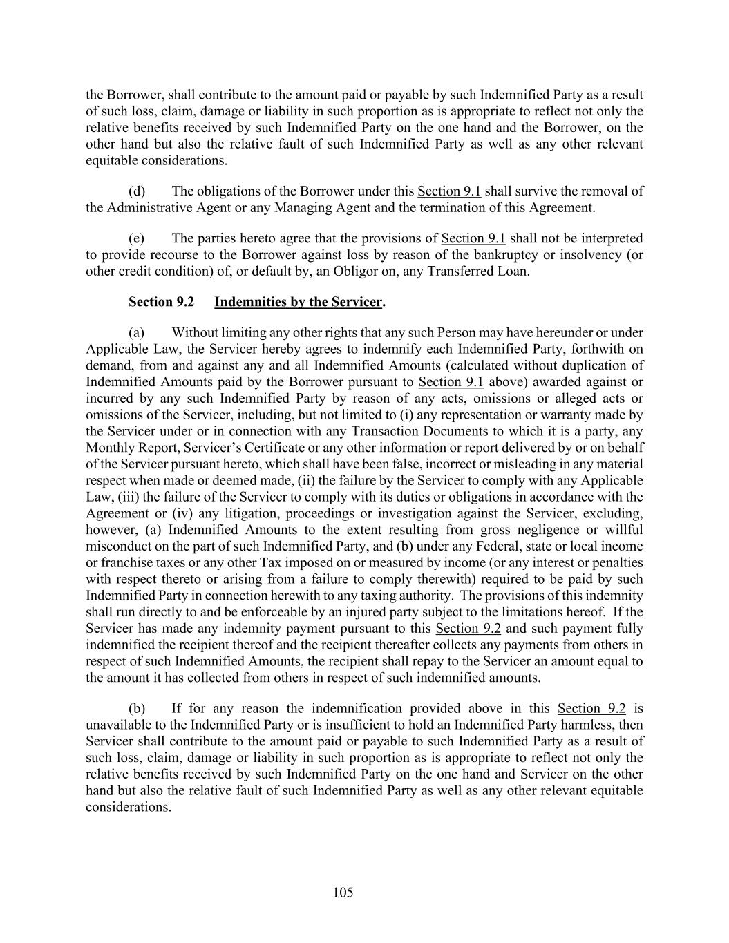 105 the Borrower, shall contribute to the amount paid or payable by such Indemnified Party as a result of such loss, claim, damage or liability in such proportion as is appropriate to reflect not only the relative benefits received by such Indemnified Party on the one hand and the Borrower, on the other hand but also the relative fault of such Indemnified Party as well as any other relevant equitable considerations. (d) The obligations of the Borrower under this Section 9.1 shall survive the removal of the Administrative Agent or any Managing Agent and the termination of this Agreement. (e) The parties hereto agree that the provisions of Section 9.1 shall not be interpreted to provide recourse to the Borrower against loss by reason of the bankruptcy or insolvency (or other credit condition) of, or default by, an Obligor on, any Transferred Loan. Section 9.2 Indemnities by the Servicer. (a) Without limiting any other rights that any such Person may have hereunder or under Applicable Law, the Servicer hereby agrees to indemnify each Indemnified Party, forthwith on demand, from and against any and all Indemnified Amounts (calculated without duplication of Indemnified Amounts paid by the Borrower pursuant to Section 9.1 above) awarded against or incurred by any such Indemnified Party by reason of any acts, omissions or alleged acts or omissions of the Servicer, including, but not limited to (i) any representation or warranty made by the Servicer under or in connection with any Transaction Documents to which it is a party, any Monthly Report, Servicer’s Certificate or any other information or report delivered by or on behalf of the Servicer pursuant hereto, which shall have been false, incorrect or misleading in any material respect when made or deemed made, (ii) the failure by the Servicer to comply with any Applicable Law, (iii) the failure of the Servicer to comply with its duties or obligations in accordance with the Agreement or (iv) any litigation, proceedings or investigation against the Servicer, excluding, however, (a) Indemnified Amounts to the extent resulting from gross negligence or willful misconduct on the part of such Indemnified Party, and (b) under any Federal, state or local income or franchise taxes or any other Tax imposed on or measured by income (or any interest or penalties with respect thereto or arising from a failure to comply therewith) required to be paid by such Indemnified Party in connection herewith to any taxing authority. The provisions of this indemnity shall run directly to and be enforceable by an injured party subject to the limitations hereof. If the Servicer has made any indemnity payment pursuant to this Section 9.2 and such payment fully indemnified the recipient thereof and the recipient thereafter collects any payments from others in respect of such Indemnified Amounts, the recipient shall repay to the Servicer an amount equal to the amount it has collected from others in respect of such indemnified amounts. (b) If for any reason the indemnification provided above in this Section 9.2 is unavailable to the Indemnified Party or is insufficient to hold an Indemnified Party harmless, then Servicer shall contribute to the amount paid or payable to such Indemnified Party as a result of such loss, claim, damage or liability in such proportion as is appropriate to reflect not only the relative benefits received by such Indemnified Party on the one hand and Servicer on the other hand but also the relative fault of such Indemnified Party as well as any other relevant equitable considerations.