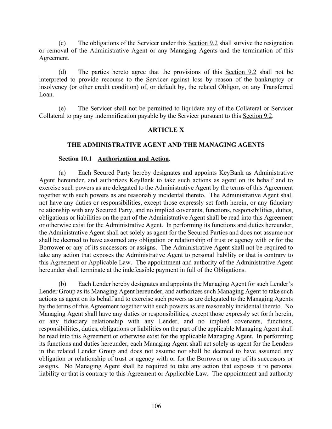 106 (c) The obligations of the Servicer under this Section 9.2 shall survive the resignation or removal of the Administrative Agent or any Managing Agents and the termination of this Agreement. (d) The parties hereto agree that the provisions of this Section 9.2 shall not be interpreted to provide recourse to the Servicer against loss by reason of the bankruptcy or insolvency (or other credit condition) of, or default by, the related Obligor, on any Transferred Loan. (e) The Servicer shall not be permitted to liquidate any of the Collateral or Servicer Collateral to pay any indemnification payable by the Servicer pursuant to this Section 9.2. ARTICLE X THE ADMINISTRATIVE AGENT AND THE MANAGING AGENTS Section 10.1 Authorization and Action. (a) Each Secured Party hereby designates and appoints KeyBank as Administrative Agent hereunder, and authorizes KeyBank to take such actions as agent on its behalf and to exercise such powers as are delegated to the Administrative Agent by the terms of this Agreement together with such powers as are reasonably incidental thereto. The Administrative Agent shall not have any duties or responsibilities, except those expressly set forth herein, or any fiduciary relationship with any Secured Party, and no implied covenants, functions, responsibilities, duties, obligations or liabilities on the part of the Administrative Agent shall be read into this Agreement or otherwise exist for the Administrative Agent. In performing its functions and duties hereunder, the Administrative Agent shall act solely as agent for the Secured Parties and does not assume nor shall be deemed to have assumed any obligation or relationship of trust or agency with or for the Borrower or any of its successors or assigns. The Administrative Agent shall not be required to take any action that exposes the Administrative Agent to personal liability or that is contrary to this Agreement or Applicable Law. The appointment and authority of the Administrative Agent hereunder shall terminate at the indefeasible payment in full of the Obligations. (b) Each Lender hereby designates and appoints the Managing Agent for such Lender’s Lender Group as its Managing Agent hereunder, and authorizes such Managing Agent to take such actions as agent on its behalf and to exercise such powers as are delegated to the Managing Agents by the terms of this Agreement together with such powers as are reasonably incidental thereto. No Managing Agent shall have any duties or responsibilities, except those expressly set forth herein, or any fiduciary relationship with any Lender, and no implied covenants, functions, responsibilities, duties, obligations or liabilities on the part of the applicable Managing Agent shall be read into this Agreement or otherwise exist for the applicable Managing Agent. In performing its functions and duties hereunder, each Managing Agent shall act solely as agent for the Lenders in the related Lender Group and does not assume nor shall be deemed to have assumed any obligation or relationship of trust or agency with or for the Borrower or any of its successors or assigns. No Managing Agent shall be required to take any action that exposes it to personal liability or that is contrary to this Agreement or Applicable Law. The appointment and authority