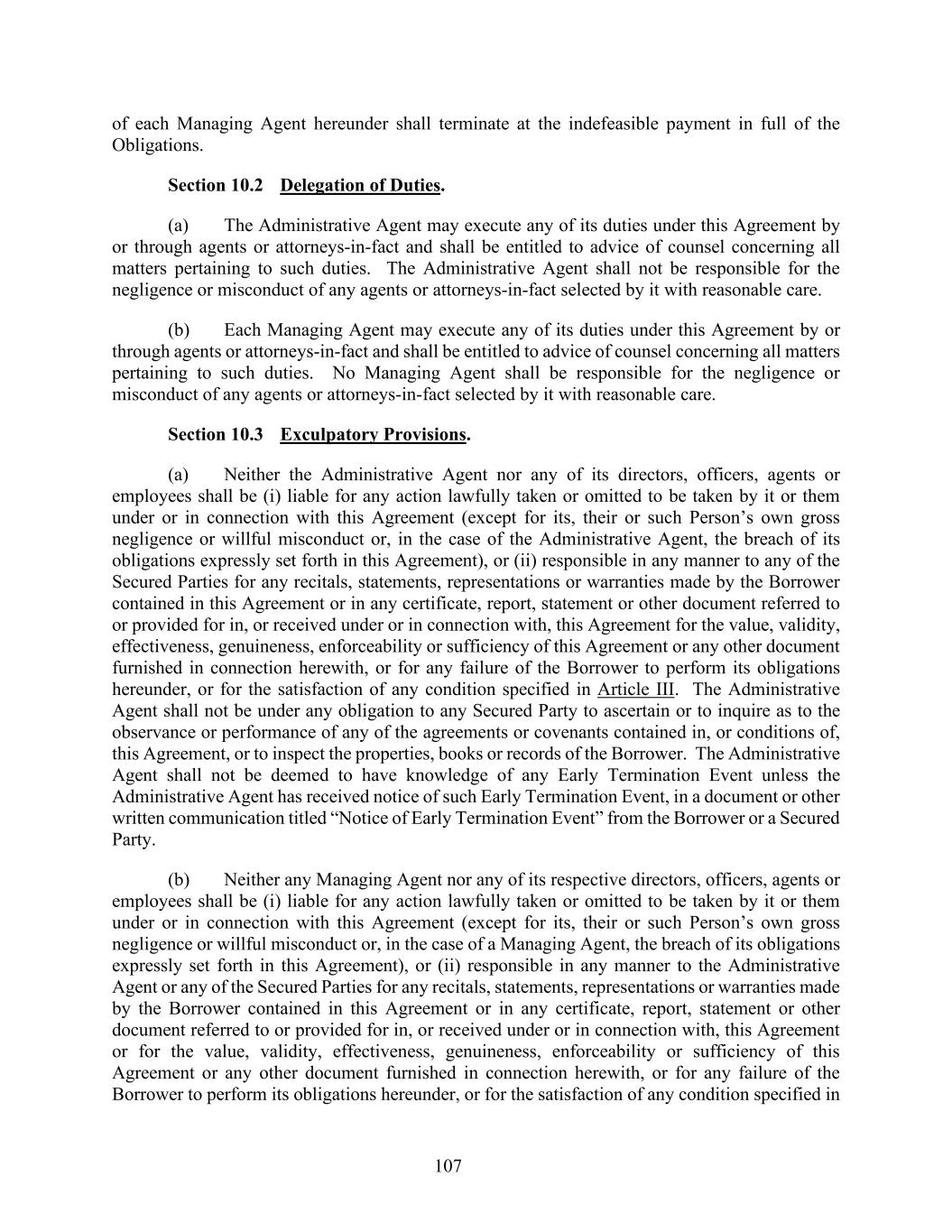 107 of each Managing Agent hereunder shall terminate at the indefeasible payment in full of the Obligations. Section 10.2 Delegation of Duties. (a) The Administrative Agent may execute any of its duties under this Agreement by or through agents or attorneys-in-fact and shall be entitled to advice of counsel concerning all matters pertaining to such duties. The Administrative Agent shall not be responsible for the negligence or misconduct of any agents or attorneys-in-fact selected by it with reasonable care. (b) Each Managing Agent may execute any of its duties under this Agreement by or through agents or attorneys-in-fact and shall be entitled to advice of counsel concerning all matters pertaining to such duties. No Managing Agent shall be responsible for the negligence or misconduct of any agents or attorneys-in-fact selected by it with reasonable care. Section 10.3 Exculpatory Provisions. (a) Neither the Administrative Agent nor any of its directors, officers, agents or employees shall be (i) liable for any action lawfully taken or omitted to be taken by it or them under or in connection with this Agreement (except for its, their or such Person’s own gross negligence or willful misconduct or, in the case of the Administrative Agent, the breach of its obligations expressly set forth in this Agreement), or (ii) responsible in any manner to any of the Secured Parties for any recitals, statements, representations or warranties made by the Borrower contained in this Agreement or in any certificate, report, statement or other document referred to or provided for in, or received under or in connection with, this Agreement for the value, validity, effectiveness, genuineness, enforceability or sufficiency of this Agreement or any other document furnished in connection herewith, or for any failure of the Borrower to perform its obligations hereunder, or for the satisfaction of any condition specified in Article III. The Administrative Agent shall not be under any obligation to any Secured Party to ascertain or to inquire as to the observance or performance of any of the agreements or covenants contained in, or conditions of, this Agreement, or to inspect the properties, books or records of the Borrower. The Administrative Agent shall not be deemed to have knowledge of any Early Termination Event unless the Administrative Agent has received notice of such Early Termination Event, in a document or other written communication titled “Notice of Early Termination Event” from the Borrower or a Secured Party. (b) Neither any Managing Agent nor any of its respective directors, officers, agents or employees shall be (i) liable for any action lawfully taken or omitted to be taken by it or them under or in connection with this Agreement (except for its, their or such Person’s own gross negligence or willful misconduct or, in the case of a Managing Agent, the breach of its obligations expressly set forth in this Agreement), or (ii) responsible in any manner to the Administrative Agent or any of the Secured Parties for any recitals, statements, representations or warranties made by the Borrower contained in this Agreement or in any certificate, report, statement or other document referred to or provided for in, or received under or in connection with, this Agreement or for the value, validity, effectiveness, genuineness, enforceability or sufficiency of this Agreement or any other document furnished in connection herewith, or for any failure of the Borrower to perform its obligations hereunder, or for the satisfaction of any condition specified in