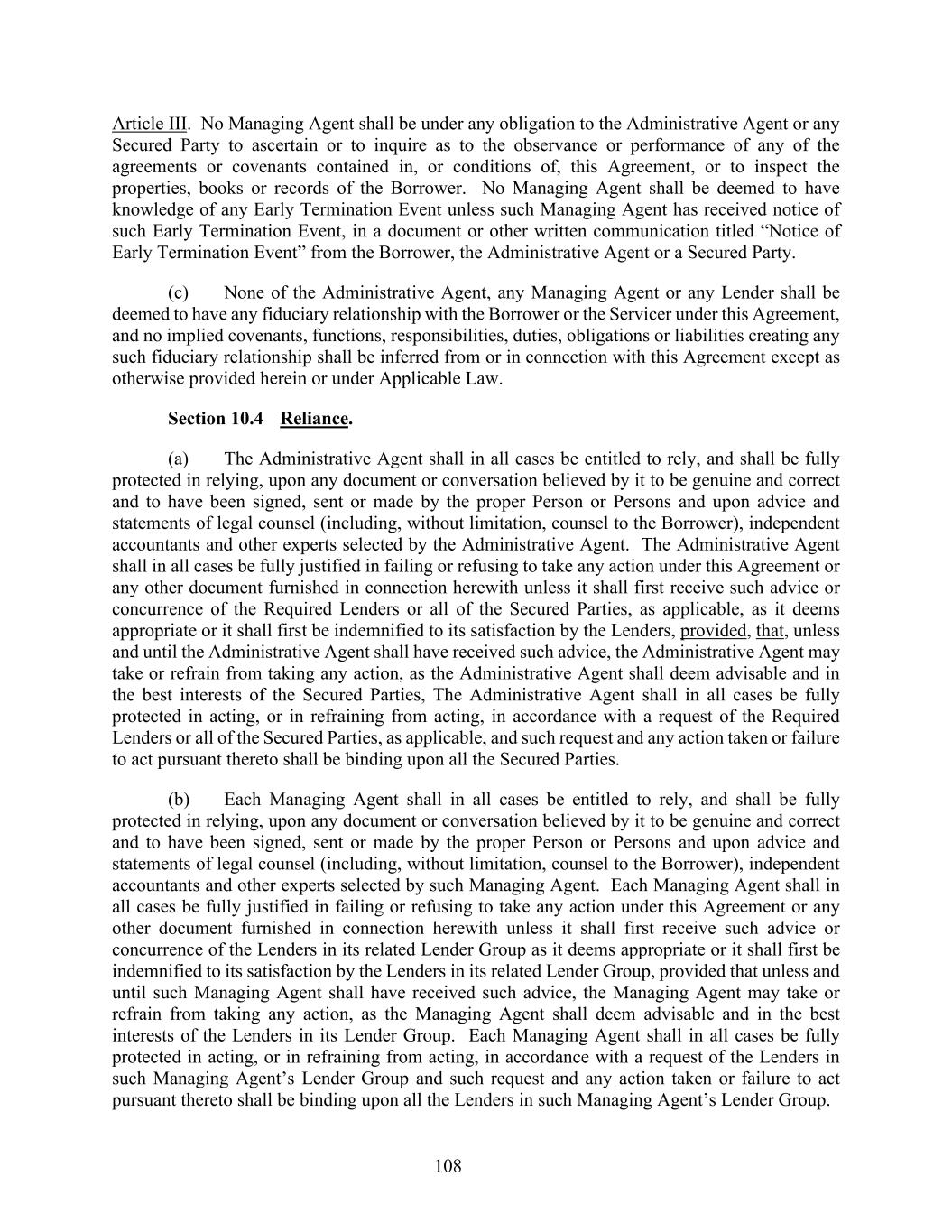 108 Article III. No Managing Agent shall be under any obligation to the Administrative Agent or any Secured Party to ascertain or to inquire as to the observance or performance of any of the agreements or covenants contained in, or conditions of, this Agreement, or to inspect the properties, books or records of the Borrower. No Managing Agent shall be deemed to have knowledge of any Early Termination Event unless such Managing Agent has received notice of such Early Termination Event, in a document or other written communication titled “Notice of Early Termination Event” from the Borrower, the Administrative Agent or a Secured Party. (c) None of the Administrative Agent, any Managing Agent or any Lender shall be deemed to have any fiduciary relationship with the Borrower or the Servicer under this Agreement, and no implied covenants, functions, responsibilities, duties, obligations or liabilities creating any such fiduciary relationship shall be inferred from or in connection with this Agreement except as otherwise provided herein or under Applicable Law. Section 10.4 Reliance. (a) The Administrative Agent shall in all cases be entitled to rely, and shall be fully protected in relying, upon any document or conversation believed by it to be genuine and correct and to have been signed, sent or made by the proper Person or Persons and upon advice and statements of legal counsel (including, without limitation, counsel to the Borrower), independent accountants and other experts selected by the Administrative Agent. The Administrative Agent shall in all cases be fully justified in failing or refusing to take any action under this Agreement or any other document furnished in connection herewith unless it shall first receive such advice or concurrence of the Required Lenders or all of the Secured Parties, as applicable, as it deems appropriate or it shall first be indemnified to its satisfaction by the Lenders, provided, that, unless and until the Administrative Agent shall have received such advice, the Administrative Agent may take or refrain from taking any action, as the Administrative Agent shall deem advisable and in the best interests of the Secured Parties, The Administrative Agent shall in all cases be fully protected in acting, or in refraining from acting, in accordance with a request of the Required Lenders or all of the Secured Parties, as applicable, and such request and any action taken or failure to act pursuant thereto shall be binding upon all the Secured Parties. (b) Each Managing Agent shall in all cases be entitled to rely, and shall be fully protected in relying, upon any document or conversation believed by it to be genuine and correct and to have been signed, sent or made by the proper Person or Persons and upon advice and statements of legal counsel (including, without limitation, counsel to the Borrower), independent accountants and other experts selected by such Managing Agent. Each Managing Agent shall in all cases be fully justified in failing or refusing to take any action under this Agreement or any other document furnished in connection herewith unless it shall first receive such advice or concurrence of the Lenders in its related Lender Group as it deems appropriate or it shall first be indemnified to its satisfaction by the Lenders in its related Lender Group, provided that unless and until such Managing Agent shall have received such advice, the Managing Agent may take or refrain from taking any action, as the Managing Agent shall deem advisable and in the best interests of the Lenders in its Lender Group. Each Managing Agent shall in all cases be fully protected in acting, or in refraining from acting, in accordance with a request of the Lenders in such Managing Agent’s Lender Group and such request and any action taken or failure to act pursuant thereto shall be binding upon all the Lenders in such Managing Agent’s Lender Group.