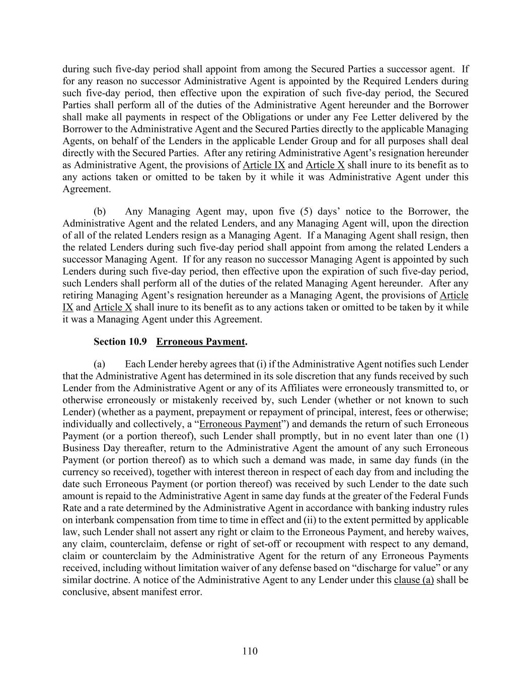 110 during such five-day period shall appoint from among the Secured Parties a successor agent. If for any reason no successor Administrative Agent is appointed by the Required Lenders during such five-day period, then effective upon the expiration of such five-day period, the Secured Parties shall perform all of the duties of the Administrative Agent hereunder and the Borrower shall make all payments in respect of the Obligations or under any Fee Letter delivered by the Borrower to the Administrative Agent and the Secured Parties directly to the applicable Managing Agents, on behalf of the Lenders in the applicable Lender Group and for all purposes shall deal directly with the Secured Parties. After any retiring Administrative Agent’s resignation hereunder as Administrative Agent, the provisions of Article IX and Article X shall inure to its benefit as to any actions taken or omitted to be taken by it while it was Administrative Agent under this Agreement. (b) Any Managing Agent may, upon five (5) days’ notice to the Borrower, the Administrative Agent and the related Lenders, and any Managing Agent will, upon the direction of all of the related Lenders resign as a Managing Agent. If a Managing Agent shall resign, then the related Lenders during such five-day period shall appoint from among the related Lenders a successor Managing Agent. If for any reason no successor Managing Agent is appointed by such Lenders during such five-day period, then effective upon the expiration of such five-day period, such Lenders shall perform all of the duties of the related Managing Agent hereunder. After any retiring Managing Agent’s resignation hereunder as a Managing Agent, the provisions of Article IX and Article X shall inure to its benefit as to any actions taken or omitted to be taken by it while it was a Managing Agent under this Agreement. Section 10.9 Erroneous Payment. (a) Each Lender hereby agrees that (i) if the Administrative Agent notifies such Lender that the Administrative Agent has determined in its sole discretion that any funds received by such Lender from the Administrative Agent or any of its Affiliates were erroneously transmitted to, or otherwise erroneously or mistakenly received by, such Lender (whether or not known to such Lender) (whether as a payment, prepayment or repayment of principal, interest, fees or otherwise; individually and collectively, a “Erroneous Payment”) and demands the return of such Erroneous Payment (or a portion thereof), such Lender shall promptly, but in no event later than one (1) Business Day thereafter, return to the Administrative Agent the amount of any such Erroneous Payment (or portion thereof) as to which such a demand was made, in same day funds (in the currency so received), together with interest thereon in respect of each day from and including the date such Erroneous Payment (or portion thereof) was received by such Lender to the date such amount is repaid to the Administrative Agent in same day funds at the greater of the Federal Funds Rate and a rate determined by the Administrative Agent in accordance with banking industry rules on interbank compensation from time to time in effect and (ii) to the extent permitted by applicable law, such Lender shall not assert any right or claim to the Erroneous Payment, and hereby waives, any claim, counterclaim, defense or right of set-off or recoupment with respect to any demand, claim or counterclaim by the Administrative Agent for the return of any Erroneous Payments received, including without limitation waiver of any defense based on “discharge for value” or any similar doctrine. A notice of the Administrative Agent to any Lender under this clause (a) shall be conclusive, absent manifest error.