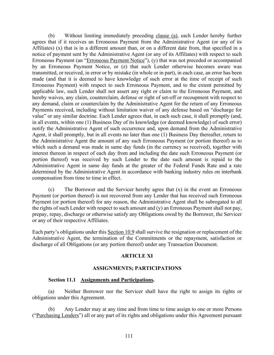111 (b) Without limiting immediately preceding clause (a), each Lender hereby further agrees that if it receives an Erroneous Payment from the Administrative Agent (or any of its Affiliates) (x) that is in a different amount than, or on a different date from, that specified in a notice of payment sent by the Administrative Agent (or any of its Affiliates) with respect to such Erroneous Payment (an “Erroneous Payment Notice”), (y) that was not preceded or accompanied by an Erroneous Payment Notice, or (z) that such Lender otherwise becomes aware was transmitted, or received, in error or by mistake (in whole or in part), in each case, an error has been made (and that it is deemed to have knowledge of such error at the time of receipt of such Erroneous Payment) with respect to such Erroneous Payment, and to the extent permitted by applicable law, such Lender shall not assert any right or claim to the Erroneous Payment, and hereby waives, any claim, counterclaim, defense or right of set-off or recoupment with respect to any demand, claim or counterclaim by the Administrative Agent for the return of any Erroneous Payments received, including without limitation waiver of any defense based on “discharge for value” or any similar doctrine. Each Lender agrees that, in each such case, it shall promptly (and, in all events, within one (1) Business Day of its knowledge (or deemed knowledge) of such error) notify the Administrative Agent of such occurrence and, upon demand from the Administrative Agent, it shall promptly, but in all events no later than one (1) Business Day thereafter, return to the Administrative Agent the amount of any such Erroneous Payment (or portion thereof) as to which such a demand was made in same day funds (in the currency so received), together with interest thereon in respect of each day from and including the date such Erroneous Payment (or portion thereof) was received by such Lender to the date such amount is repaid to the Administrative Agent in same day funds at the greater of the Federal Funds Rate and a rate determined by the Administrative Agent in accordance with banking industry rules on interbank compensation from time to time in effect. (c) The Borrower and the Servicer hereby agree that (x) in the event an Erroneous Payment (or portion thereof) is not recovered from any Lender that has received such Erroneous Payment (or portion thereof) for any reason, the Administrative Agent shall be subrogated to all the rights of such Lender with respect to such amount and (y) an Erroneous Payment shall not pay, prepay, repay, discharge or otherwise satisfy any Obligations owed by the Borrower, the Servicer or any of their respective Affiliates. Each party’s obligations under this Section 10.9 shall survive the resignation or replacement of the Administrative Agent, the termination of the Commitments or the repayment, satisfaction or discharge of all Obligations (or any portion thereof) under any Transaction Document. ARTICLE XI ASSIGNMENTS; PARTICIPATIONS Section 11.1 Assignments and Participations. (a) Neither Borrower nor the Servicer shall have the right to assign its rights or obligations under this Agreement. (b) Any Lender may at any time and from time to time assign to one or more Persons (“Purchasing Lenders”) all or any part of its rights and obligations under this Agreement pursuant