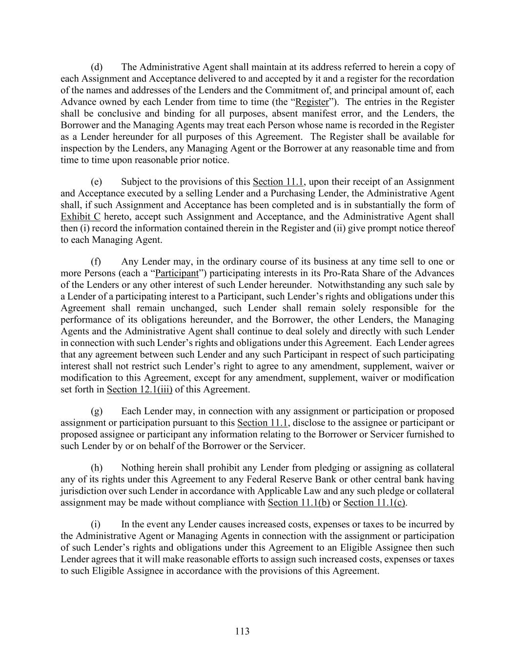 113 (d) The Administrative Agent shall maintain at its address referred to herein a copy of each Assignment and Acceptance delivered to and accepted by it and a register for the recordation of the names and addresses of the Lenders and the Commitment of, and principal amount of, each Advance owned by each Lender from time to time (the “Register”). The entries in the Register shall be conclusive and binding for all purposes, absent manifest error, and the Lenders, the Borrower and the Managing Agents may treat each Person whose name is recorded in the Register as a Lender hereunder for all purposes of this Agreement. The Register shall be available for inspection by the Lenders, any Managing Agent or the Borrower at any reasonable time and from time to time upon reasonable prior notice. (e) Subject to the provisions of this Section 11.1, upon their receipt of an Assignment and Acceptance executed by a selling Lender and a Purchasing Lender, the Administrative Agent shall, if such Assignment and Acceptance has been completed and is in substantially the form of Exhibit C hereto, accept such Assignment and Acceptance, and the Administrative Agent shall then (i) record the information contained therein in the Register and (ii) give prompt notice thereof to each Managing Agent. (f) Any Lender may, in the ordinary course of its business at any time sell to one or more Persons (each a “Participant”) participating interests in its Pro-Rata Share of the Advances of the Lenders or any other interest of such Lender hereunder. Notwithstanding any such sale by a Lender of a participating interest to a Participant, such Lender’s rights and obligations under this Agreement shall remain unchanged, such Lender shall remain solely responsible for the performance of its obligations hereunder, and the Borrower, the other Lenders, the Managing Agents and the Administrative Agent shall continue to deal solely and directly with such Lender in connection with such Lender’s rights and obligations under this Agreement. Each Lender agrees that any agreement between such Lender and any such Participant in respect of such participating interest shall not restrict such Lender’s right to agree to any amendment, supplement, waiver or modification to this Agreement, except for any amendment, supplement, waiver or modification set forth in Section 12.1(iii) of this Agreement. (g) Each Lender may, in connection with any assignment or participation or proposed assignment or participation pursuant to this Section 11.1, disclose to the assignee or participant or proposed assignee or participant any information relating to the Borrower or Servicer furnished to such Lender by or on behalf of the Borrower or the Servicer. (h) Nothing herein shall prohibit any Lender from pledging or assigning as collateral any of its rights under this Agreement to any Federal Reserve Bank or other central bank having jurisdiction over such Lender in accordance with Applicable Law and any such pledge or collateral assignment may be made without compliance with Section 11.1(b) or Section 11.1(c). (i) In the event any Lender causes increased costs, expenses or taxes to be incurred by the Administrative Agent or Managing Agents in connection with the assignment or participation of such Lender’s rights and obligations under this Agreement to an Eligible Assignee then such Lender agrees that it will make reasonable efforts to assign such increased costs, expenses or taxes to such Eligible Assignee in accordance with the provisions of this Agreement.
