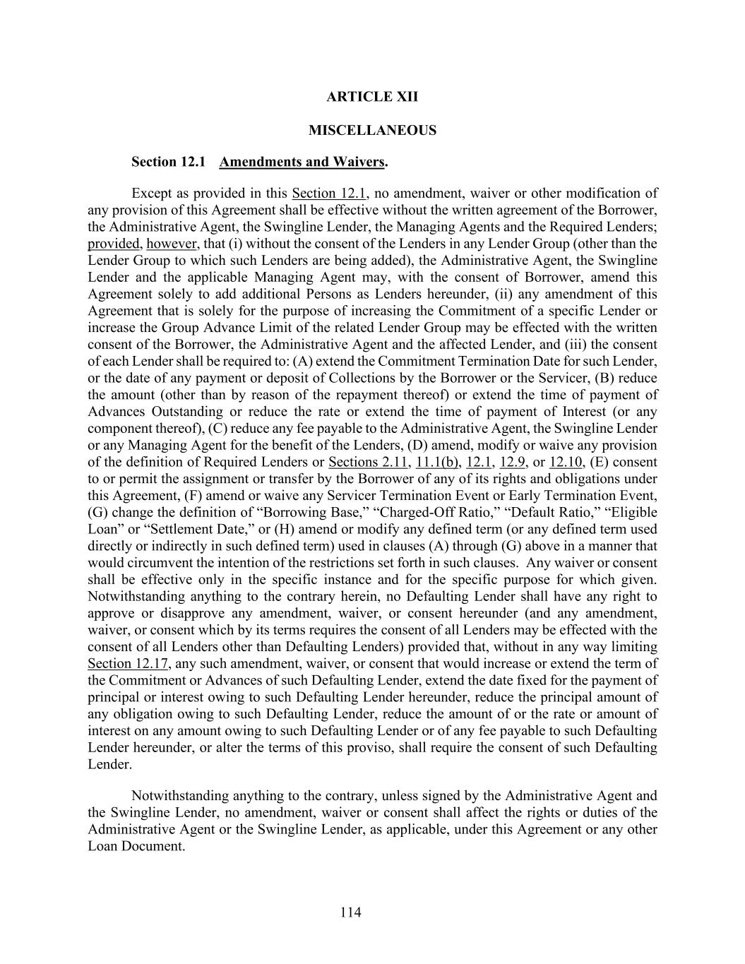 114 ARTICLE XII MISCELLANEOUS Section 12.1 Amendments and Waivers. Except as provided in this Section 12.1, no amendment, waiver or other modification of any provision of this Agreement shall be effective without the written agreement of the Borrower, the Administrative Agent, the Swingline Lender, the Managing Agents and the Required Lenders; provided, however, that (i) without the consent of the Lenders in any Lender Group (other than the Lender Group to which such Lenders are being added), the Administrative Agent, the Swingline Lender and the applicable Managing Agent may, with the consent of Borrower, amend this Agreement solely to add additional Persons as Lenders hereunder, (ii) any amendment of this Agreement that is solely for the purpose of increasing the Commitment of a specific Lender or increase the Group Advance Limit of the related Lender Group may be effected with the written consent of the Borrower, the Administrative Agent and the affected Lender, and (iii) the consent of each Lender shall be required to: (A) extend the Commitment Termination Date for such Lender, or the date of any payment or deposit of Collections by the Borrower or the Servicer, (B) reduce the amount (other than by reason of the repayment thereof) or extend the time of payment of Advances Outstanding or reduce the rate or extend the time of payment of Interest (or any component thereof), (C) reduce any fee payable to the Administrative Agent, the Swingline Lender or any Managing Agent for the benefit of the Lenders, (D) amend, modify or waive any provision of the definition of Required Lenders or Sections 2.11, 11.1(b), 12.1, 12.9, or 12.10, (E) consent to or permit the assignment or transfer by the Borrower of any of its rights and obligations under this Agreement, (F) amend or waive any Servicer Termination Event or Early Termination Event, (G) change the definition of “Borrowing Base,” “Charged-Off Ratio,” “Default Ratio,” “Eligible Loan” or “Settlement Date,” or (H) amend or modify any defined term (or any defined term used directly or indirectly in such defined term) used in clauses (A) through (G) above in a manner that would circumvent the intention of the restrictions set forth in such clauses. Any waiver or consent shall be effective only in the specific instance and for the specific purpose for which given. Notwithstanding anything to the contrary herein, no Defaulting Lender shall have any right to approve or disapprove any amendment, waiver, or consent hereunder (and any amendment, waiver, or consent which by its terms requires the consent of all Lenders may be effected with the consent of all Lenders other than Defaulting Lenders) provided that, without in any way limiting Section 12.17, any such amendment, waiver, or consent that would increase or extend the term of the Commitment or Advances of such Defaulting Lender, extend the date fixed for the payment of principal or interest owing to such Defaulting Lender hereunder, reduce the principal amount of any obligation owing to such Defaulting Lender, reduce the amount of or the rate or amount of interest on any amount owing to such Defaulting Lender or of any fee payable to such Defaulting Lender hereunder, or alter the terms of this proviso, shall require the consent of such Defaulting Lender. Notwithstanding anything to the contrary, unless signed by the Administrative Agent and the Swingline Lender, no amendment, waiver or consent shall affect the rights or duties of the Administrative Agent or the Swingline Lender, as applicable, under this Agreement or any other Loan Document.