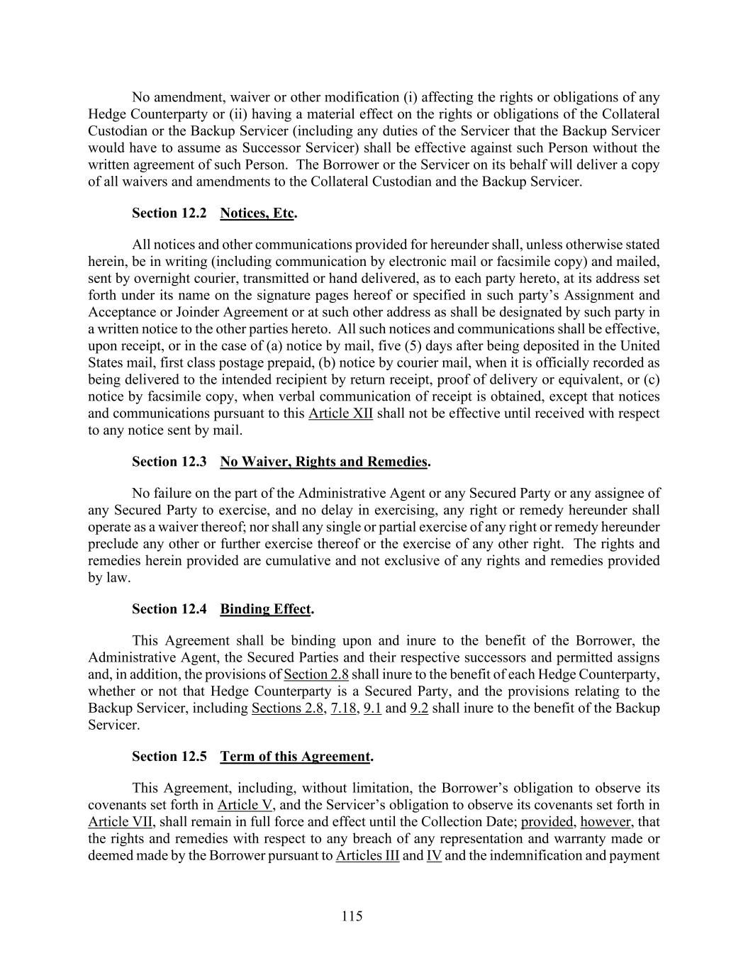 115 No amendment, waiver or other modification (i) affecting the rights or obligations of any Hedge Counterparty or (ii) having a material effect on the rights or obligations of the Collateral Custodian or the Backup Servicer (including any duties of the Servicer that the Backup Servicer would have to assume as Successor Servicer) shall be effective against such Person without the written agreement of such Person. The Borrower or the Servicer on its behalf will deliver a copy of all waivers and amendments to the Collateral Custodian and the Backup Servicer. Section 12.2 Notices, Etc. All notices and other communications provided for hereunder shall, unless otherwise stated herein, be in writing (including communication by electronic mail or facsimile copy) and mailed, sent by overnight courier, transmitted or hand delivered, as to each party hereto, at its address set forth under its name on the signature pages hereof or specified in such party’s Assignment and Acceptance or Joinder Agreement or at such other address as shall be designated by such party in a written notice to the other parties hereto. All such notices and communications shall be effective, upon receipt, or in the case of (a) notice by mail, five (5) days after being deposited in the United States mail, first class postage prepaid, (b) notice by courier mail, when it is officially recorded as being delivered to the intended recipient by return receipt, proof of delivery or equivalent, or (c) notice by facsimile copy, when verbal communication of receipt is obtained, except that notices and communications pursuant to this Article XII shall not be effective until received with respect to any notice sent by mail. Section 12.3 No Waiver, Rights and Remedies. No failure on the part of the Administrative Agent or any Secured Party or any assignee of any Secured Party to exercise, and no delay in exercising, any right or remedy hereunder shall operate as a waiver thereof; nor shall any single or partial exercise of any right or remedy hereunder preclude any other or further exercise thereof or the exercise of any other right. The rights and remedies herein provided are cumulative and not exclusive of any rights and remedies provided by law. Section 12.4 Binding Effect. This Agreement shall be binding upon and inure to the benefit of the Borrower, the Administrative Agent, the Secured Parties and their respective successors and permitted assigns and, in addition, the provisions of Section 2.8 shall inure to the benefit of each Hedge Counterparty, whether or not that Hedge Counterparty is a Secured Party, and the provisions relating to the Backup Servicer, including Sections 2.8, 7.18, 9.1 and 9.2 shall inure to the benefit of the Backup Servicer. Section 12.5 Term of this Agreement. This Agreement, including, without limitation, the Borrower’s obligation to observe its covenants set forth in Article V, and the Servicer’s obligation to observe its covenants set forth in Article VII, shall remain in full force and effect until the Collection Date; provided, however, that the rights and remedies with respect to any breach of any representation and warranty made or deemed made by the Borrower pursuant to Articles III and IV and the indemnification and payment