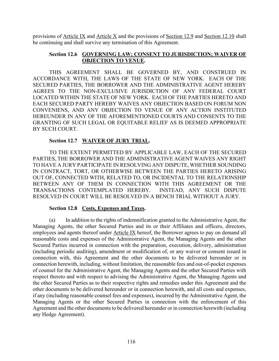 116 provisions of Article IX and Article X and the provisions of Section 12.9 and Section 12.10 shall be continuing and shall survive any termination of this Agreement. Section 12.6 GOVERNING LAW; CONSENT TO JURISDICTION; WAIVER OF OBJECTION TO VENUE. THIS AGREEMENT SHALL BE GOVERNED BY, AND CONSTRUED IN ACCORDANCE WITH, THE LAWS OF THE STATE OF NEW YORK. EACH OF THE SECURED PARTIES, THE BORROWER AND THE ADMINISTRATIVE AGENT HEREBY AGREES TO THE NON-EXCLUSIVE JURISDICTION OF ANY FEDERAL COURT LOCATED WITHIN THE STATE OF NEW YORK. EACH OF THE PARTIES HERETO AND EACH SECURED PARTY HEREBY WAIVES ANY OBJECTION BASED ON FORUM NON CONVENIENS, AND ANY OBJECTION TO VENUE OF ANY ACTION INSTITUTED HEREUNDER IN ANY OF THE AFOREMENTIONED COURTS AND CONSENTS TO THE GRANTING OF SUCH LEGAL OR EQUITABLE RELIEF AS IS DEEMED APPROPRIATE BY SUCH COURT. Section 12.7 WAIVER OF JURY TRIAL. TO THE EXTENT PERMITTED BY APPLICABLE LAW, EACH OF THE SECURED PARTIES, THE BORROWER AND THE ADMINISTRATIVE AGENT WAIVES ANY RIGHT TO HAVE A JURY PARTICIPATE IN RESOLVING ANY DISPUTE, WHETHER SOUNDING IN CONTRACT, TORT, OR OTHERWISE BETWEEN THE PARTIES HERETO ARISING OUT OF, CONNECTED WITH, RELATED TO, OR INCIDENTAL TO THE RELATIONSHIP BETWEEN ANY OF THEM IN CONNECTION WITH THIS AGREEMENT OR THE TRANSACTIONS CONTEMPLATED HEREBY. INSTEAD, ANY SUCH DISPUTE RESOLVED IN COURT WILL BE RESOLVED IN A BENCH TRIAL WITHOUT A JURY. Section 12.8 Costs, Expenses and Taxes. (a) In addition to the rights of indemnification granted to the Administrative Agent, the Managing Agents, the other Secured Parties and its or their Affiliates and officers, directors, employees and agents thereof under Article IX hereof, the Borrower agrees to pay on demand all reasonable costs and expenses of the Administrative Agent, the Managing Agents and the other Secured Parties incurred in connection with the preparation, execution, delivery, administration (including periodic auditing), amendment or modification of, or any waiver or consent issued in connection with, this Agreement and the other documents to be delivered hereunder or in connection herewith, including, without limitation, the reasonable fees and out-of-pocket expenses of counsel for the Administrative Agent, the Managing Agents and the other Secured Parties with respect thereto and with respect to advising the Administrative Agent, the Managing Agents and the other Secured Parties as to their respective rights and remedies under this Agreement and the other documents to be delivered hereunder or in connection herewith, and all costs and expenses, if any (including reasonable counsel fees and expenses), incurred by the Administrative Agent, the Managing Agents or the other Secured Parties in connection with the enforcement of this Agreement and the other documents to be delivered hereunder or in connection herewith (including any Hedge Agreement).