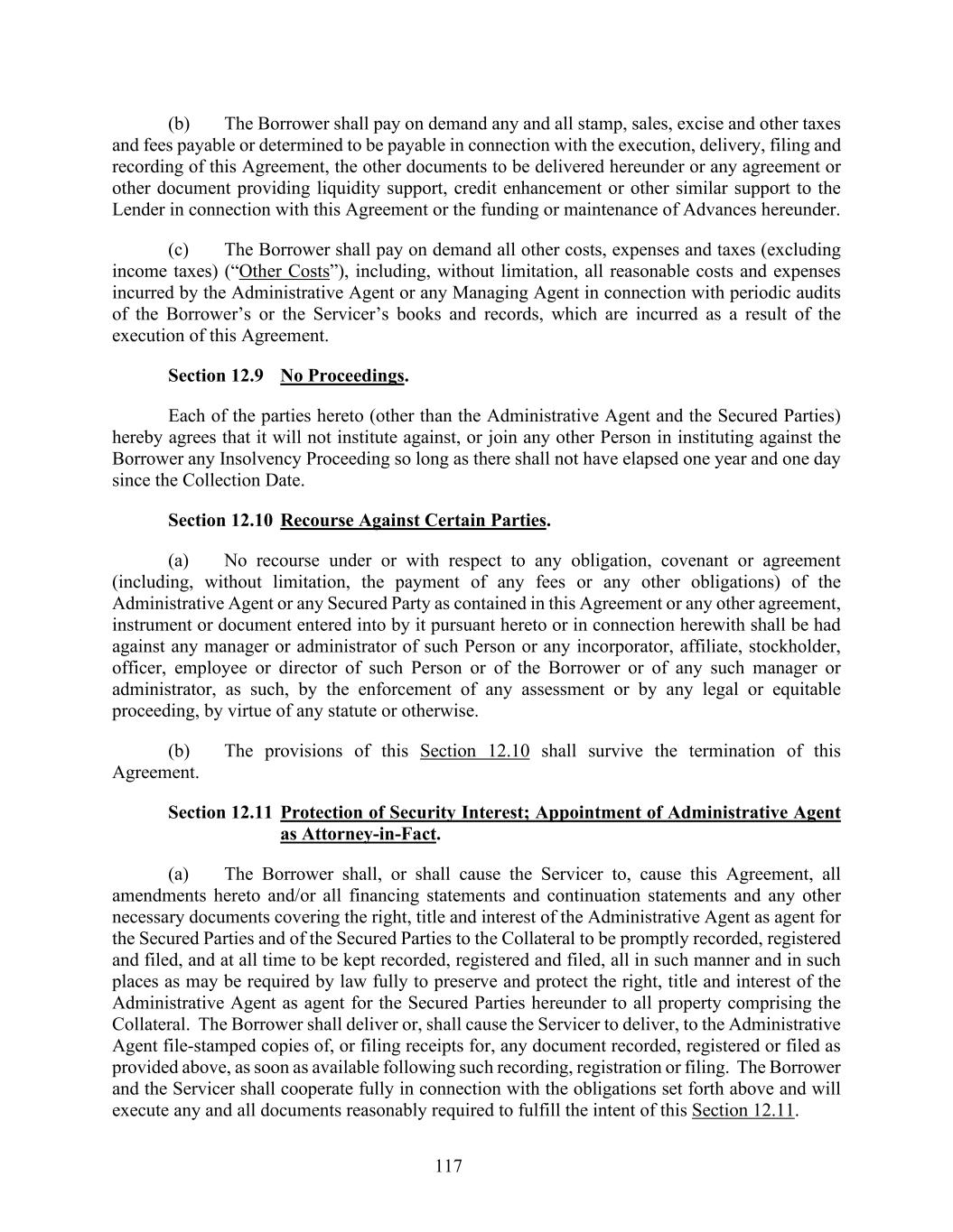 117 (b) The Borrower shall pay on demand any and all stamp, sales, excise and other taxes and fees payable or determined to be payable in connection with the execution, delivery, filing and recording of this Agreement, the other documents to be delivered hereunder or any agreement or other document providing liquidity support, credit enhancement or other similar support to the Lender in connection with this Agreement or the funding or maintenance of Advances hereunder. (c) The Borrower shall pay on demand all other costs, expenses and taxes (excluding income taxes) (“Other Costs”), including, without limitation, all reasonable costs and expenses incurred by the Administrative Agent or any Managing Agent in connection with periodic audits of the Borrower’s or the Servicer’s books and records, which are incurred as a result of the execution of this Agreement. Section 12.9 No Proceedings. Each of the parties hereto (other than the Administrative Agent and the Secured Parties) hereby agrees that it will not institute against, or join any other Person in instituting against the Borrower any Insolvency Proceeding so long as there shall not have elapsed one year and one day since the Collection Date. Section 12.10 Recourse Against Certain Parties. (a) No recourse under or with respect to any obligation, covenant or agreement (including, without limitation, the payment of any fees or any other obligations) of the Administrative Agent or any Secured Party as contained in this Agreement or any other agreement, instrument or document entered into by it pursuant hereto or in connection herewith shall be had against any manager or administrator of such Person or any incorporator, affiliate, stockholder, officer, employee or director of such Person or of the Borrower or of any such manager or administrator, as such, by the enforcement of any assessment or by any legal or equitable proceeding, by virtue of any statute or otherwise. (b) The provisions of this Section 12.10 shall survive the termination of this Agreement. Section 12.11 Protection of Security Interest; Appointment of Administrative Agent as Attorney-in-Fact. (a) The Borrower shall, or shall cause the Servicer to, cause this Agreement, all amendments hereto and/or all financing statements and continuation statements and any other necessary documents covering the right, title and interest of the Administrative Agent as agent for the Secured Parties and of the Secured Parties to the Collateral to be promptly recorded, registered and filed, and at all time to be kept recorded, registered and filed, all in such manner and in such places as may be required by law fully to preserve and protect the right, title and interest of the Administrative Agent as agent for the Secured Parties hereunder to all property comprising the Collateral. The Borrower shall deliver or, shall cause the Servicer to deliver, to the Administrative Agent file-stamped copies of, or filing receipts for, any document recorded, registered or filed as provided above, as soon as available following such recording, registration or filing. The Borrower and the Servicer shall cooperate fully in connection with the obligations set forth above and will execute any and all documents reasonably required to fulfill the intent of this Section 12.11.